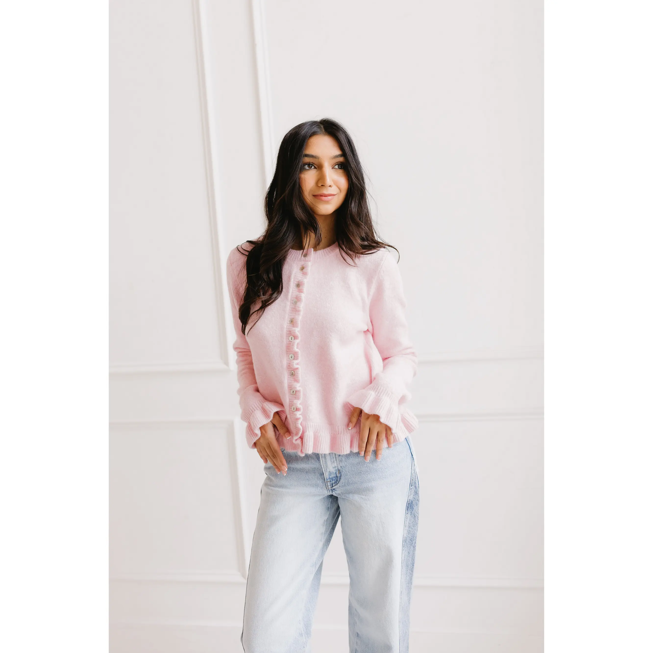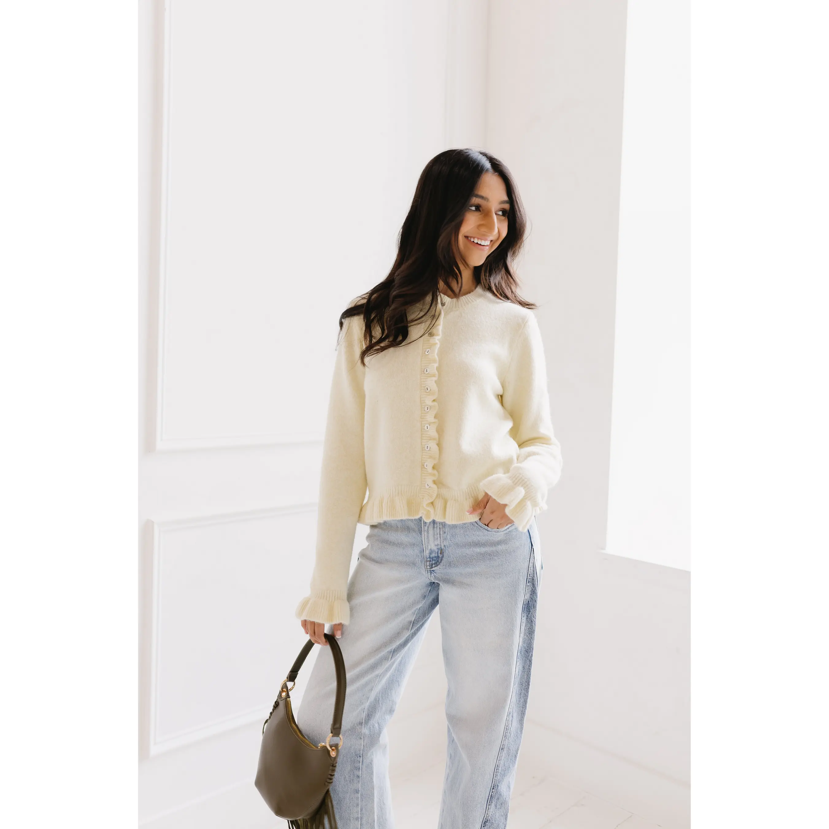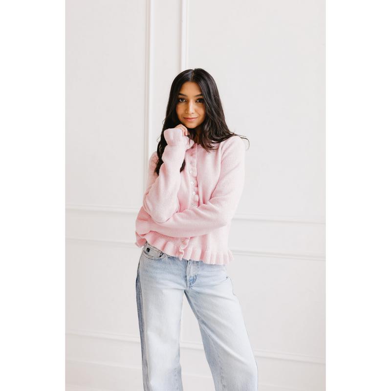 This has to be the cutest Cardigan I now own! I am so picky about quality but this is amazing quality and so soft! And the iridescent buttons and ruffles really make it so unique! I want it in every color!
