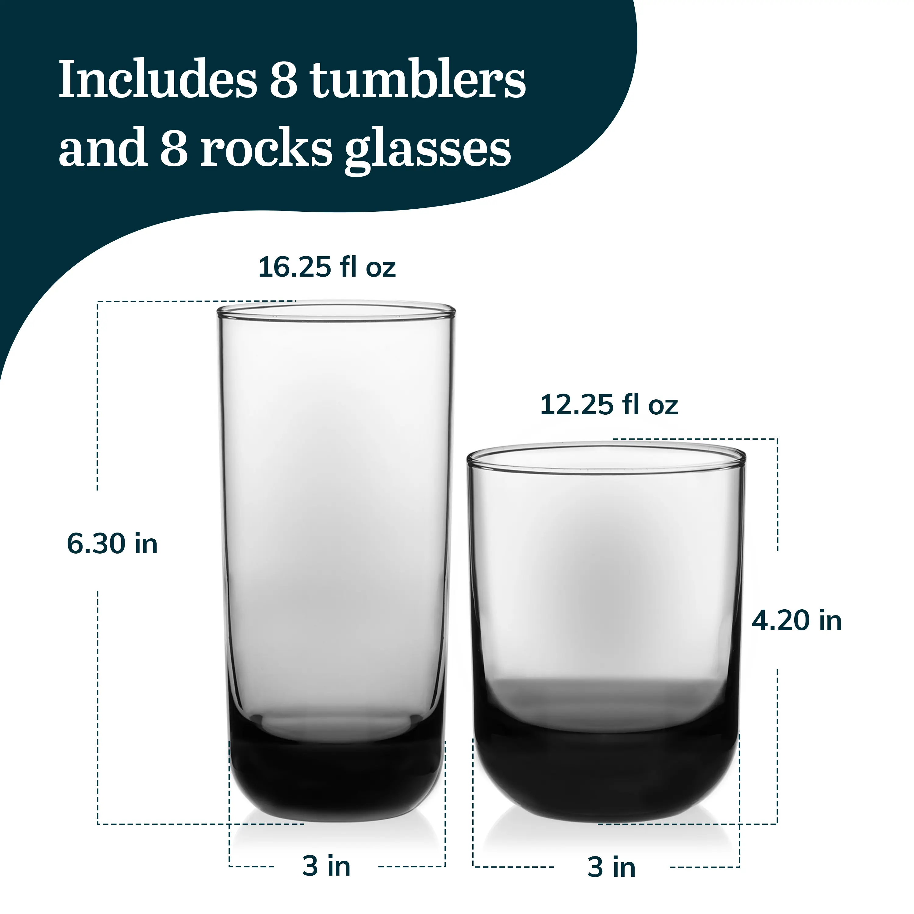 ·Polished multi-purpose smoke-colored glasses set ideal for serving gin and tonics and old fashioned cocktails includes eight 16.25-ounce drinking glasses and eight 12.25-ounce rocks glasses