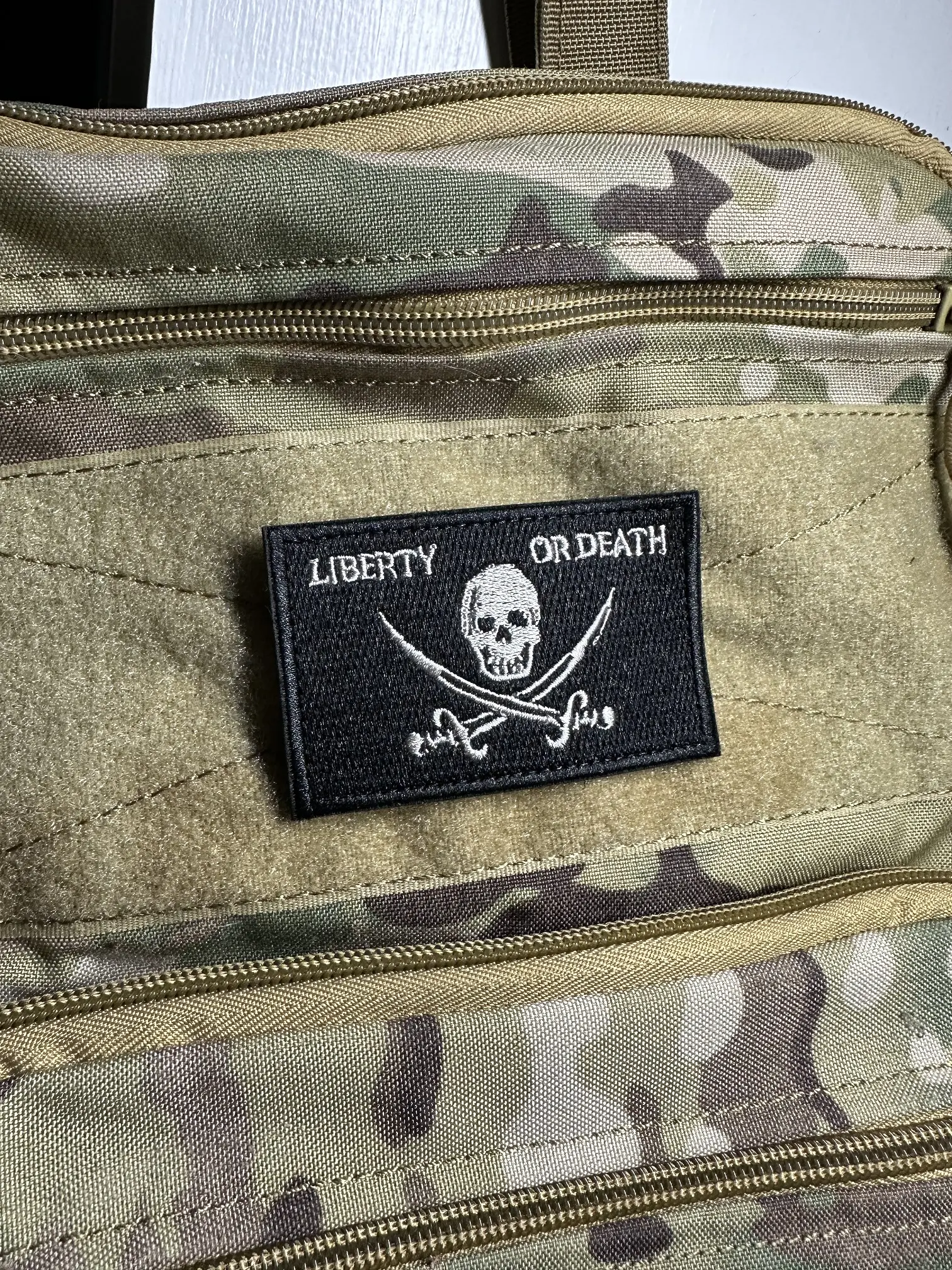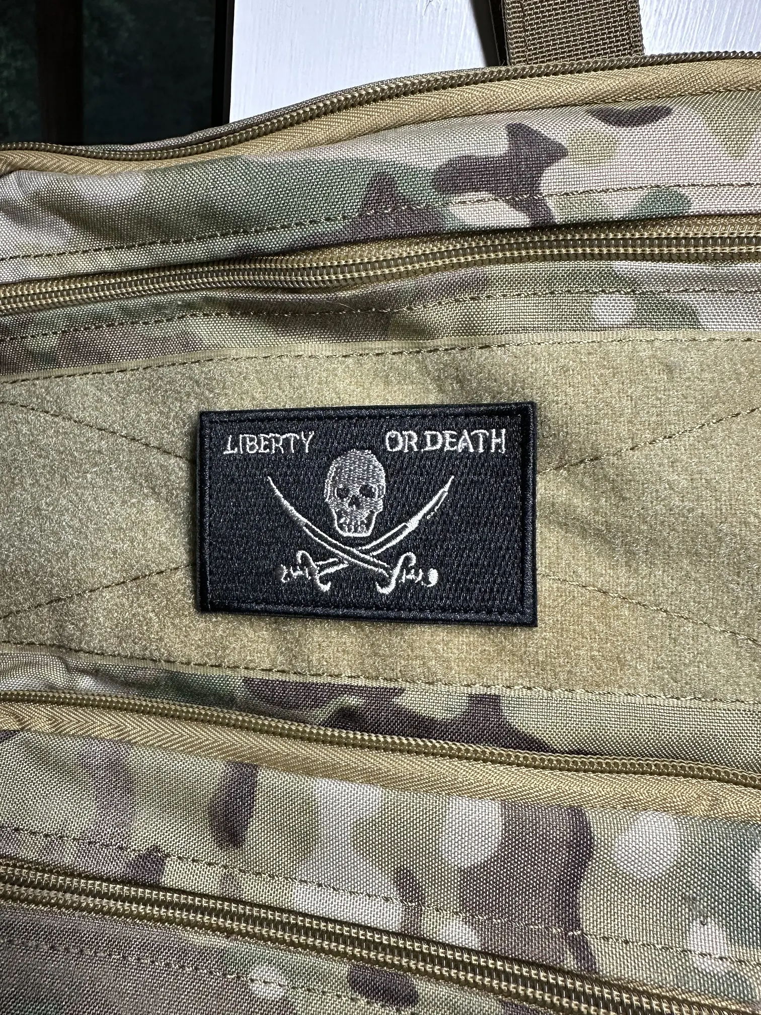 Make a statement with the Liberty Or Death Tactical Patch in Black/Silver! This rectangular patch measures 2" x 3-1/8" and features a threaded design with hook & loop backing, perfect for attaching to clothing, bags, or other gear.