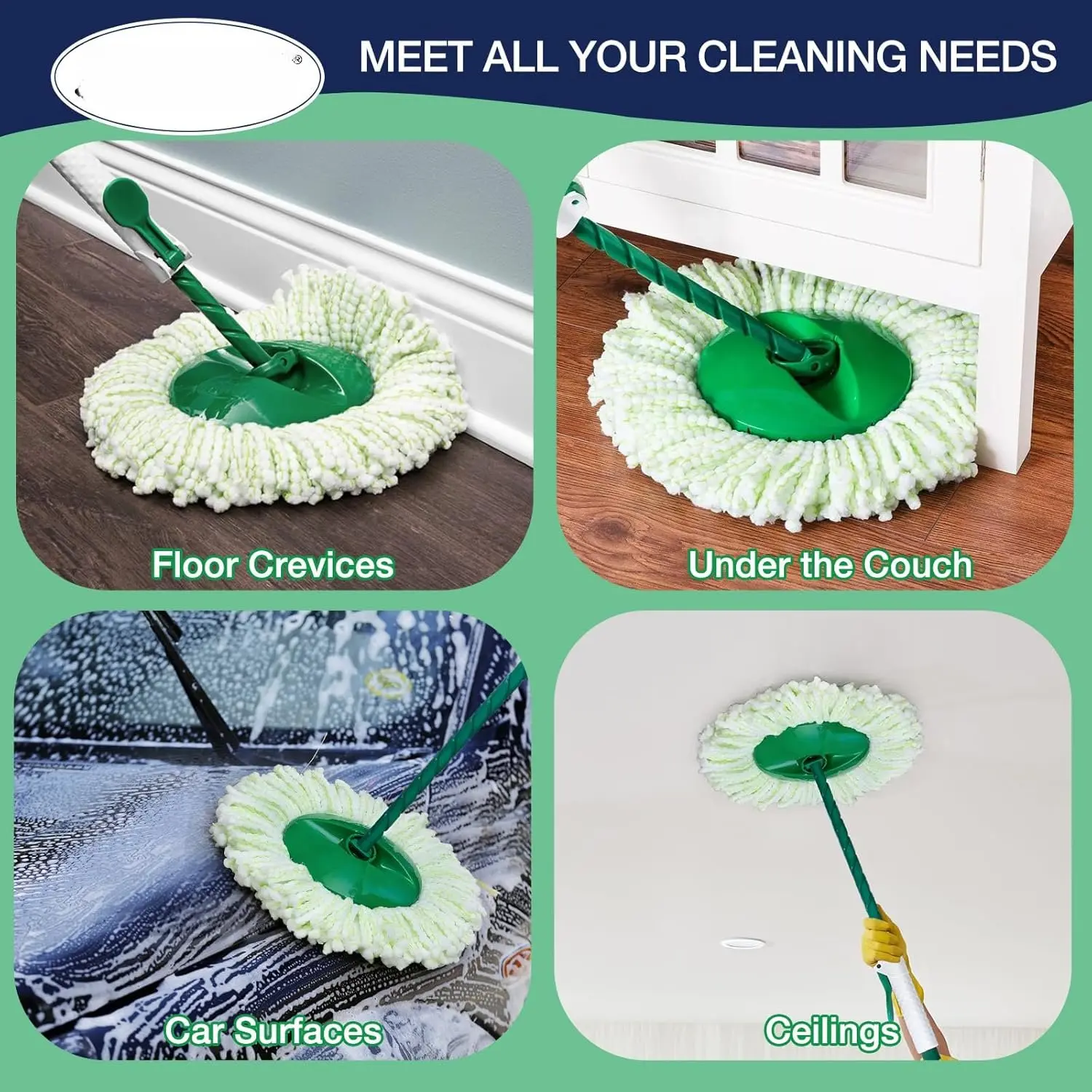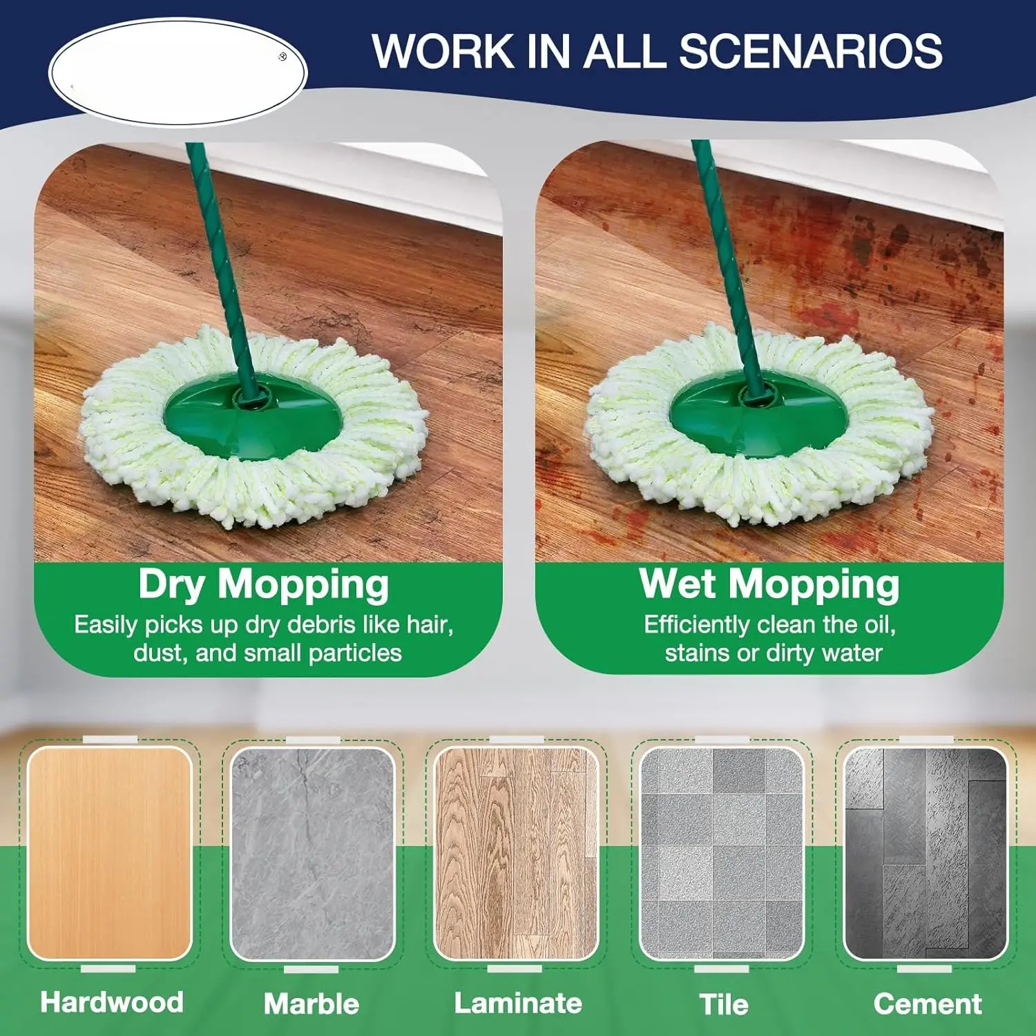 Replacement Mop Heads: Made of microfiber, durable and machine washable. This spin mop won't scratch the surfaces you're cleaning. Also the mop replace for Libman, and absorbs tough dirt and grime effortlessly.