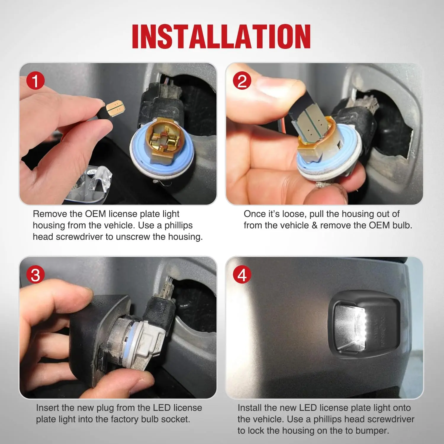 Remove the OEM license plate light housing from the vehicle. Use a phillips head screwdriver to unscrew the housing.