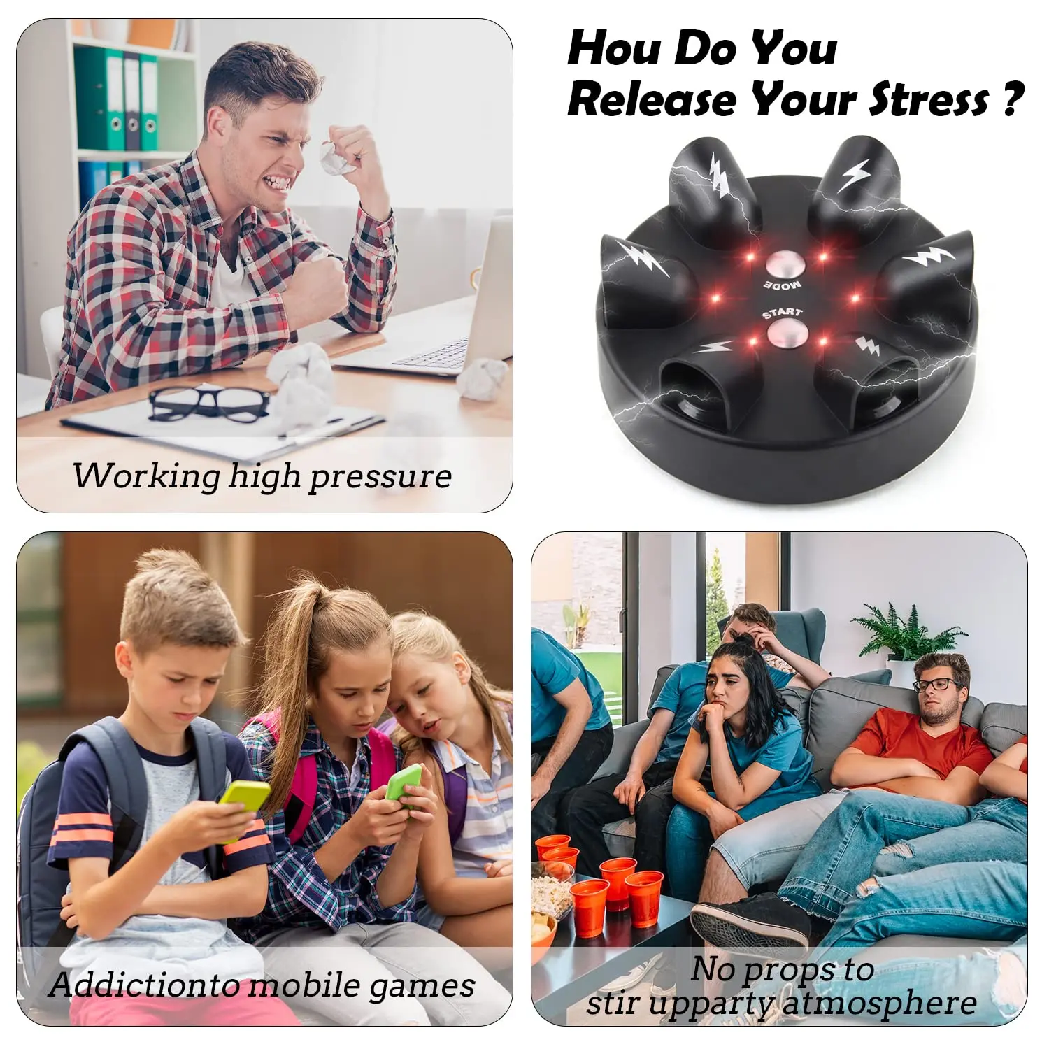 ·【Competition Mode】Comparing reaction, suitable for two groups of people to play. Press the Mode button to go to the indicator light as a rotation. Place your finger in the finger hole and press the "Start" button to start. When the red light is on in front of the player, you must press the button in front of it ("Start", "Mode"), otherwise, it will be considered a failure and will be shocked by electric shock, scream