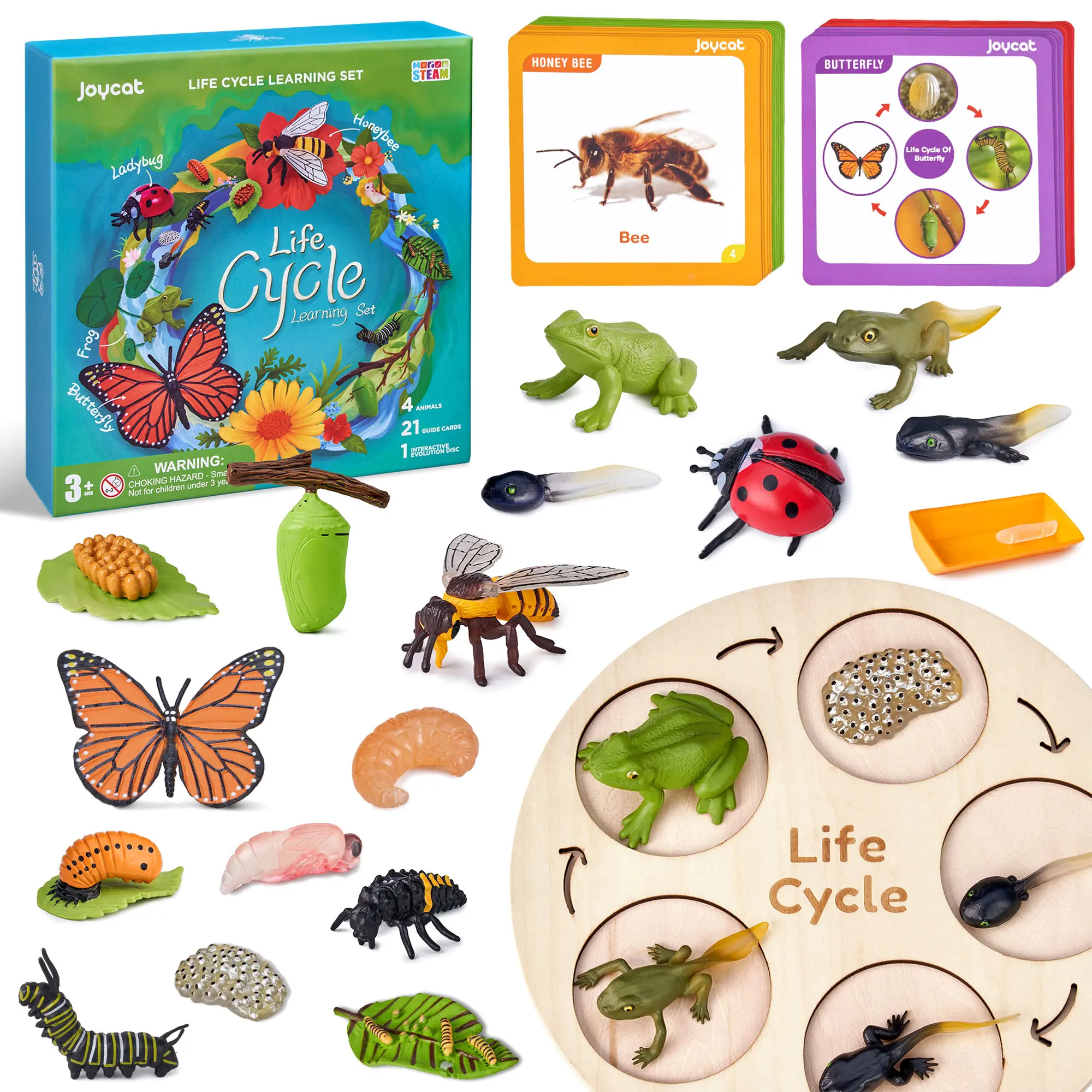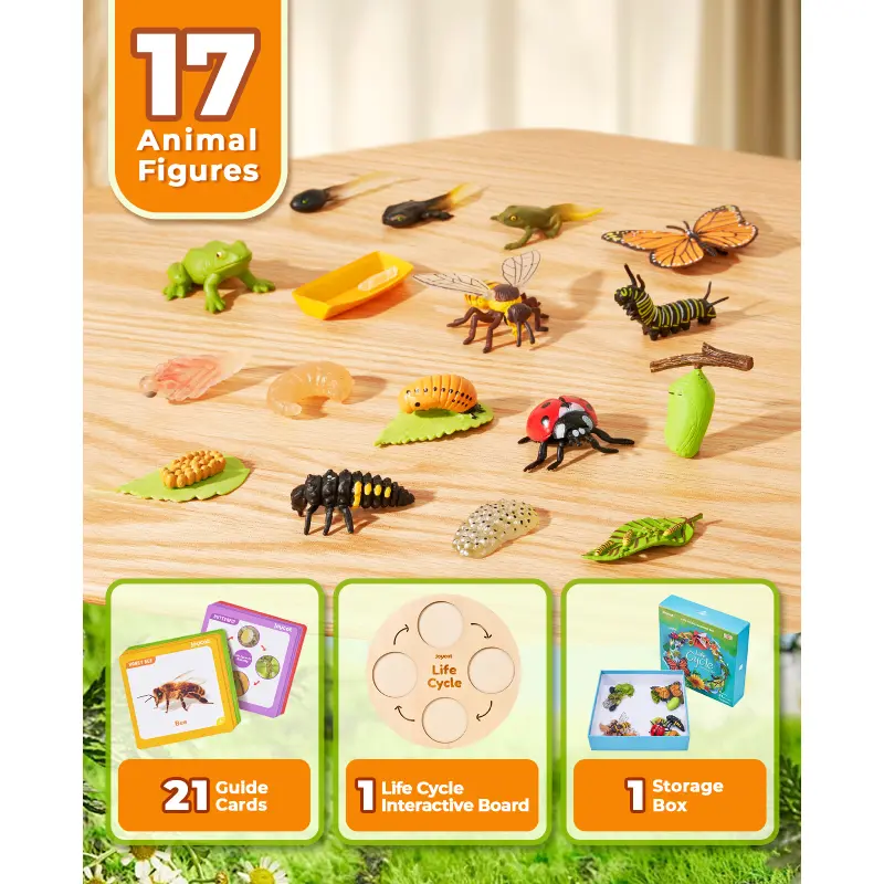 ·17 Animal Figures - 4 Sets: Contains 4 Sets of Plastic Realistic Insect Animals Including Butterfly, Frog, Ladybug, and Bee. With 21pcs of insect introducing cards and 1pcs Double-Side of life cycle presenting wooden board.