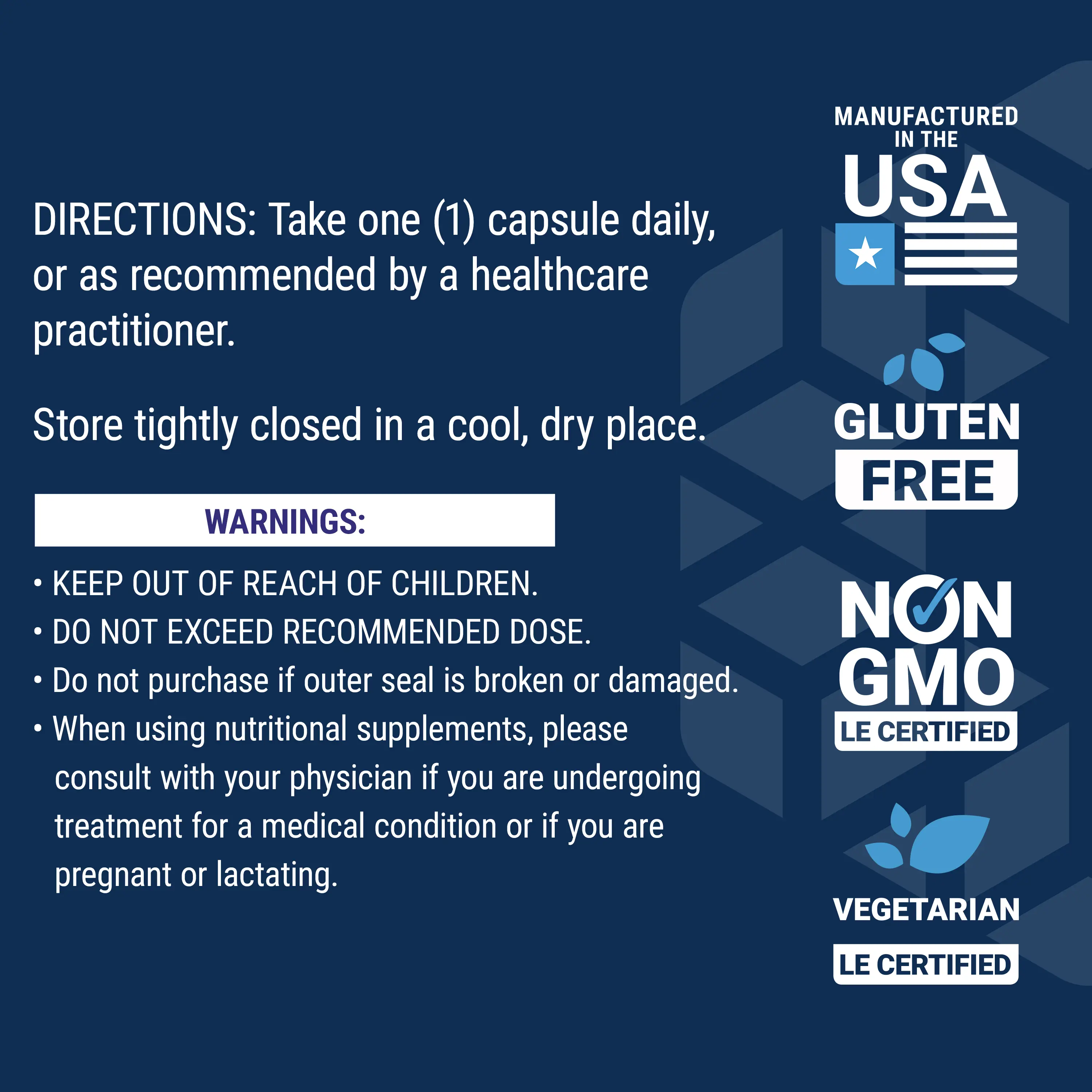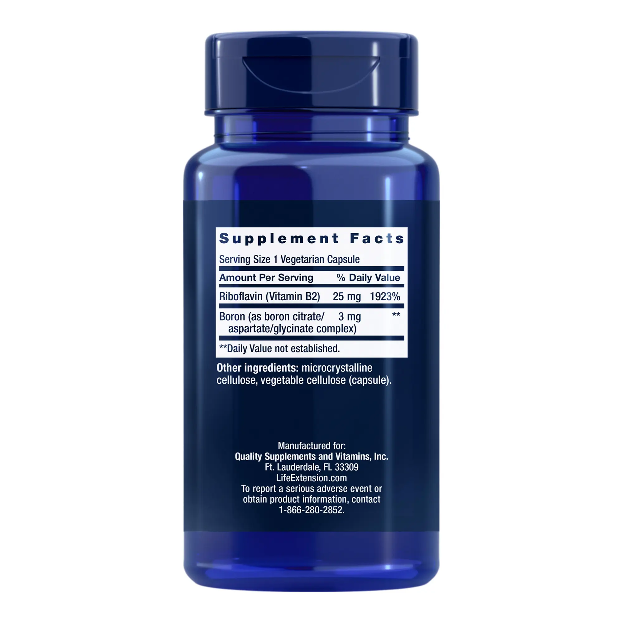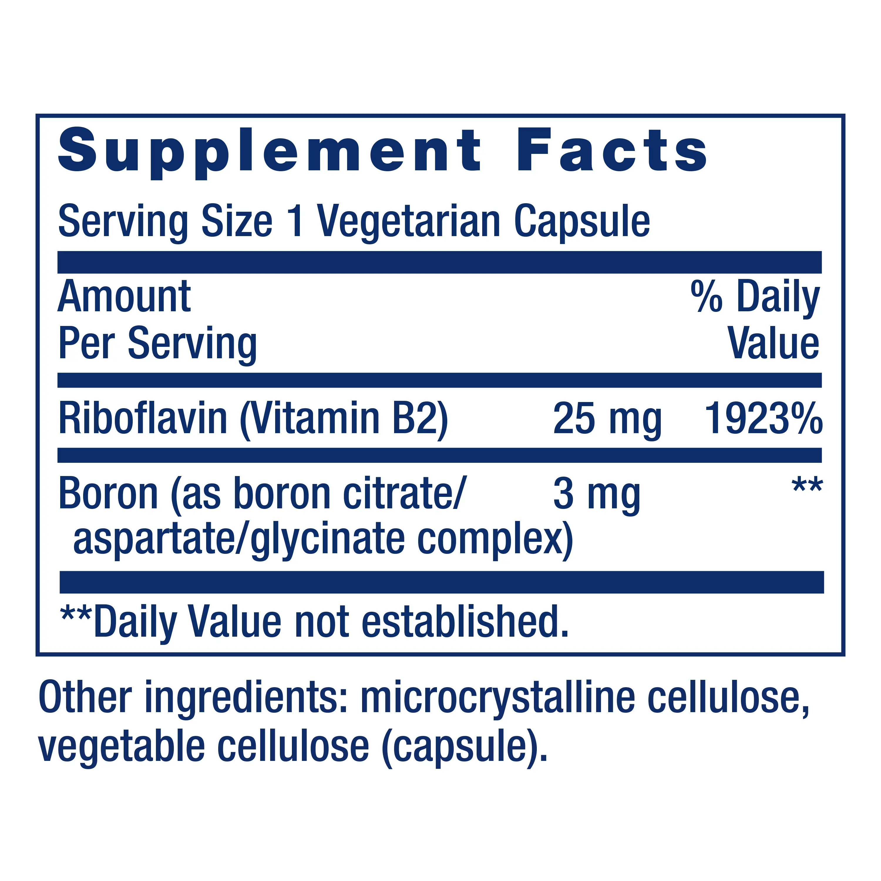 IngredientsRiboflavin (Vitamin B2) 25 mg Boron (as boron citrate/aspartate/glycinate complex) 3 mg Other ingredients: microcrystalline cellulose, vegetable cellulose (capsule).