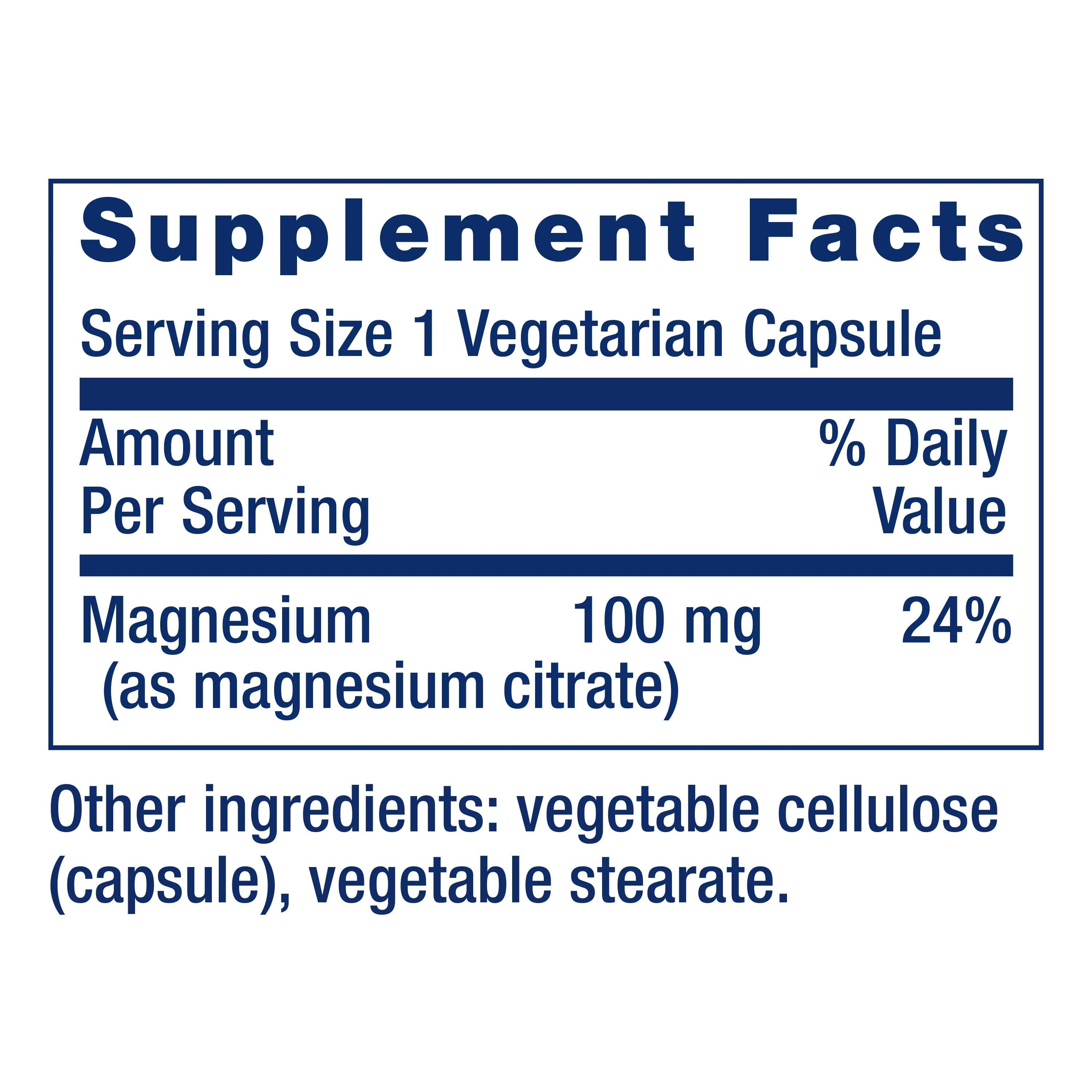 IngredientsMagnesium (as magnesium citrate) 100 mg Other ingredients: vegetable cellulose (capsule), vegetable stearate. Non-GMO