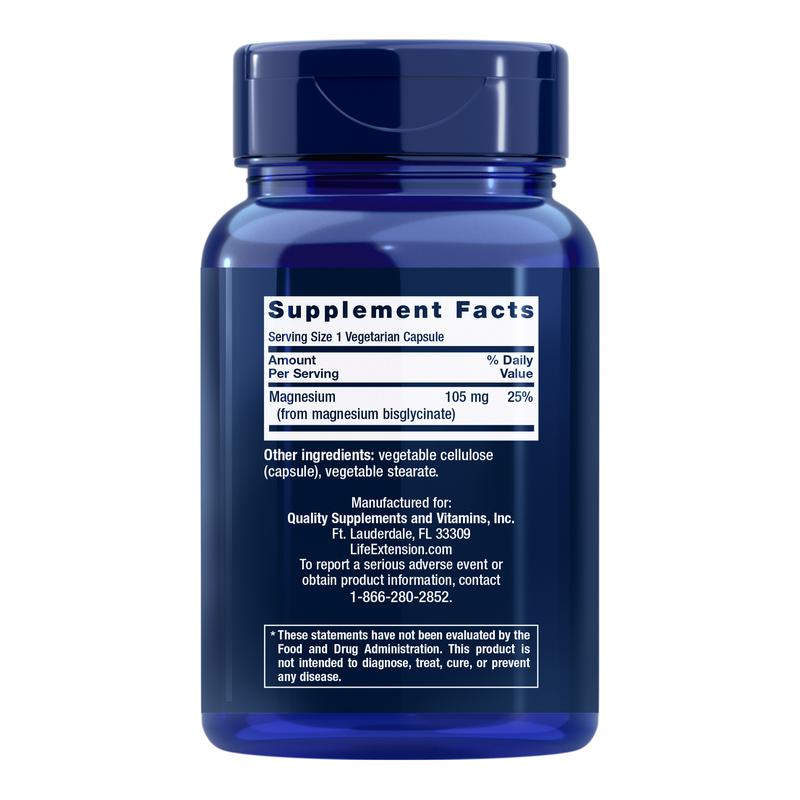 Life Extension's Magnesium Glycinate delivers 105 mg magnesium via magnesium bisglycinate, a widely popular, well-absorbed form of magnesium.