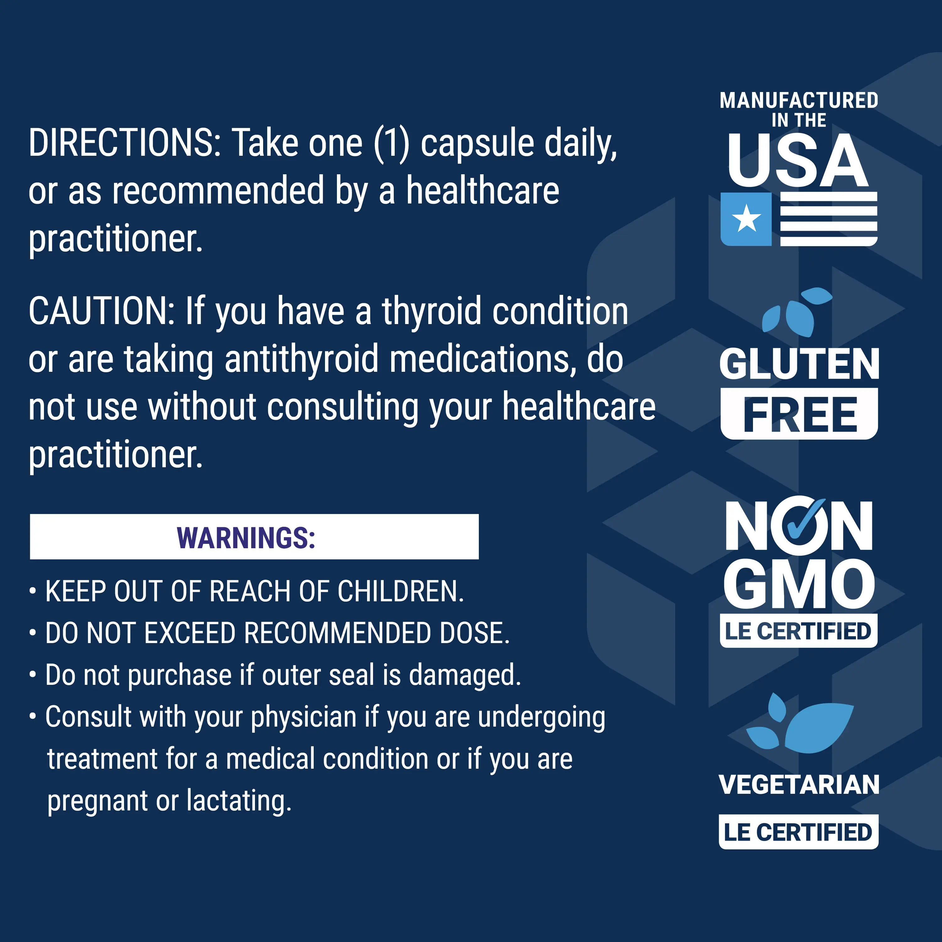 IngredientsIodine [from Sea-Iodine Complex Blend (organic kelp and bladderwrack extracts, potassium iodide)] 1000 mcg Other ingredients: microcrystalline cellulose, vegetable cellulose (capsule), silica, stearic acid. Non-GMO