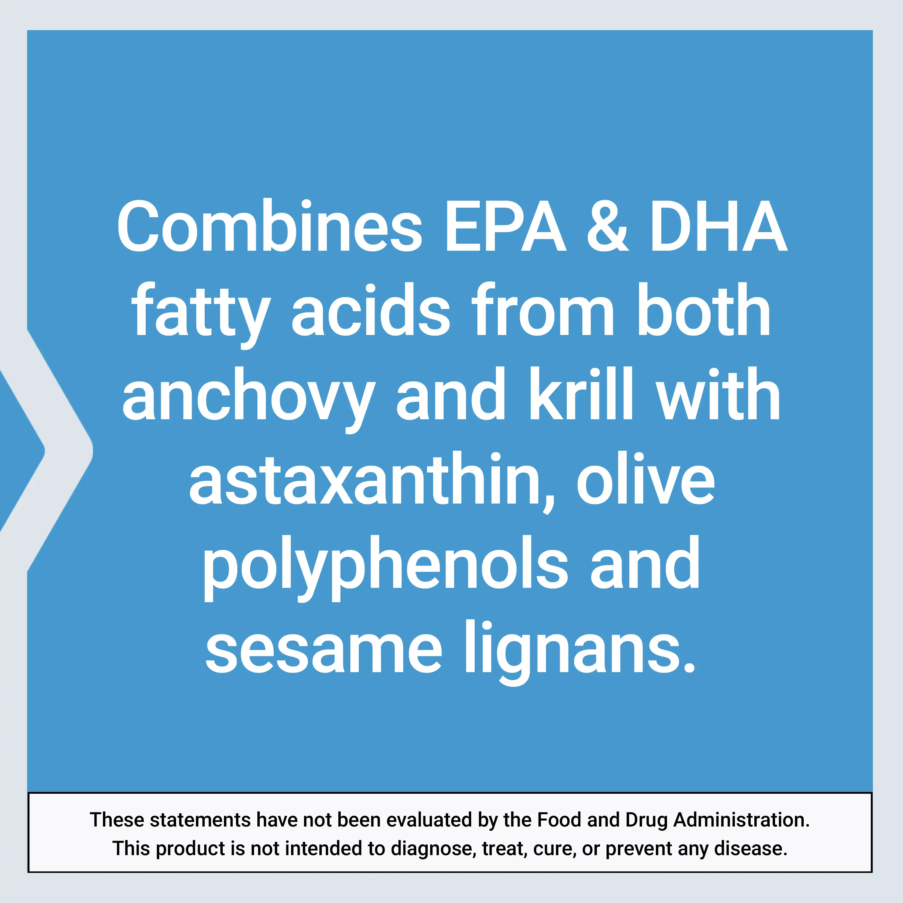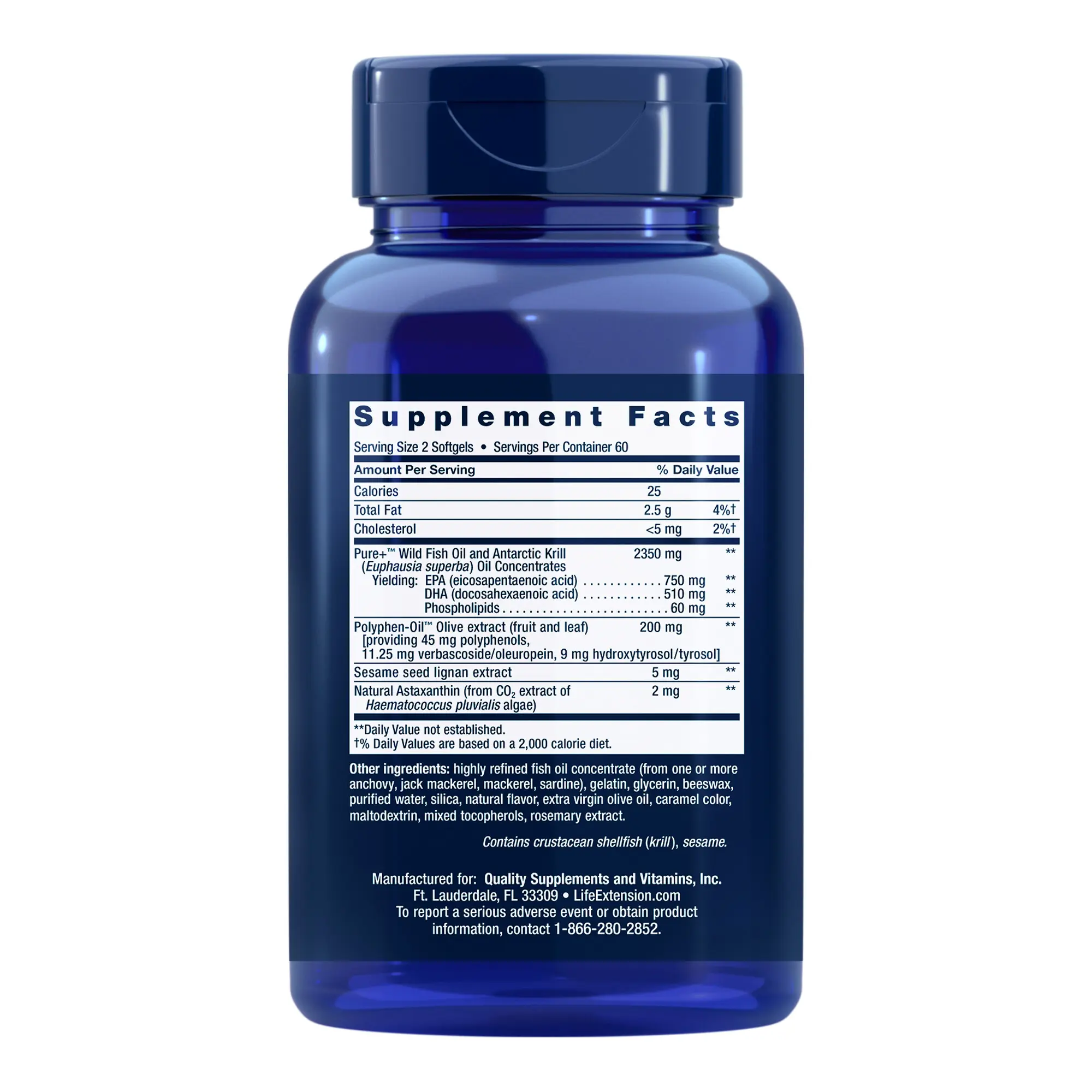 IngredientsPure+ Wild Fish Oil and Antarctic Krill (Euphausia superba) Oil Concentrates, EPA (eicosapentaenoic acid), DHA (docosahexaenoic acid), Phospholipids, Polyphen-Oil Olive extract (fruit and leaf) [providing 45 mg polyphenols, 11.25 mg verbascoside/oleuropein, 9 mg hydroxytyrosol/tyrosol], Sesame seed lignan extract, Natural Astaxanthin (from CO2 extract of Haematococcus pluvialis algae), Highly Refined Fish Oil Concentrate (Anchovy), Gelatin, Glycerin, Beeswax, Purified Water, Silica, Natural Flavor, Extra Virgin Olive Oil, Caramel Color, Mixed Tocopherols, Maltodextrin, Rosemary Extract.