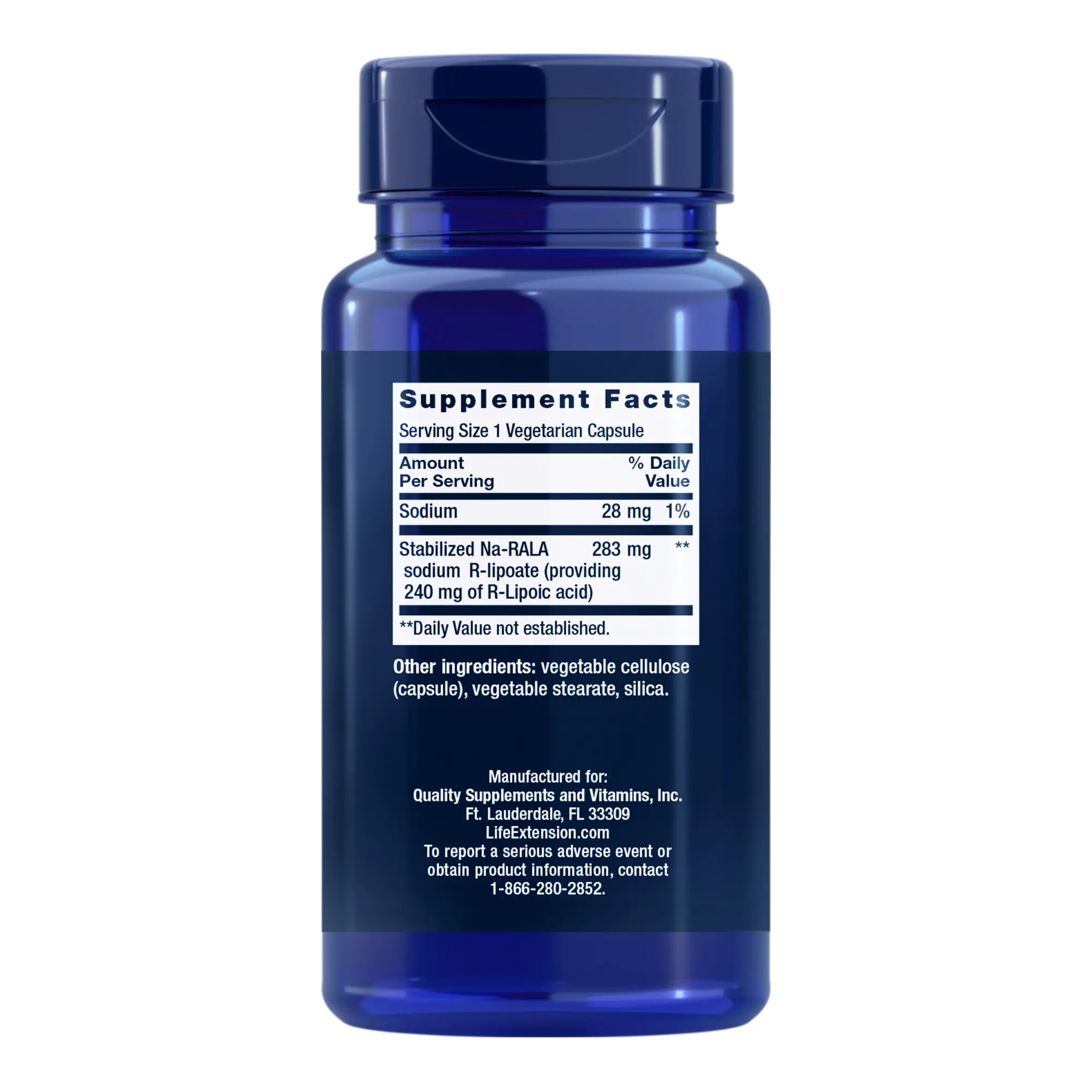 IngredientsSodium 28 mg Stabilized Na-RALA sodium R-lipoate (providing 240 mg of R-Lipoic acid) 283 mg Other ingredients: vegetable cellulose (capsule), vegetable stearate, silica. Non-GMO