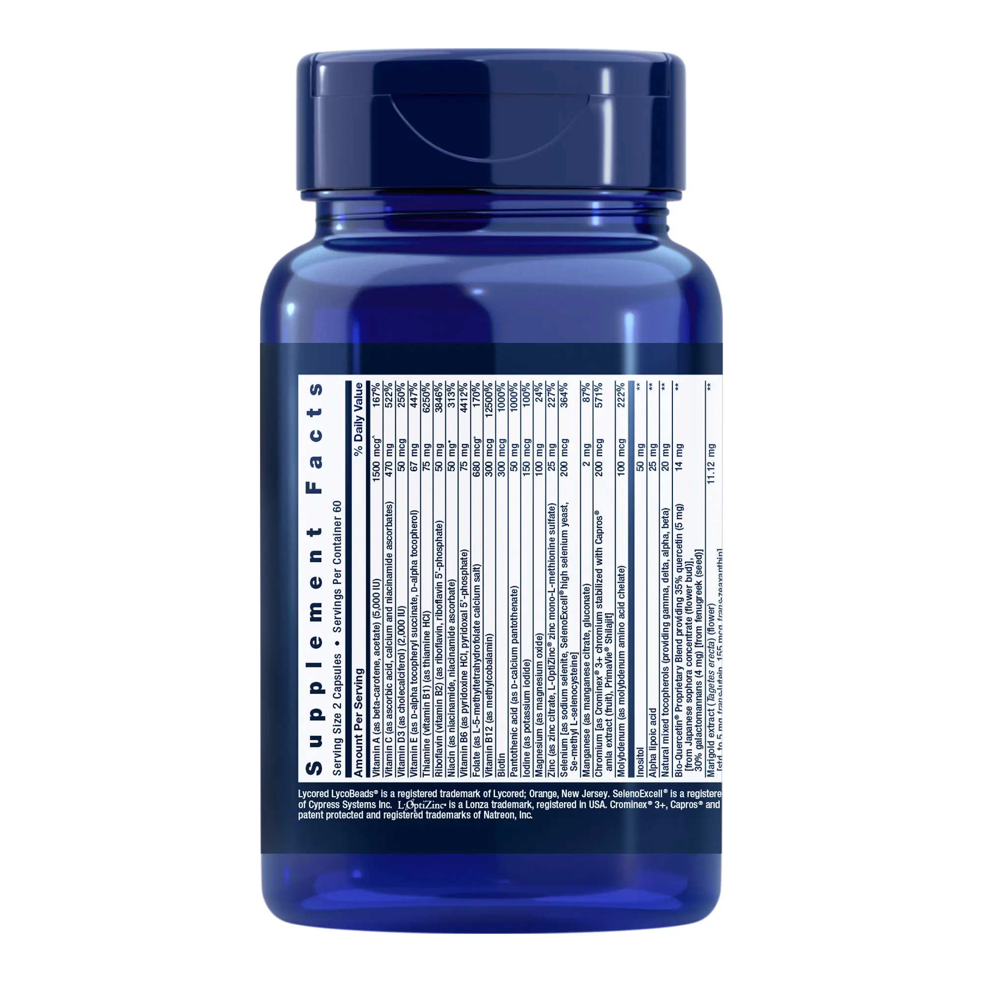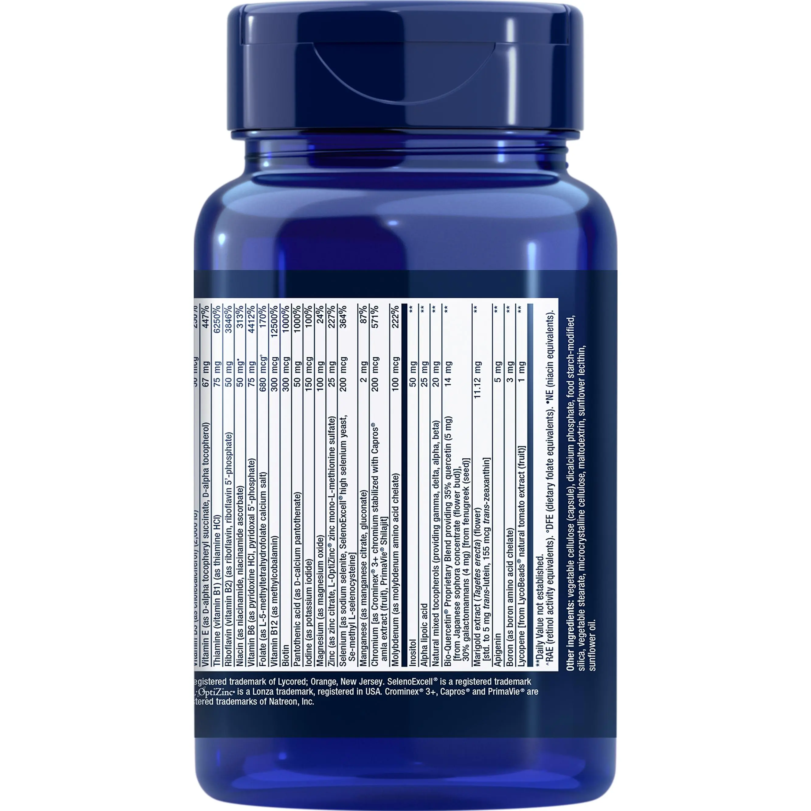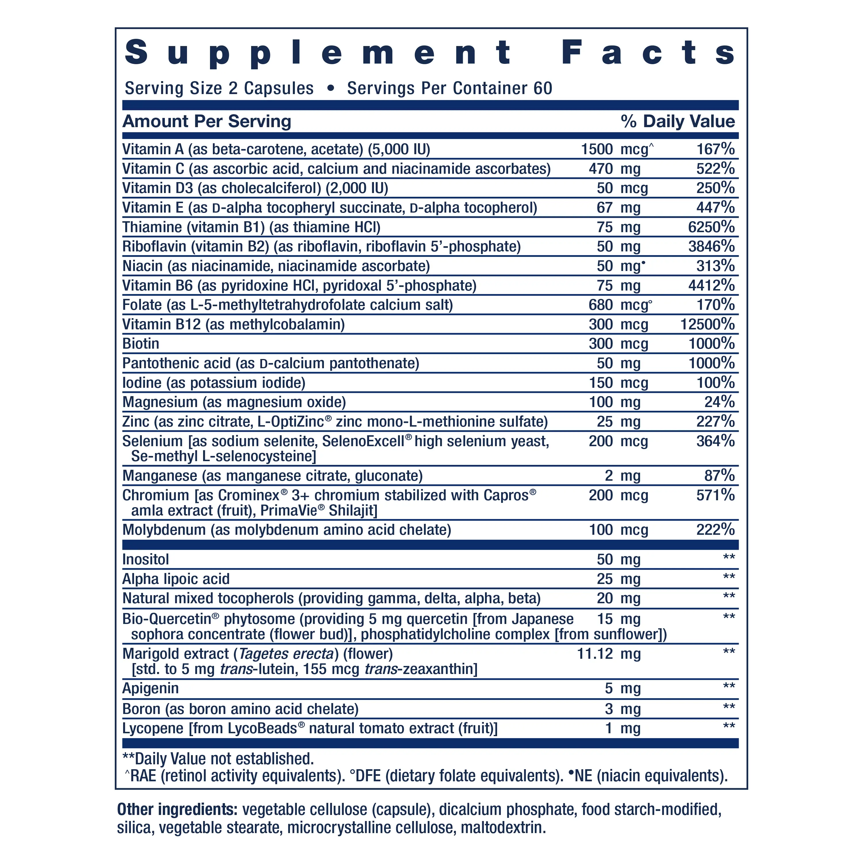 | Ingredients | Vitamin A (as beta-carotene, acetate) (5,000 IU) 1500 mcg Vitamin C (as ascorbic acid, calcium and niacinamide ascorbates) 470 mg Vitamin D3 (as cholecalciferol) (2,000 IU) 50 mcg Vitamin E (as D-alpha tocopheryl succinate, D-alpha tocopherol) 67 mg Thiamine (vitamin B1) (as thiamine HCI) 75 mg Riboflavin (vitamin B2) (as riboflavin, riboflavin 5 -phosphate) 50 mg Niacin (as niacinamide, niacinamide ascorbate) 50 mg Vitamin B6 (as pyridoxine HCI, pyridoxal 5 -phosphate) 75 mg Folate (as L-5-methyltetrahydrofolate calcium salt) 680 mcg Vitamin B12 (as methylcobalamin) 300 mcg Biotin 300 mcg Pantothenic acid (as D-calcium pantothenate) 50 mg Iodine (as potassium iodide) 150 mcg Magnesium (as magnesium oxide) 100 mg Zinc (as zinc citrate, L-OptiZinc zinc mono-L-methionine sulfate) 25 mg Selenium [as sodium selenite, SelenoExcell high selenium yeast, Se-methyl L-selenocysteine] 200 mcg Manganese (as manganese citrate, gluconate) 2 mg Chromium [as Crominex 3+ chromium stabilized with Capros amla extract (fruit), PrimaVie Shilajit] 200 mcg Molybdenum (as molybdenum amino acid chelate) 100 mcg Inositol 50 mg Alpha lipoic acid 25 mg Natural mixed tocopherols (providing gamma, delta, alpha, beta) 20 mg Bio-Quercetin Proprietary Blend providing 35% quercetin (5 mg) [from Japanese sophora concentrate (flower bud)], 30% galactomannans (4 mg) [from fenugreek (seed)] 14 mg Marigold extract (Tagetes erecta) (flower) [std. to 5 mg trans-lutein, 155 mcg trans-zeaxanthin] 11.12 mg Apigenin 5 mg Boron (as boron amino acid chelate) 3 mg Lycopene [from LycoBeads natural tomato extract (fruit)] 1 mg Other ingredients: vegetable cellulose (capsule), dicalcium phosphate, food starch-modified, silica, vegetable stearate, microcrystalline cellulose, maltodextrin, sunflower lecithin, sunflower oil. RAE (retinol activity equivalents). DFE (dietary folate equivalents). NE (niacin equivalents). Lycored LycoBeads is a registered trademark of Lycored; Orange, New Jersey. |