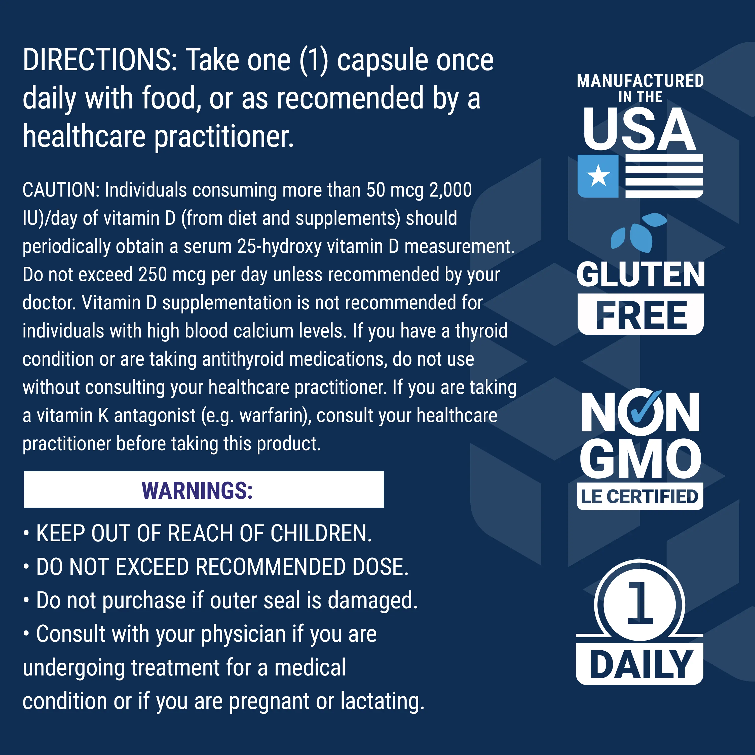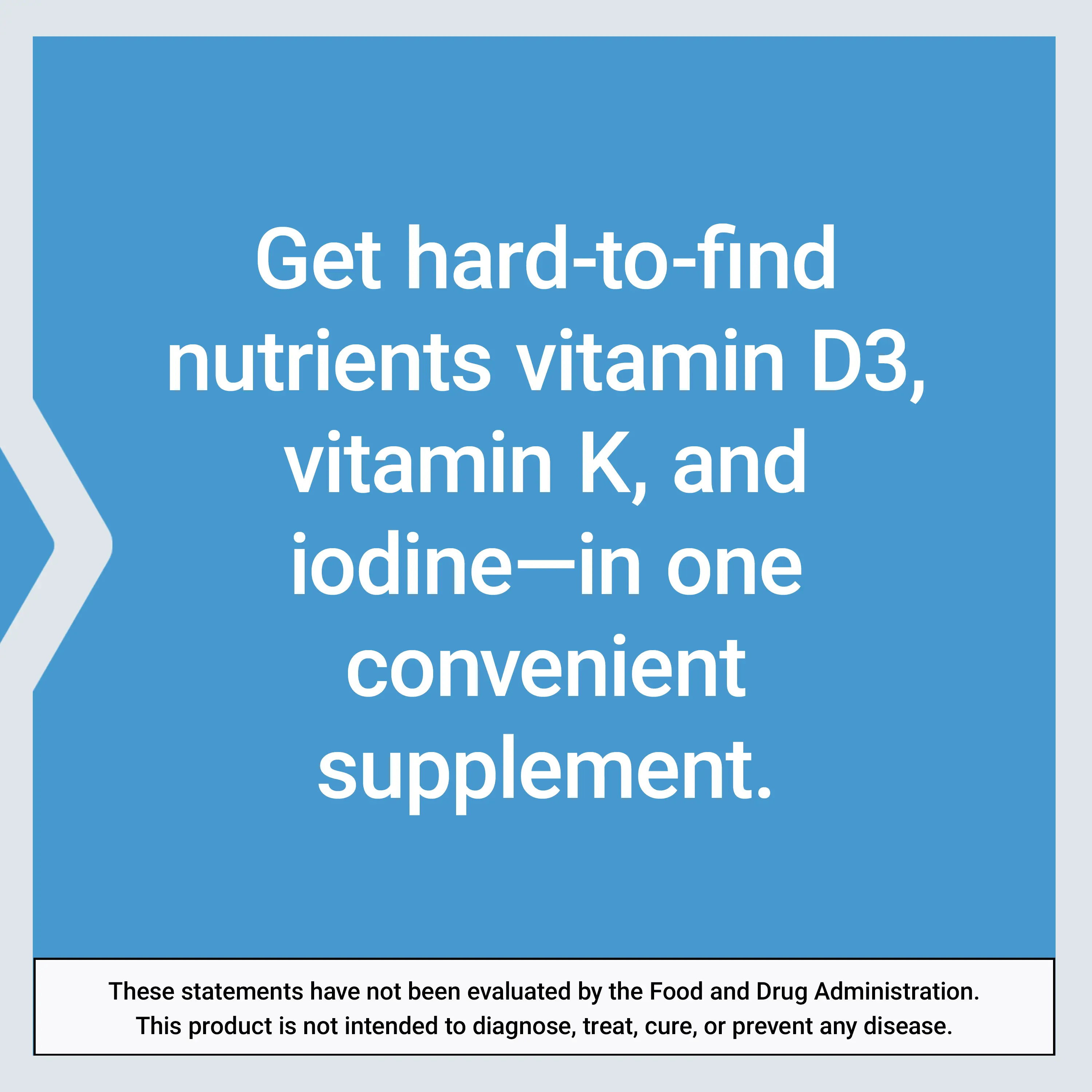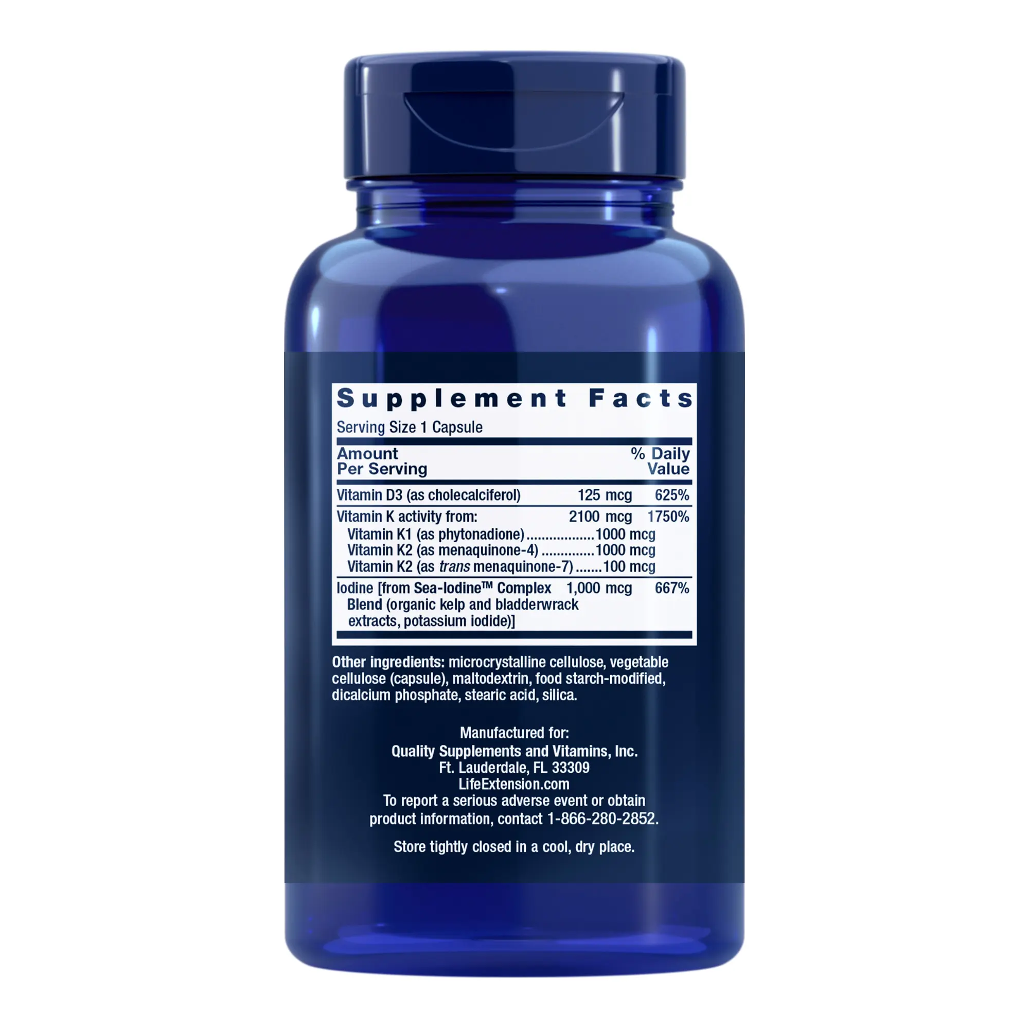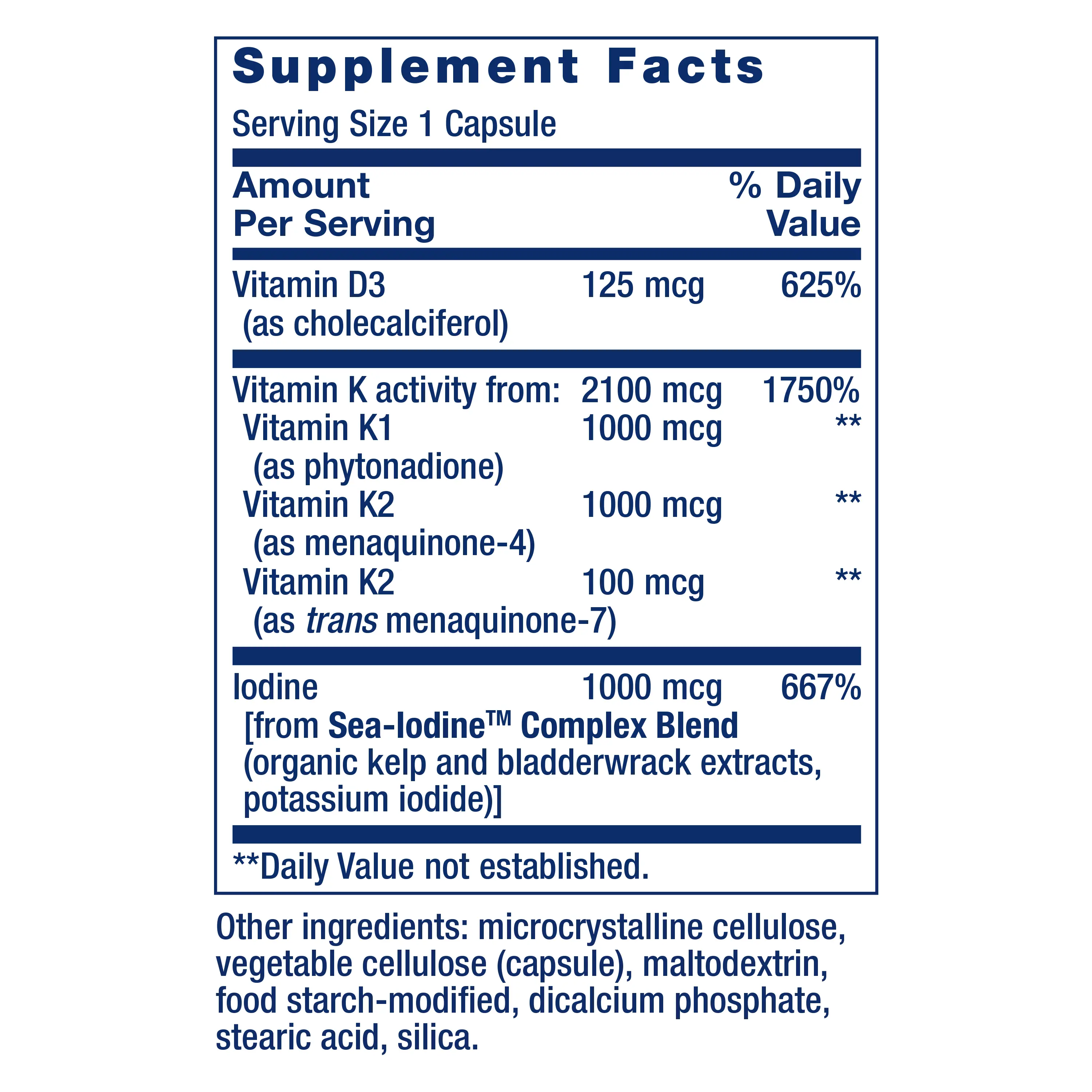 IngredientsVitamin D3 (as cholecalciferol) 125 mcg Vitamin K activity from: 2100 mcg Vitamin K1 (as phytonadione) 1000 mcg Vitamin K2 (as menaquinone-4) 1000 mcg Vitamin K2 (as trans menaquinone-7) 100 mcg Iodine [from Sea-Iodine Complex Blend (organic kelp and bladderwrack extracts, potassium iodide)] 1000 mcg Other ingredients: microcrystalline cellulose, vegetable cellulose (capsule), maltodextrin, food starch-modified, dicalcium phosphate, stearic acid, silica.