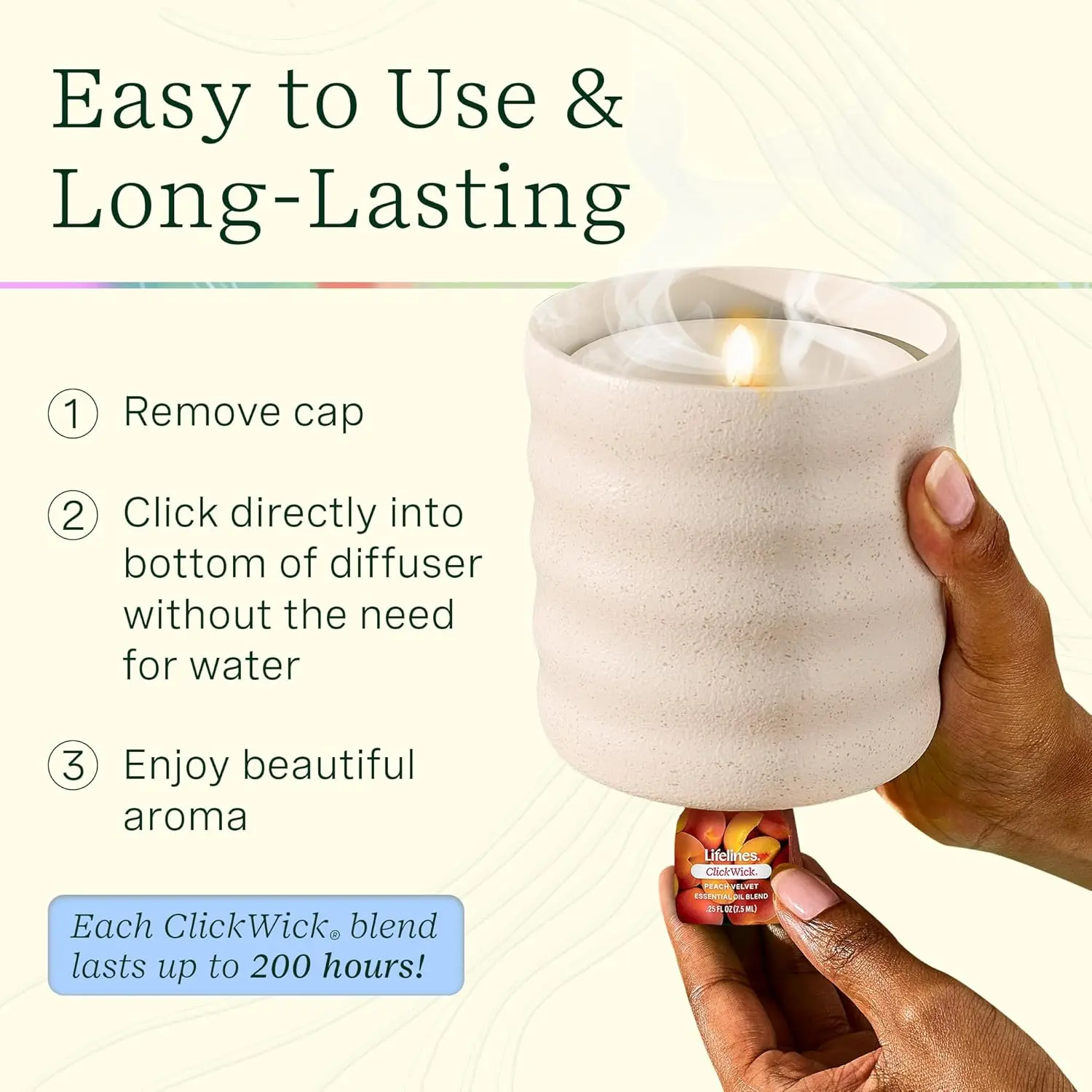 ·Long-Lasting Scents: Each ClickWick blend lasts up to 200 hours so you can immerse your senses for even longer.