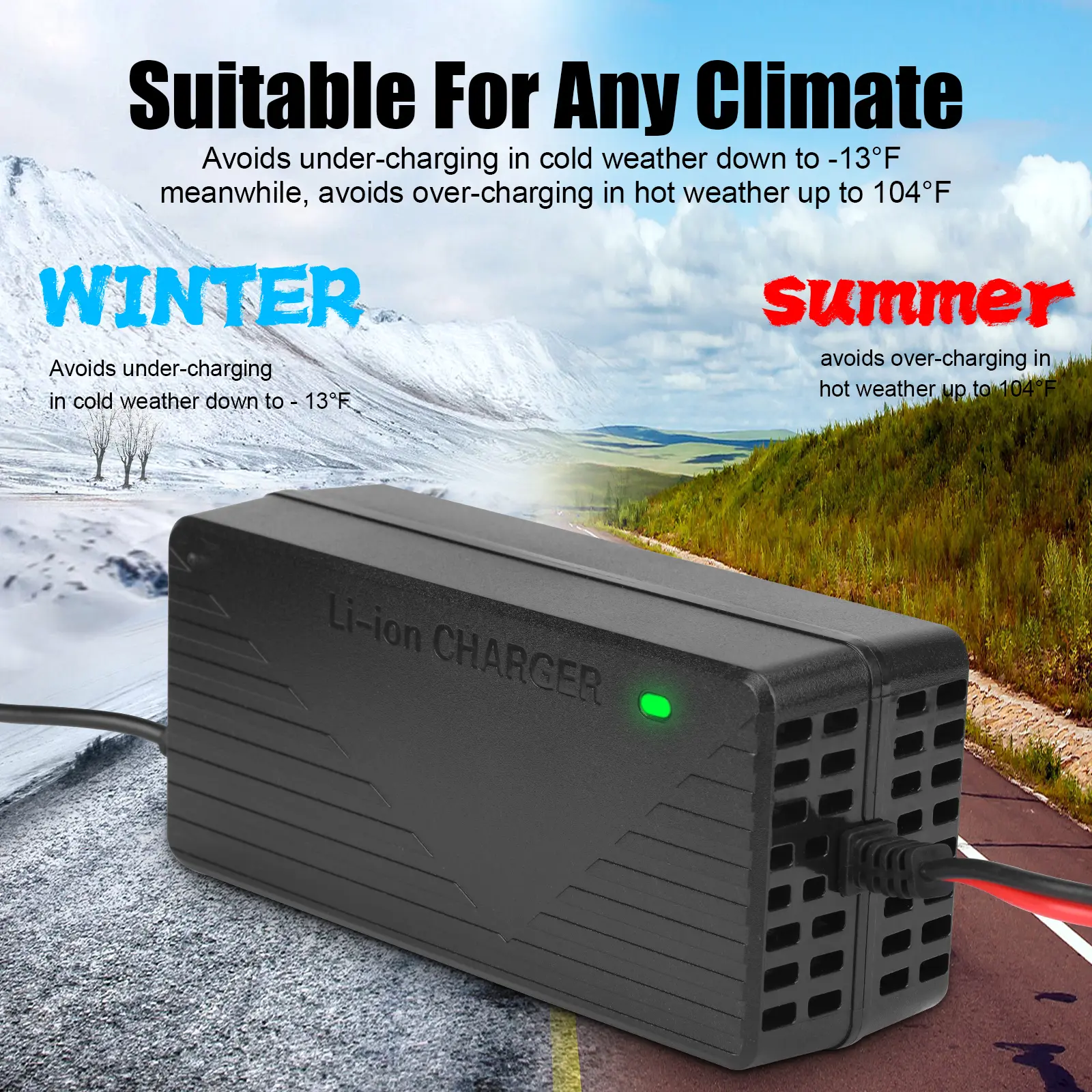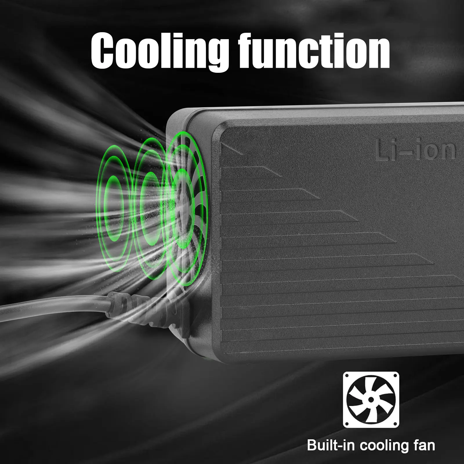 The battery charger with a LED indicator is easier to monitor the battery charging status. The durable shell and cooling fan allow the charger's exterior to function as a heat sink with over-heating protection.