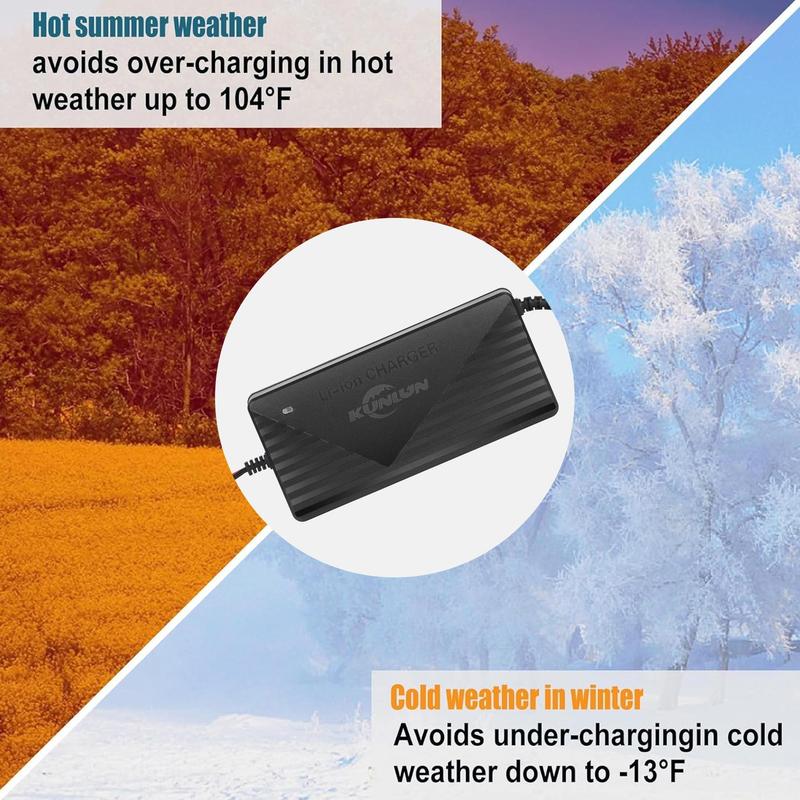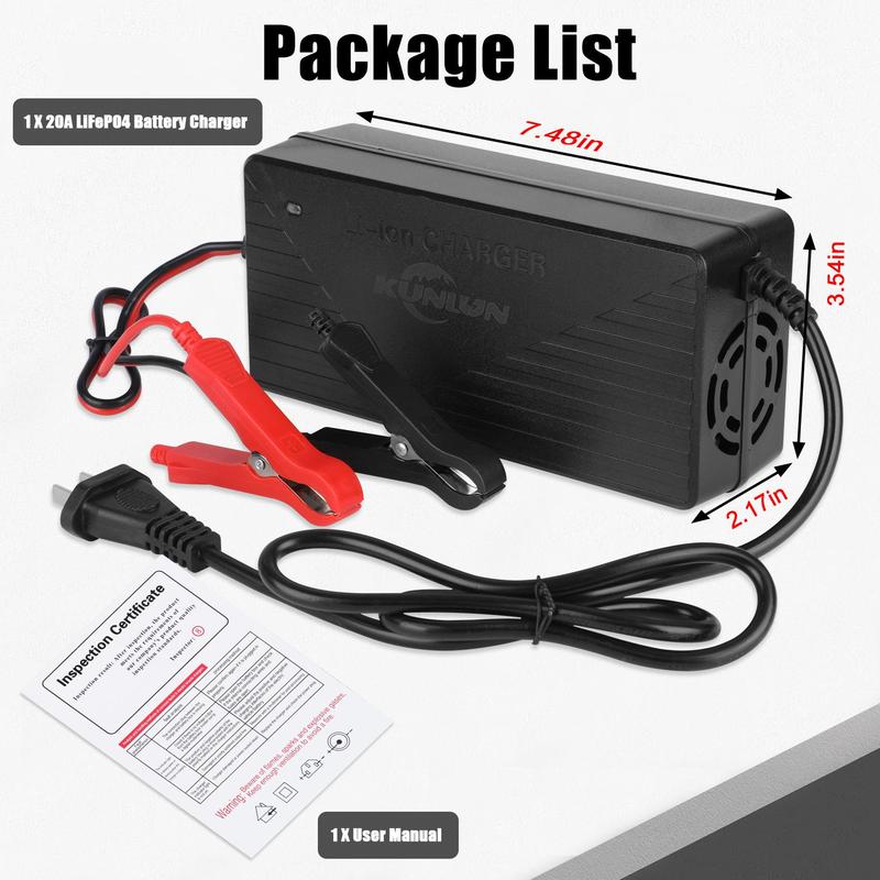 The battery charger with a LED indicator is easier to monitor the battery charging status. The durable shell and cooling fan allow the charger's exterior to function as a heat sink with over-heating protection.
