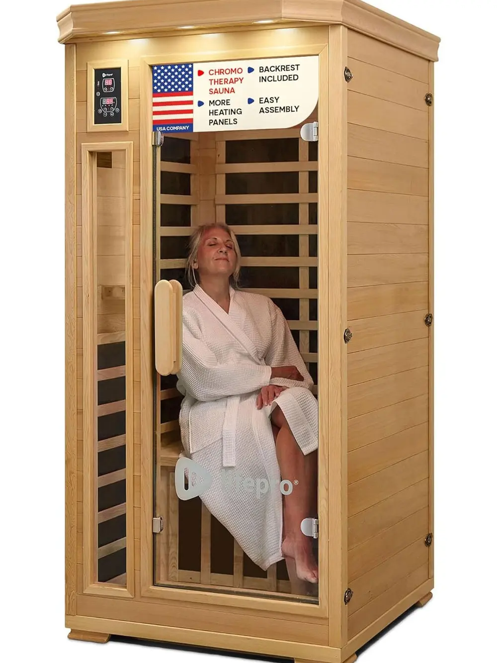 Crafted from premium Canadian hemlock wood, this compact 1-person sauna (35.4” L × 35.4” W × 74.8” H) offers a natural, elegant finish that fits seamlessly into homes, apartments, or wellness rooms.