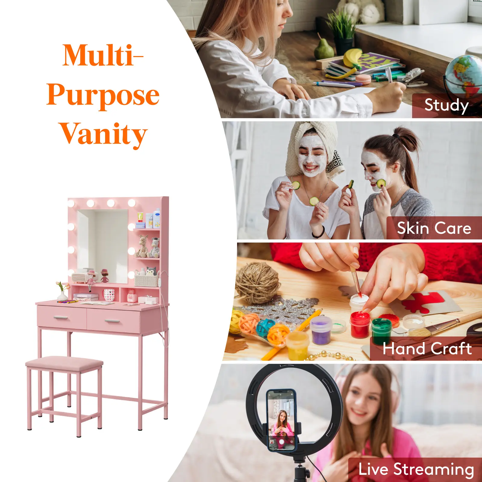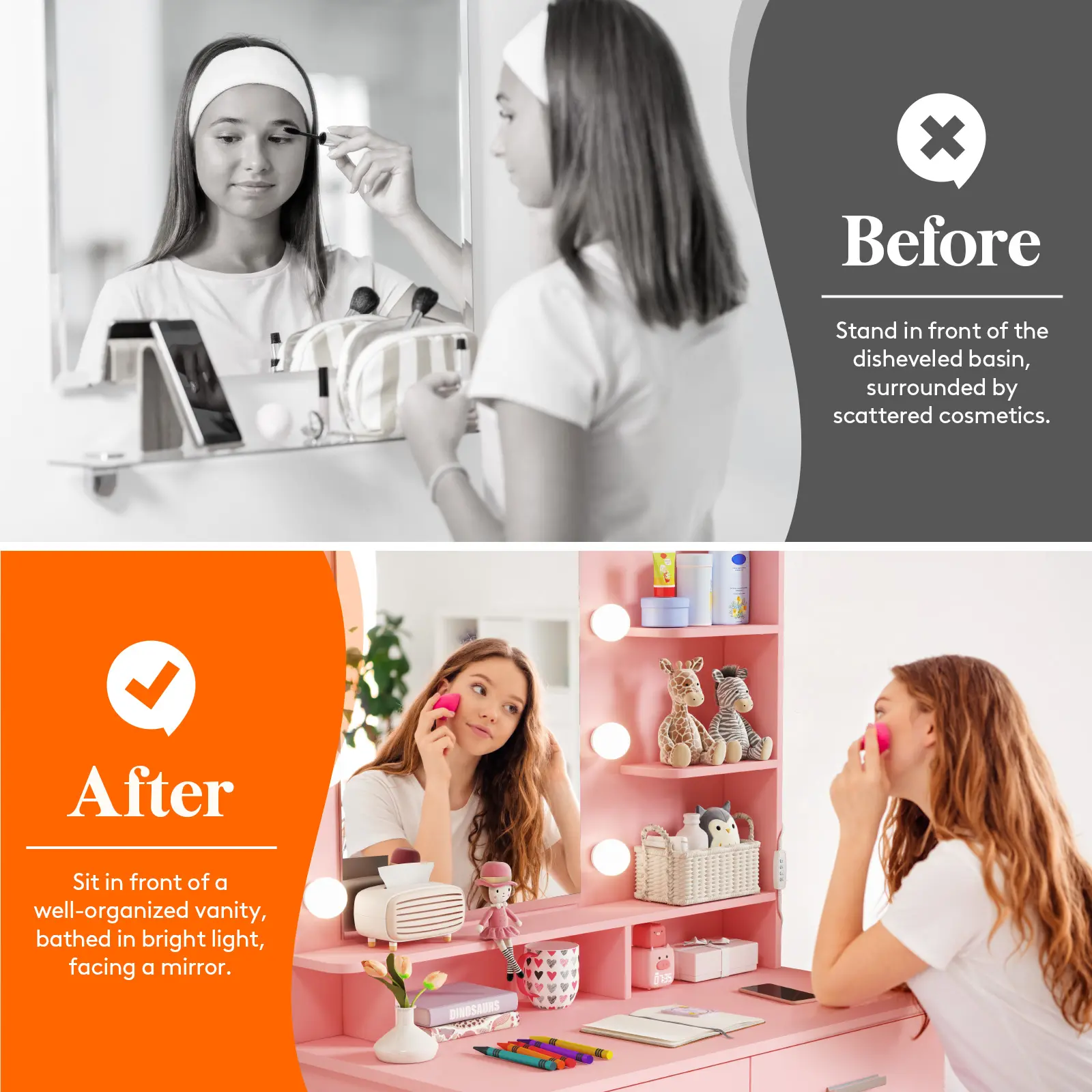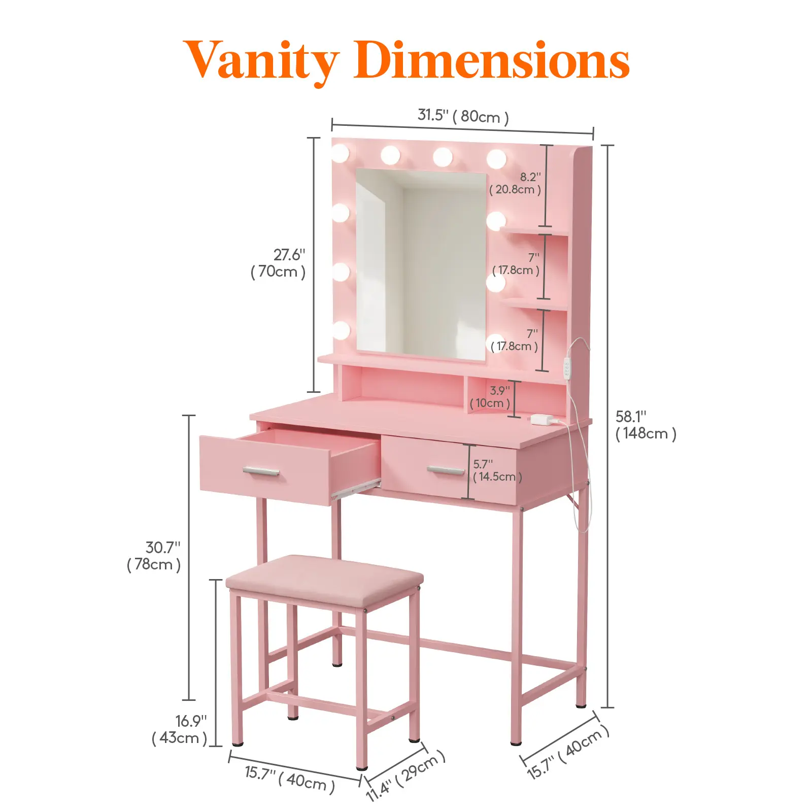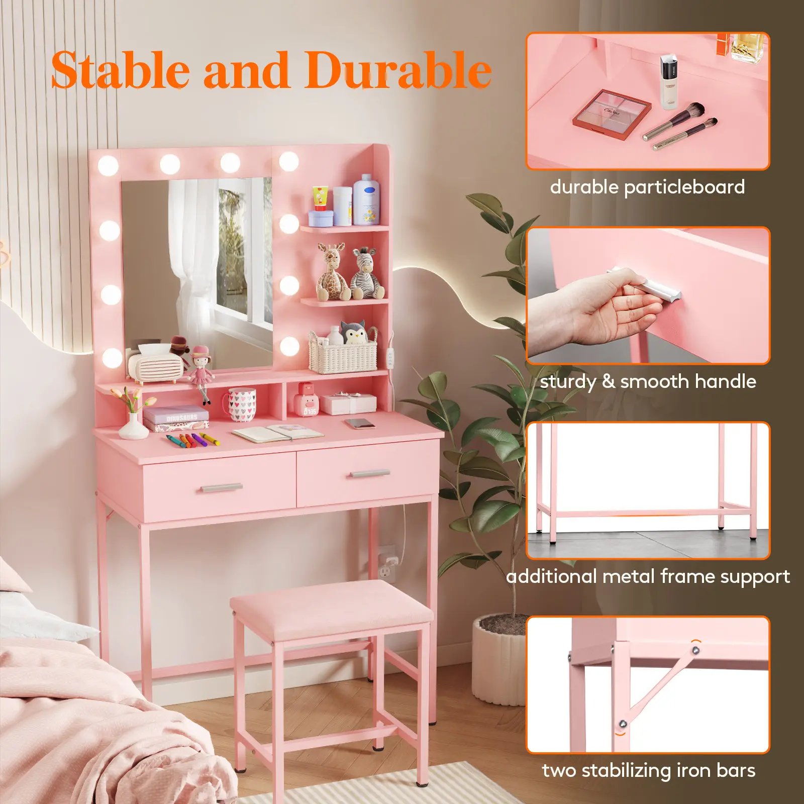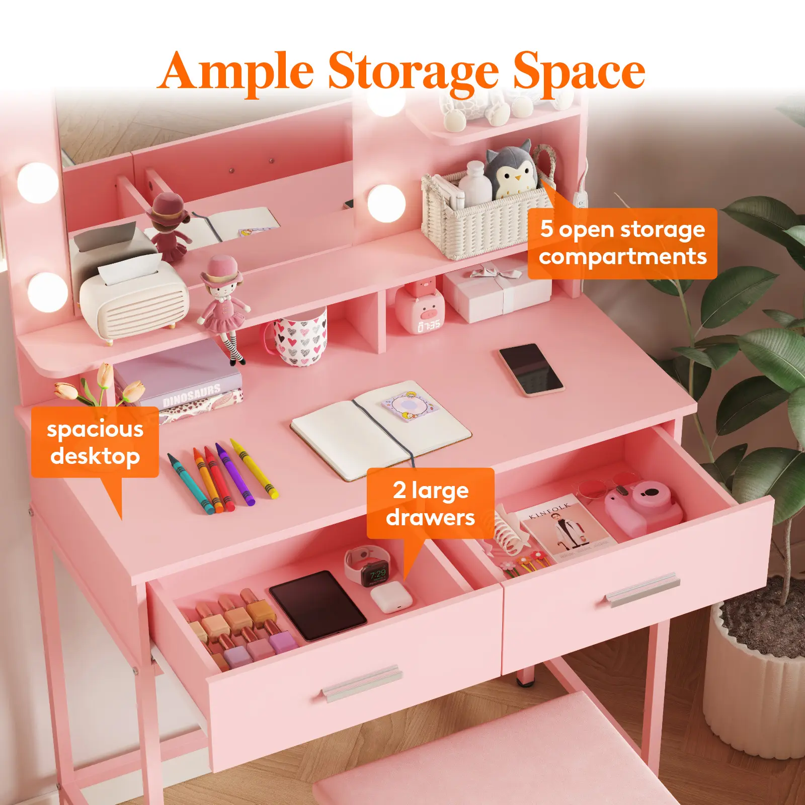 ·Spacious desktop for cosmetics, perfumes, jewelry, hair tools, and décor