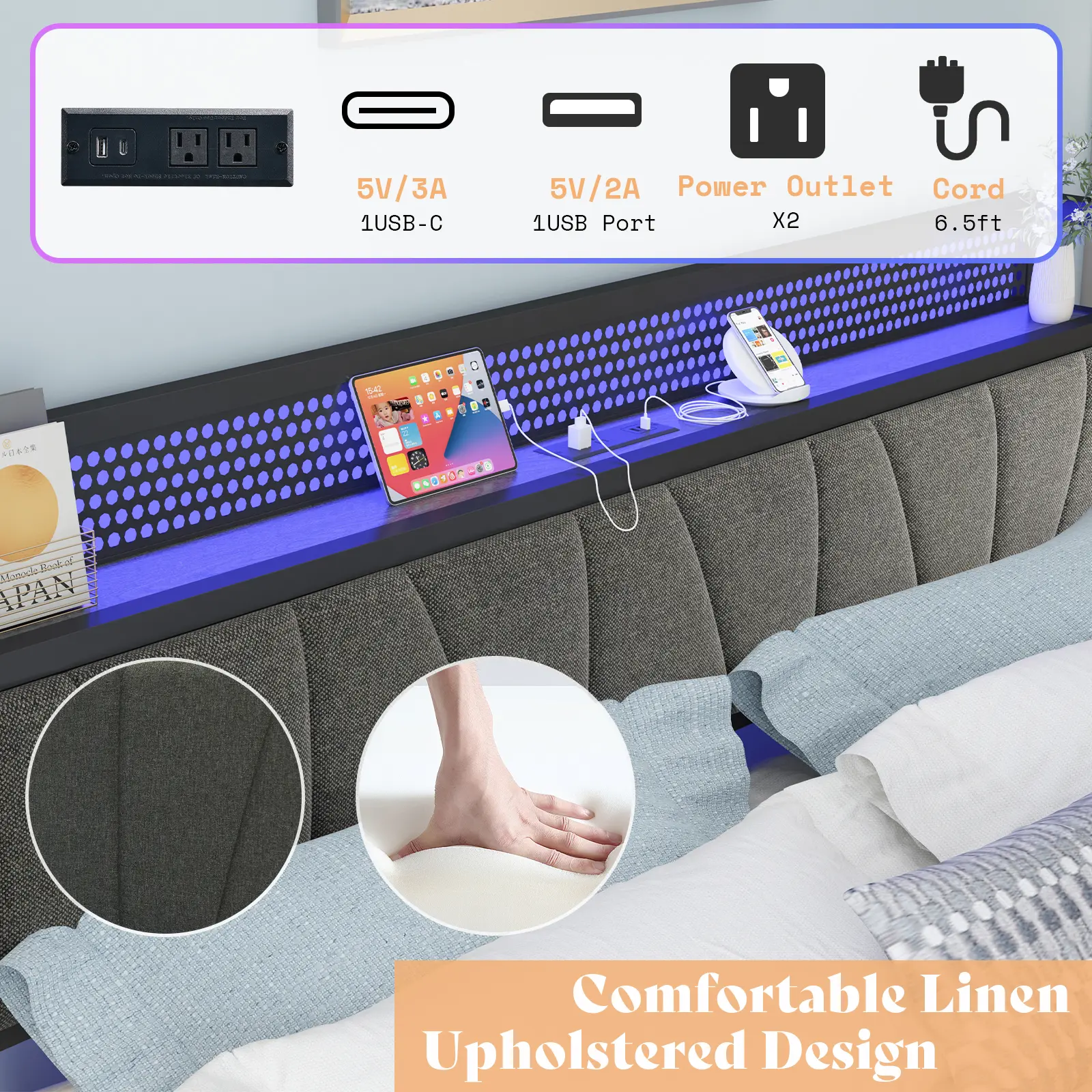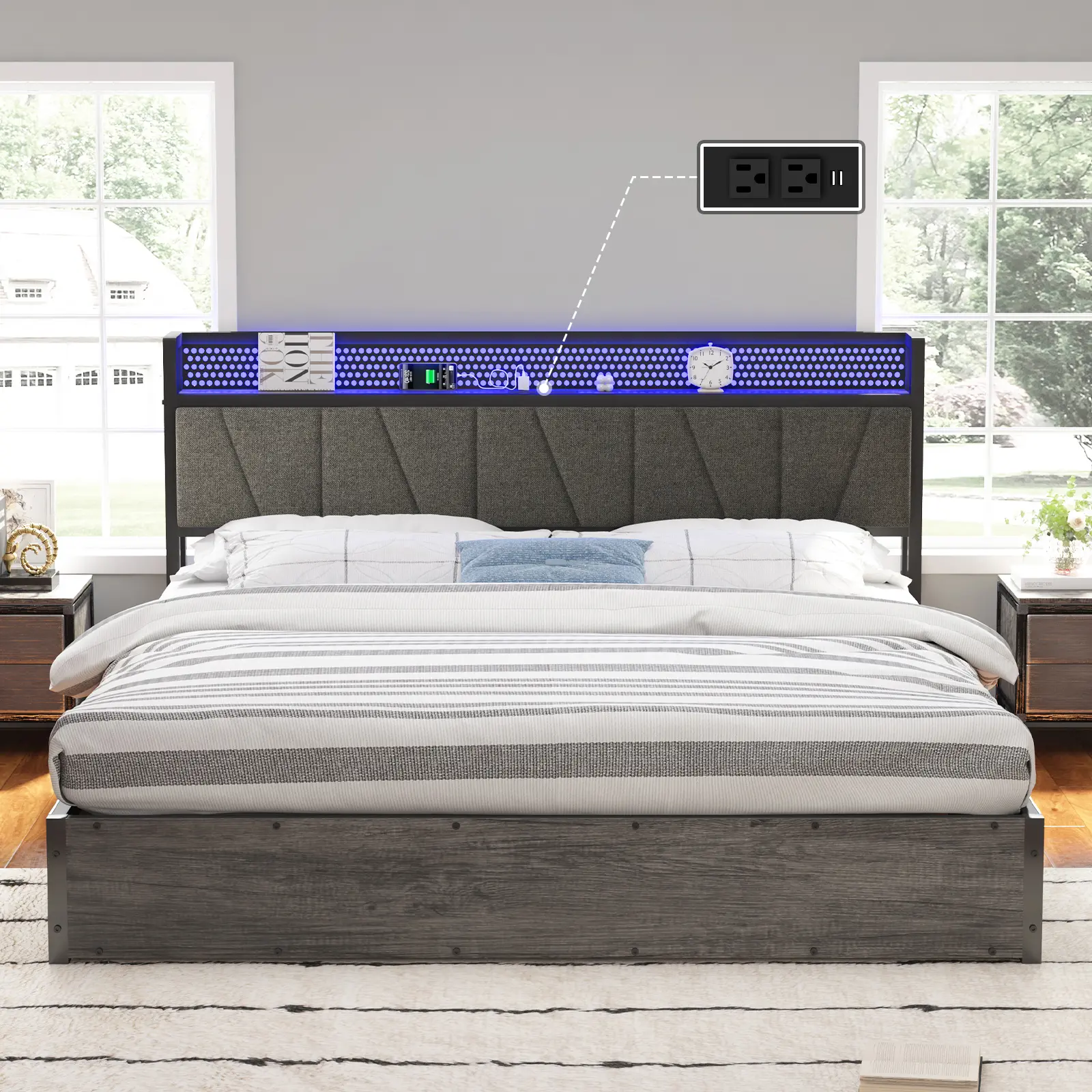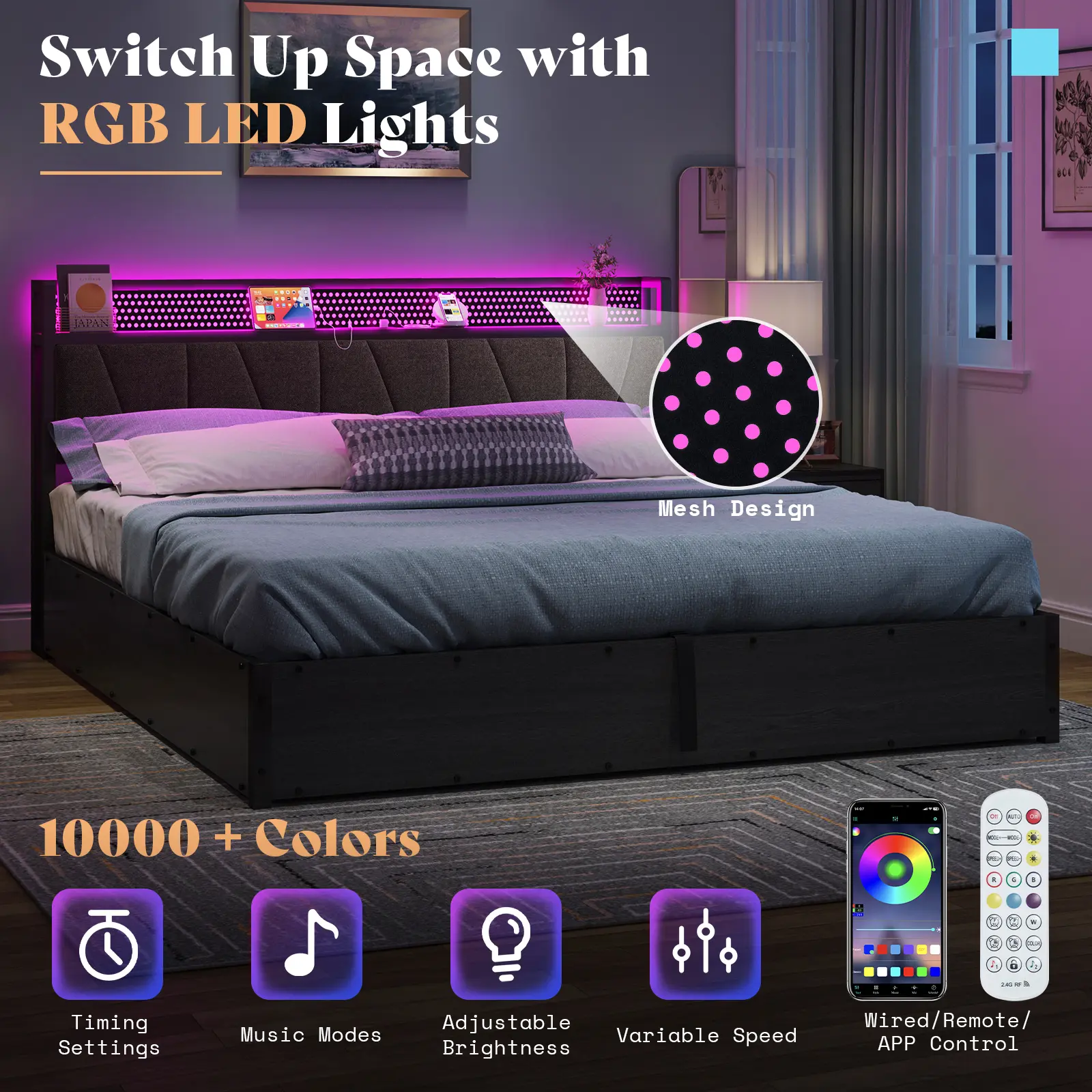 【Customizable LED】Elevate bedroom ambiance with RGB LED bed frame. Over 1000+ colors, adjust brightness, and enjoy music mode, controllable via remote control, app, or manual control.