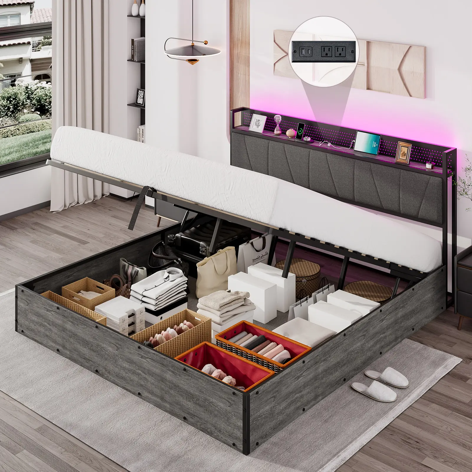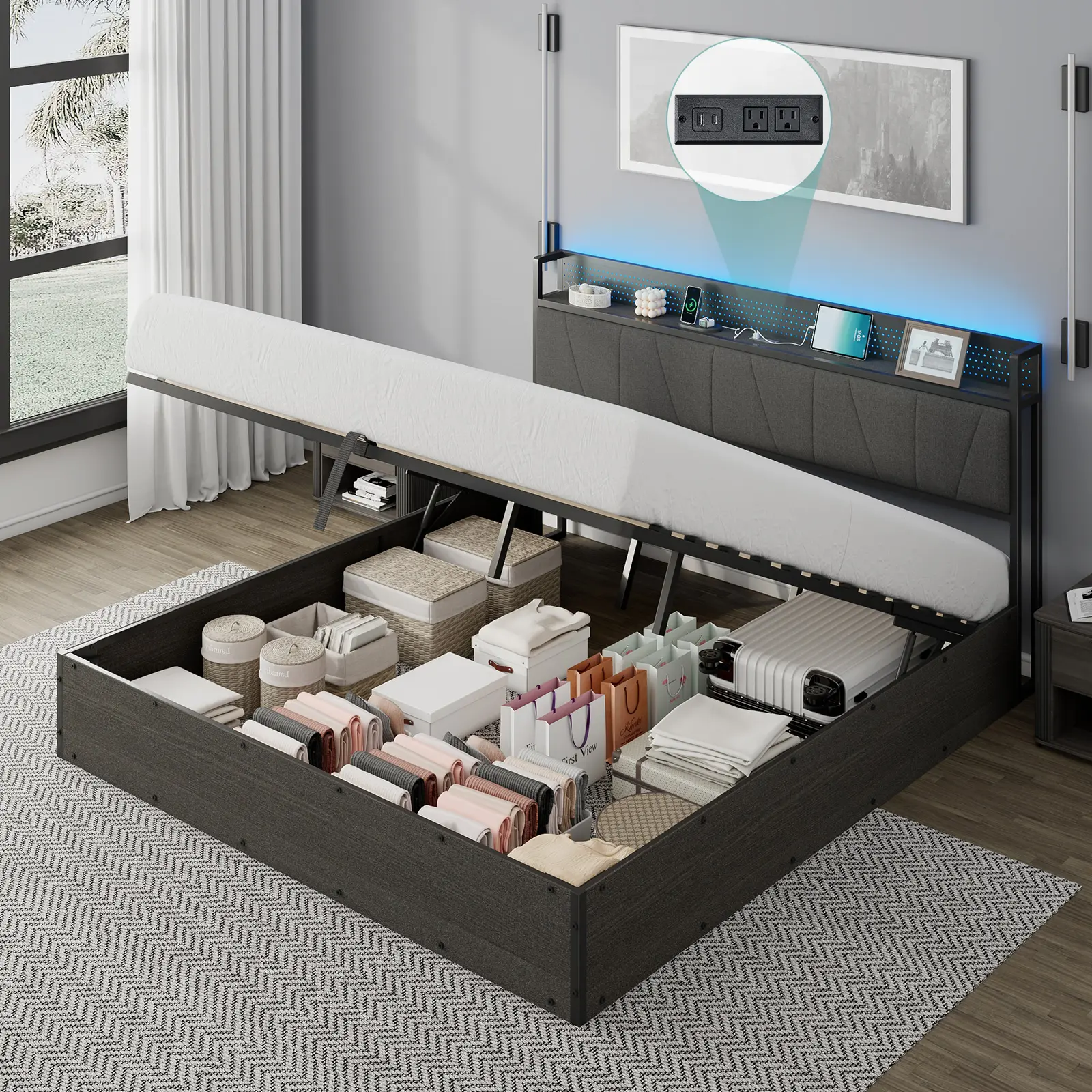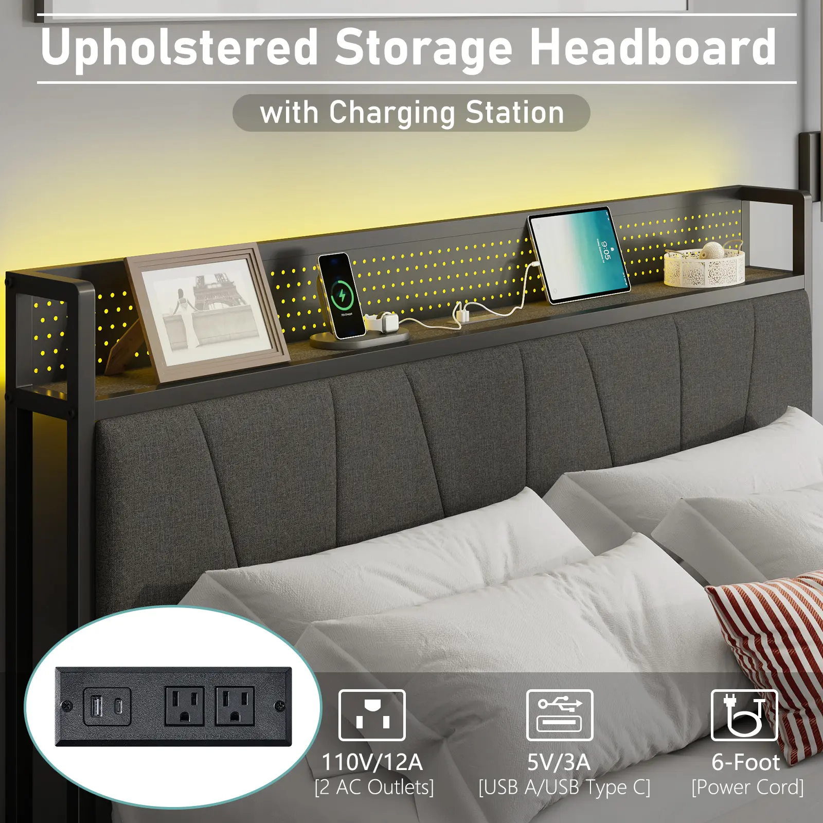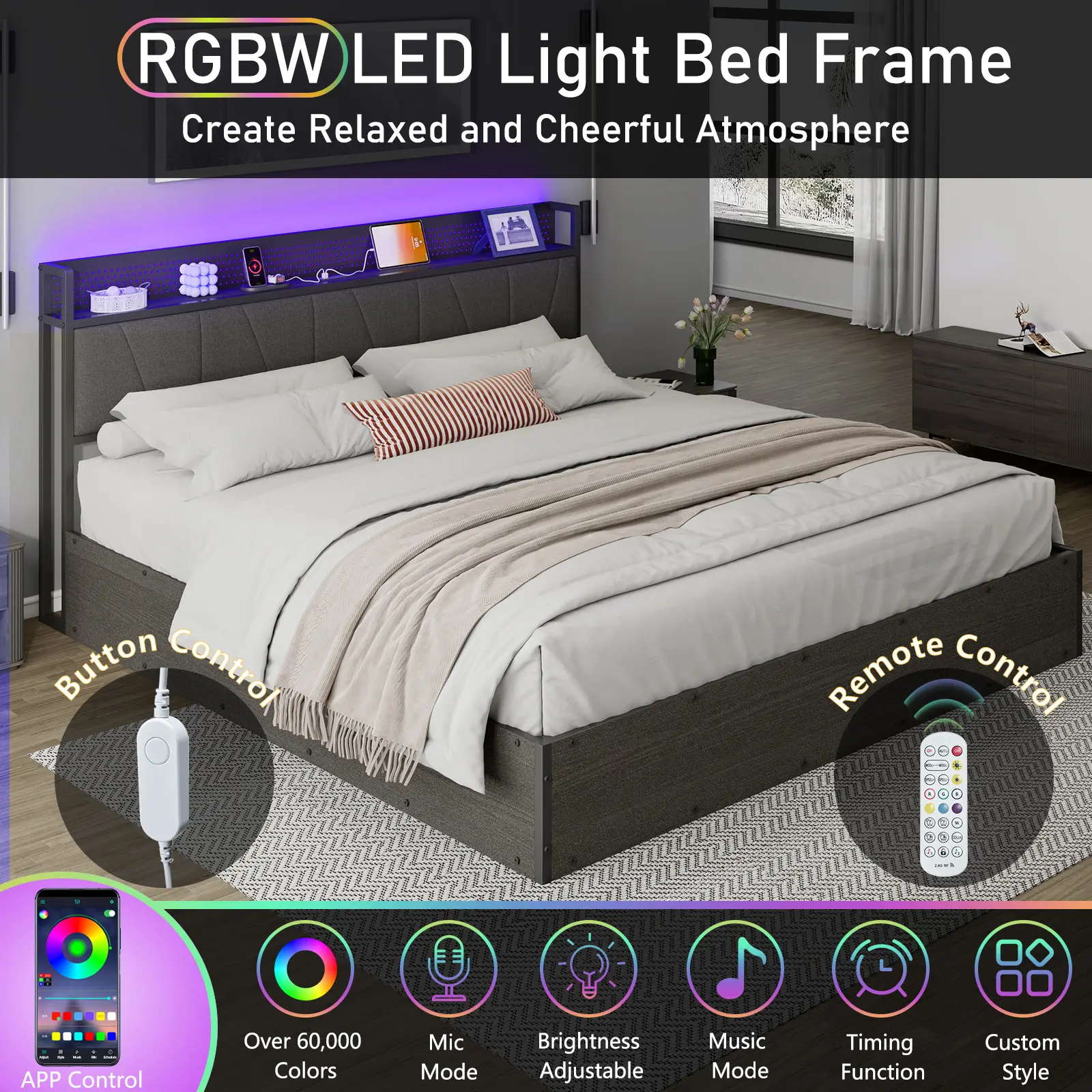·RGBW LED Upholstered Headboard: bed frame with 2-tier storage headboard not only has open storage space but also a charging station. Smart RGBW LED light is available for you to create a relaxing atmosphere.
