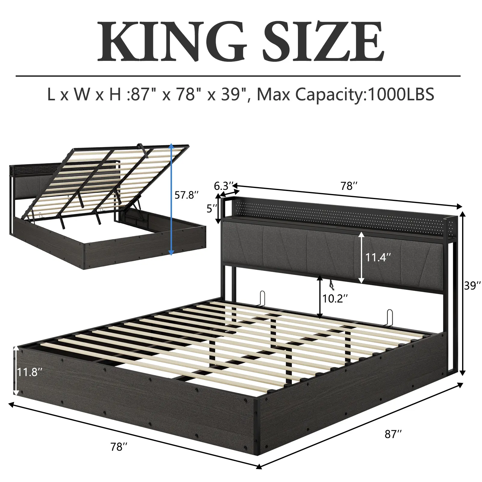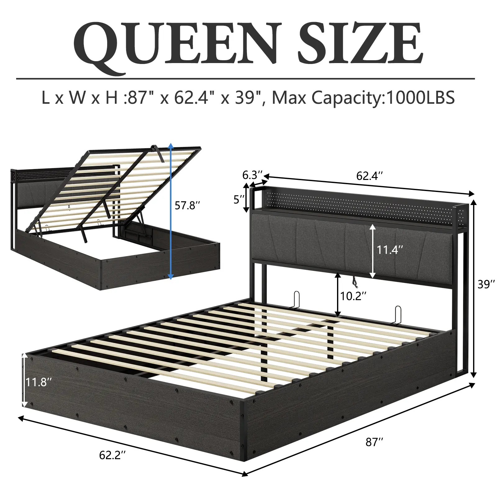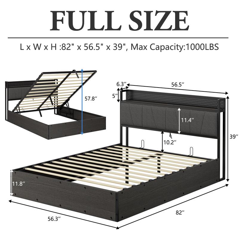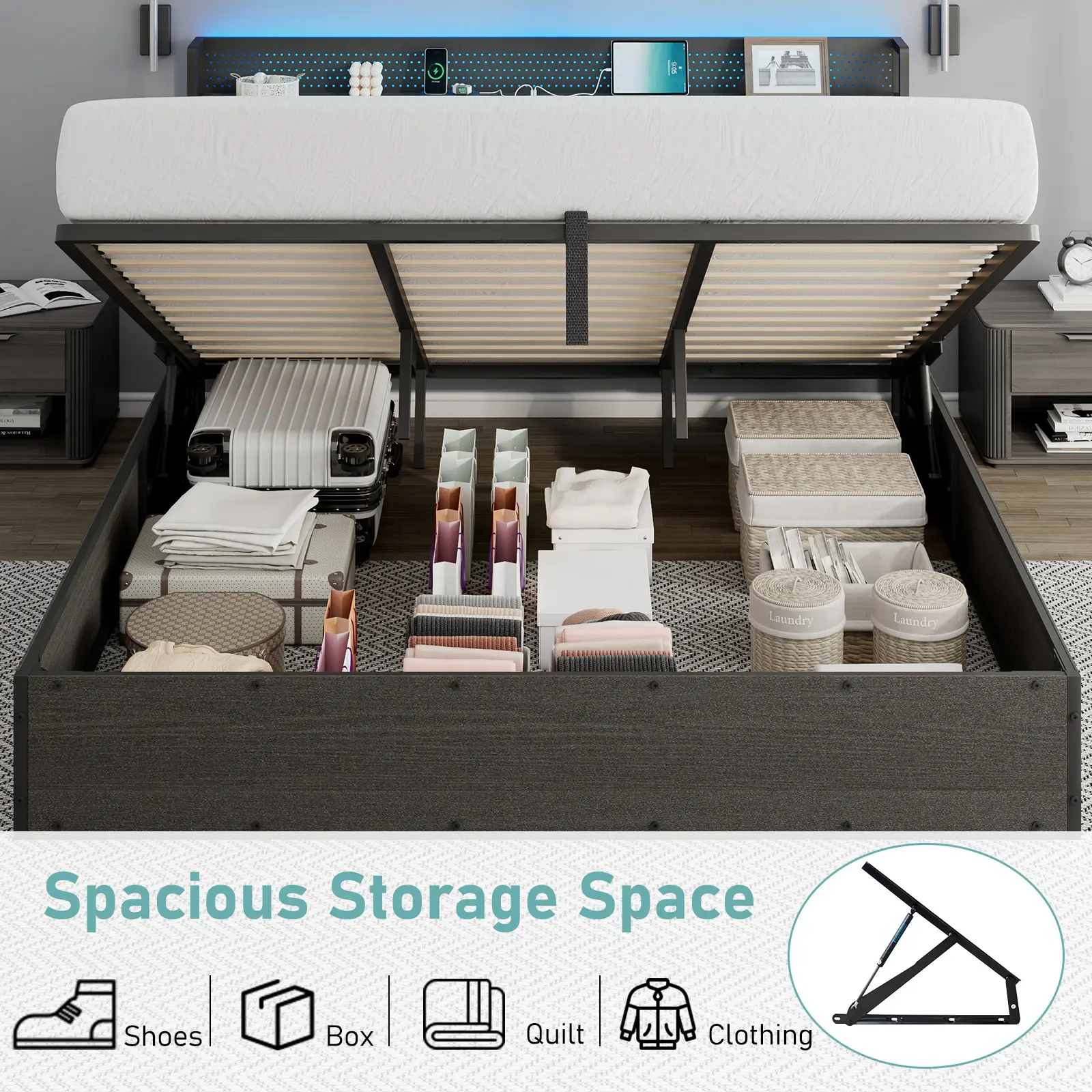 ·Underneath Storage & Space-Saving: Lift-up storage bed allows large underneath space to be used to store bedding, suitcases, and coats. Maximize every inch of your bedroom and say goodbye to a cluttered room.