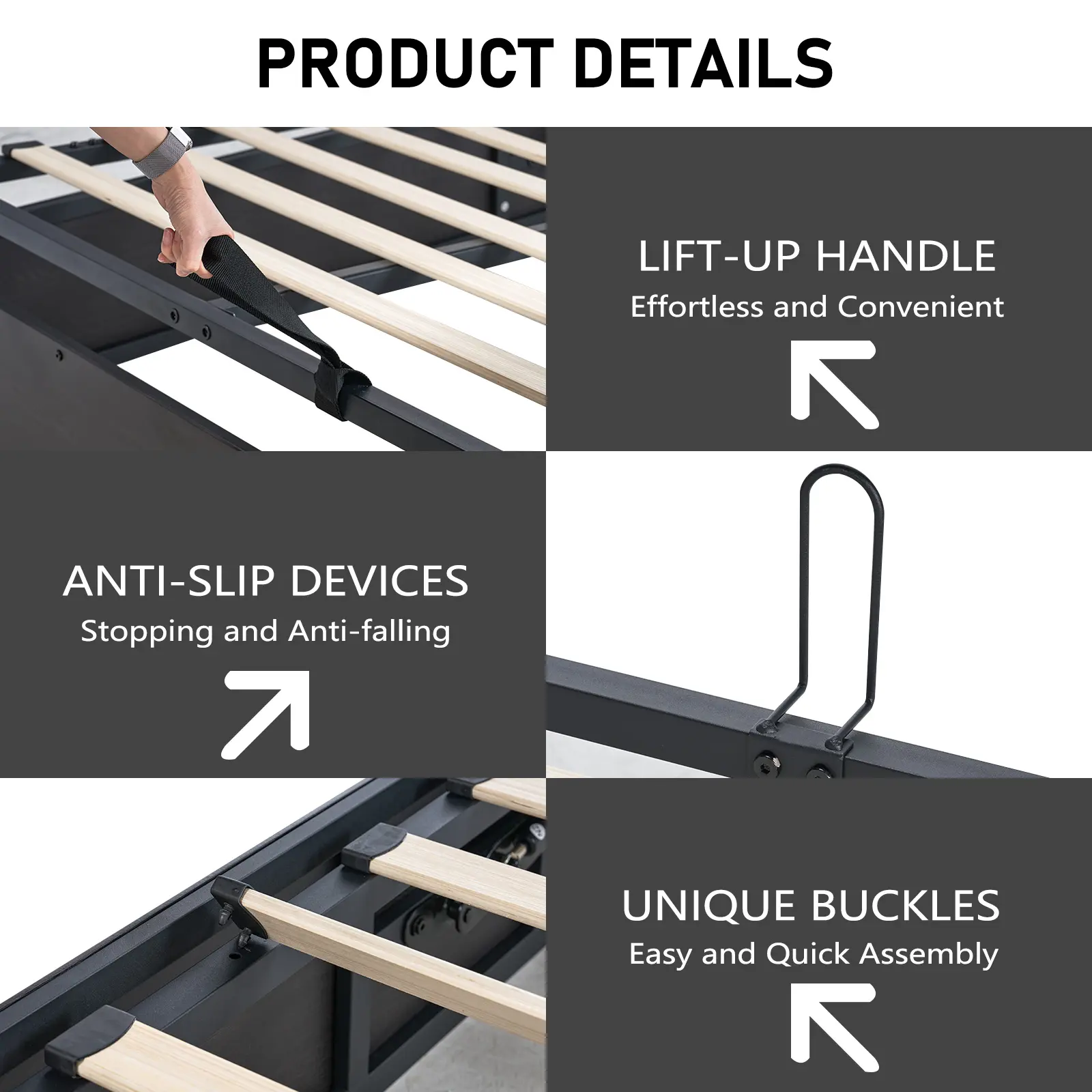 ·Lifting Mechanism: Lift-up bed frame adopts hydraulic lifting mechanism technology to make the platform pop up effortlessly. Anti-slip device on the back of the frame doesn't need to worry about the mattress sliding.