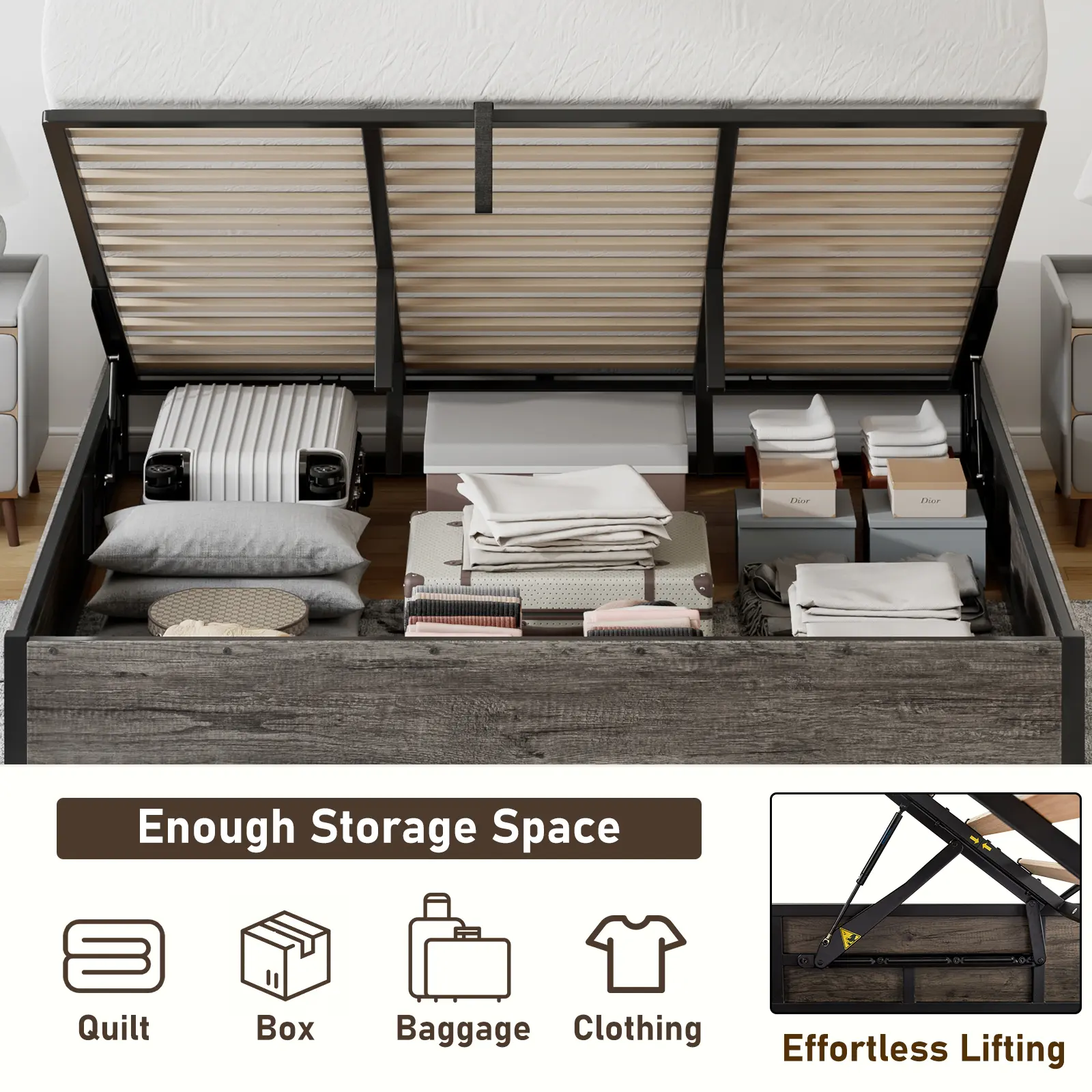 Β·AMPLE STORAGE-Lift-up design provides complete and ample under-bed storage space. Placing suitcases, seasonal clothing other large items, saves your home space, make your life more tidy and orderly.