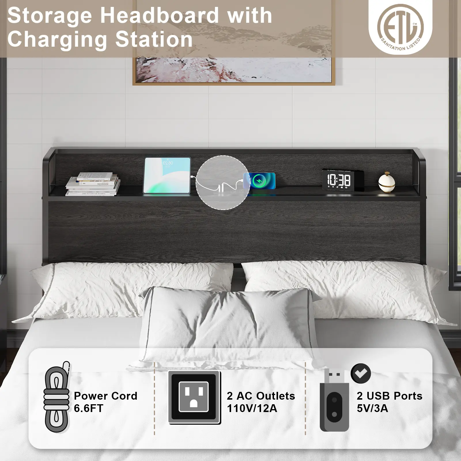 ·Chic Headboard: The wooden headboard not only has ample open storage space but also a charging station. Rounded edges & hollow design add a sophisticated touch of the bed frame.