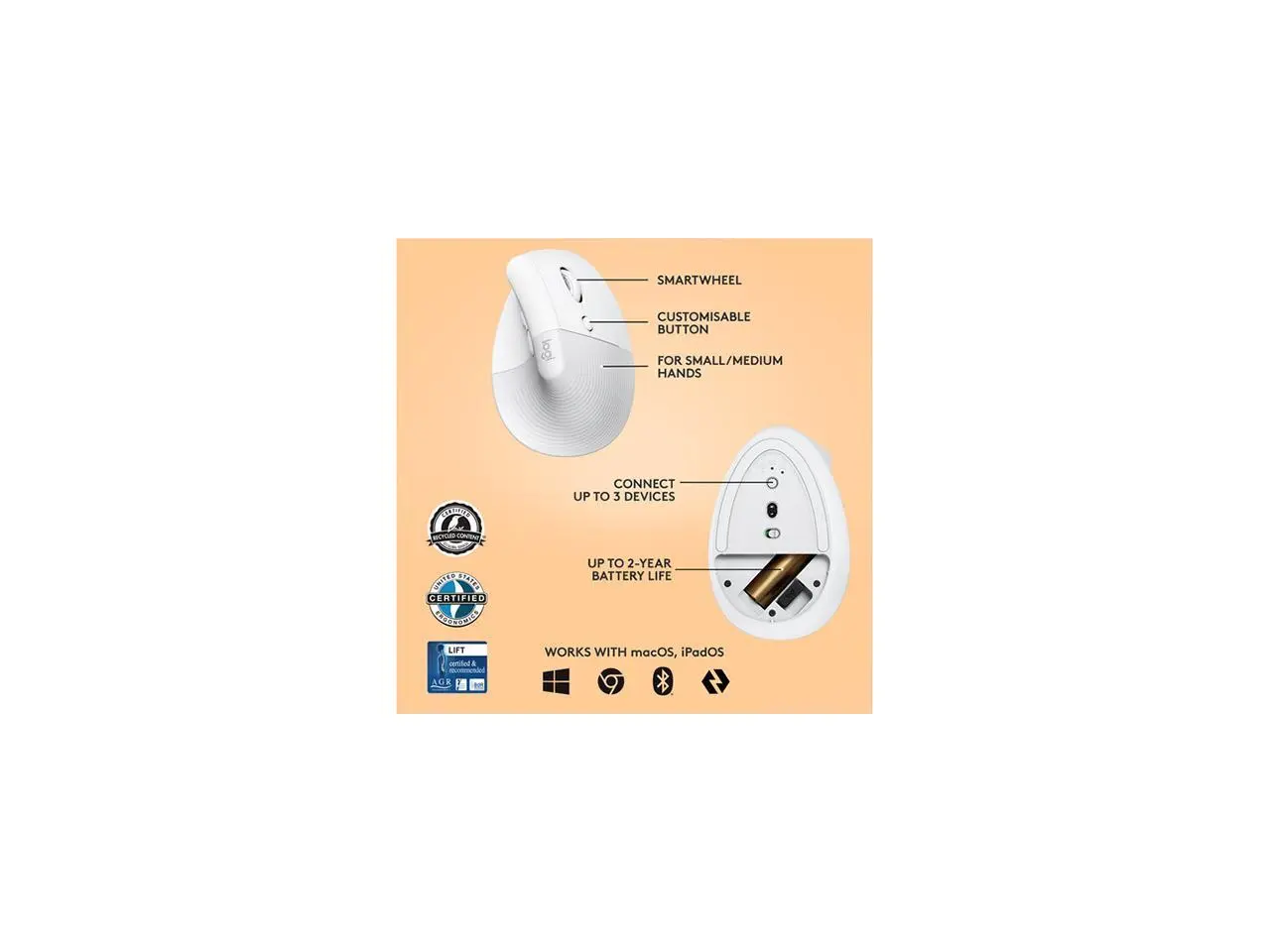 Logitech Lift Vertical Ergonomic Mouse, Wireless, Bluetooth or Logi Bolt USB receiver, Quiet clicks, 4 buttons, compatible with Windows/macOS/iPadOS, Laptop, PC - Off White