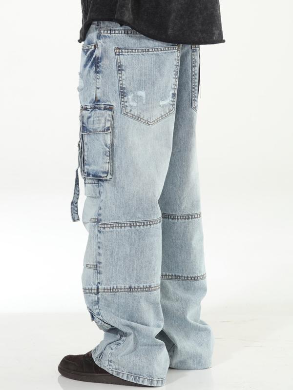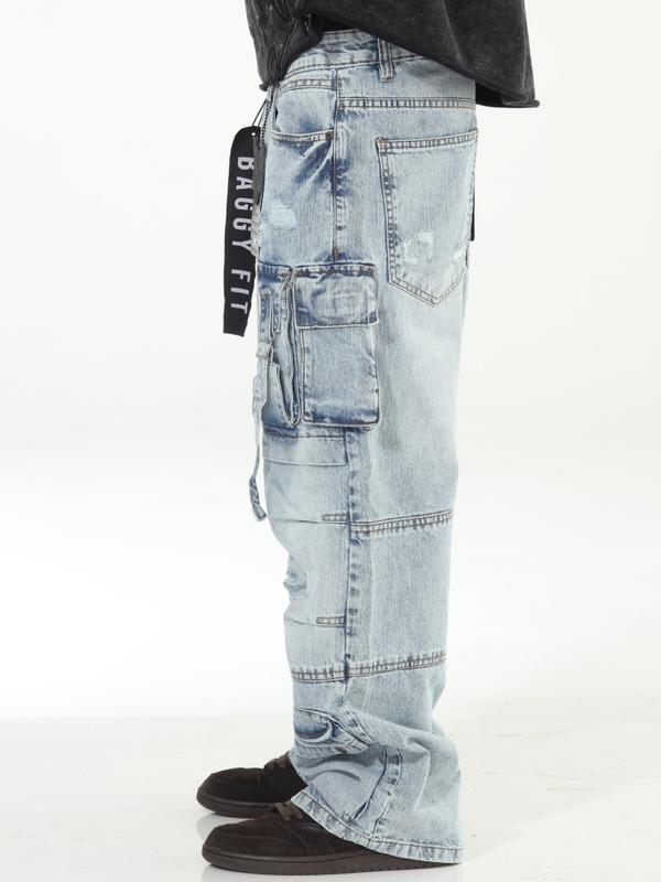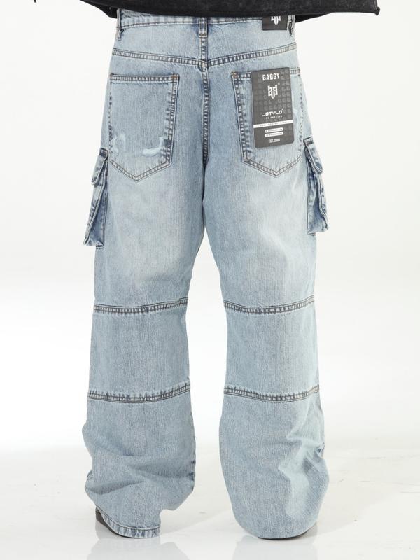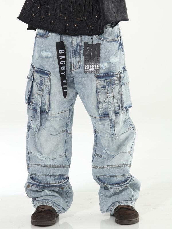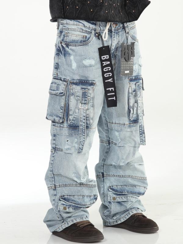 Light Blue Baggy Skater Buckled Jeans with Cargo Pockets Distressed Design for Men Casual Menswear Denim Streetwear Operator Trouser Pants