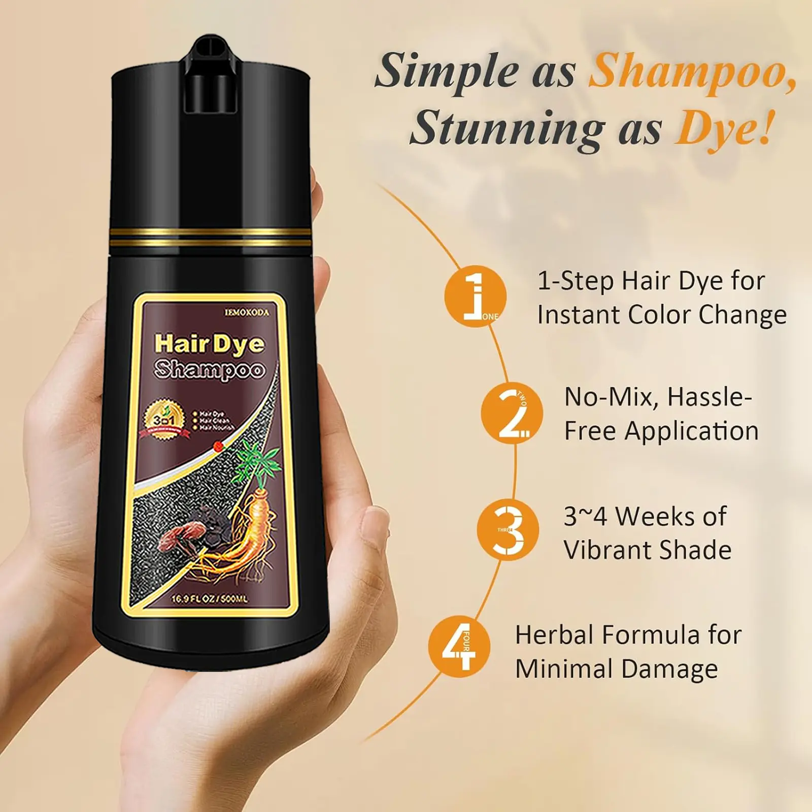 【Save Your Pocket and Time】: Salon-worthy results, minus the salon price tag! 17.6 Fl Oz hair dye shampoo will last for around 10 applications. Long-lasting color lasts up to 3-4 weeks. With our shampoo that dyes your hair in the comfort of your home and maintain youthful hair color in just a fraction of the time.