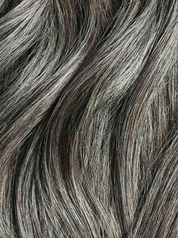 This is a sample swatch of the Light Gray Luxy Hair shade. A light gray base with medium gray strands, this warm-toned greige salt and pepper shade lets you get back to your roots.