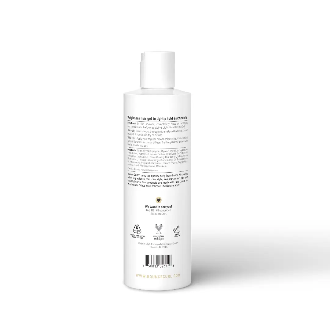 Bounce Curl Light Hold Creme Gel provides a lightweight touch to enhance curl definition, leaving wavy and curly hair soft and naturally styled. This gel supports touchable curls with a gentle hold, suitable for creating naturally styled looks without weighing down the hair.