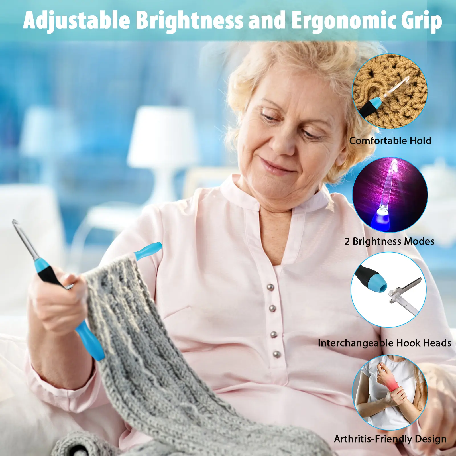 I love all of the hook attachments and the light. The light has 2 brightness levels 1 bright & 1 dim which makes it easier on the eyes when crocheting in the dark or poorly lit rooms.