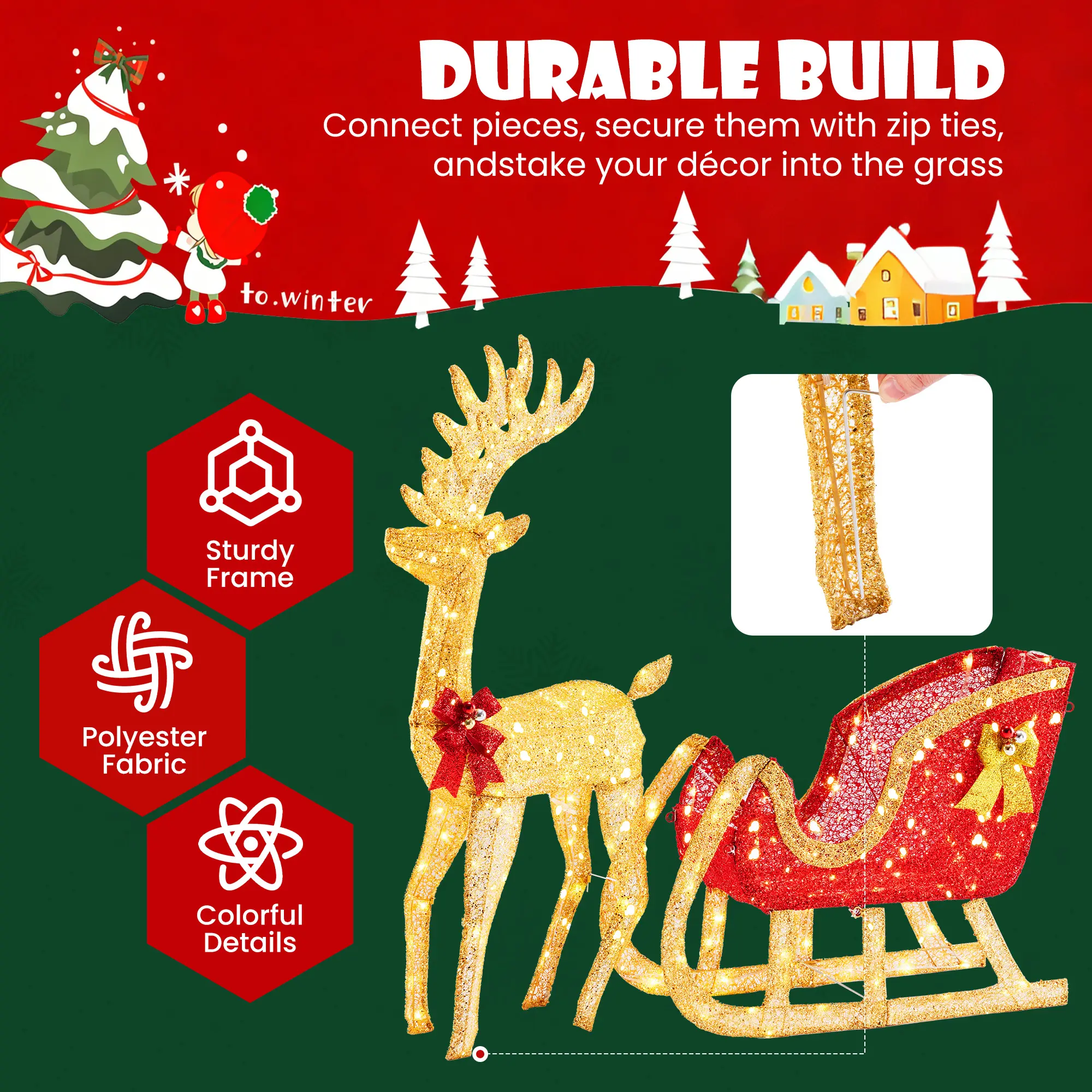 ·ELEGANT DETAILS: Celebrate the season with a cheery snapshot of a reindeer pulling Santa's sleigh, intricately designed with festive details like decorative bows and a shimmery fabric; REINDEER DIMENSIONS: 23"(L) x 13"(W) x 48"(H); SLEIGH DIMENSIONS: 36"(L) x 10"(W) x 27"(H)
