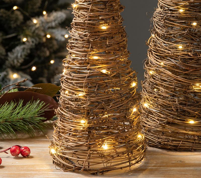 This set of 2 table trees are hand-made by rattan, look like a circular cone which twined by LED string, it brings you with dense festival atmosphere, you can use it as two decorations or set up as one, either of them will be the perfect holiday touch to your home. Dimensions: 6.75"L x 6.75"W x 24"H; 6"L x 6"W x 18"H Handcrafted Made of durable rattan Unique cone tree shape design with LED strings makes it with high artistical value Warm LED lights with 30 bulbs, total 60 bulbs, 2AA batteries required but not included For indoor use only;Table Decor x2