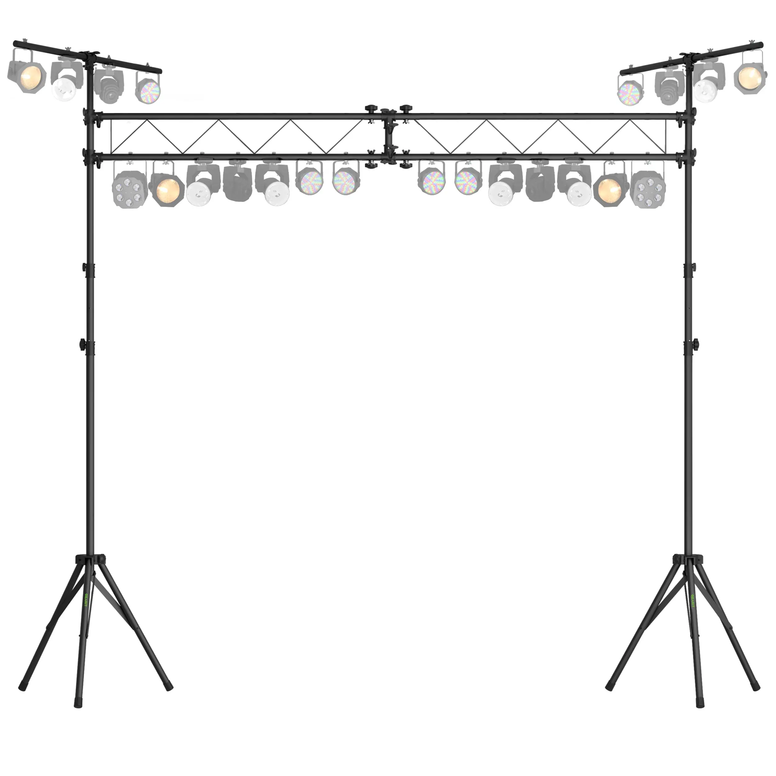 ·Stage Truss System for DJ Lights and More - This complete lighting stand system features two 5 ft. truss rods combining for 10 ft. of mounting space for PAR lights, strobe lights and other effects, supported with two 12 ft. tripod stands with full-size T-bars.