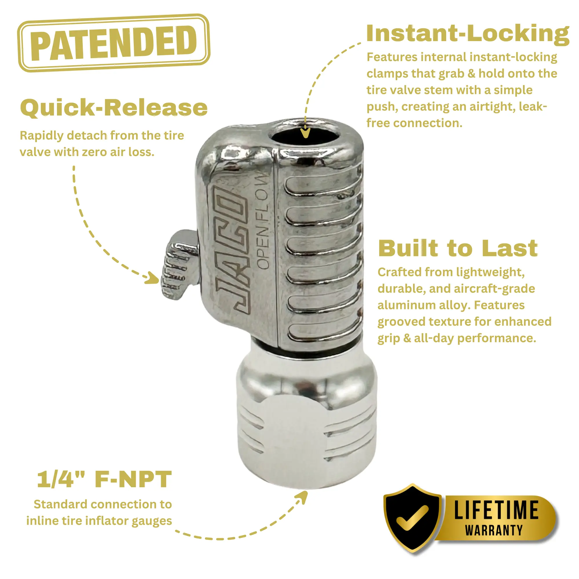 ·OPEN FLOW: Air passes freely through the chuck whether or not the chuck is engaged with the tire valve stem. For use with inline tire inflation tools. Not suitable for direct connection to pressurized airline.