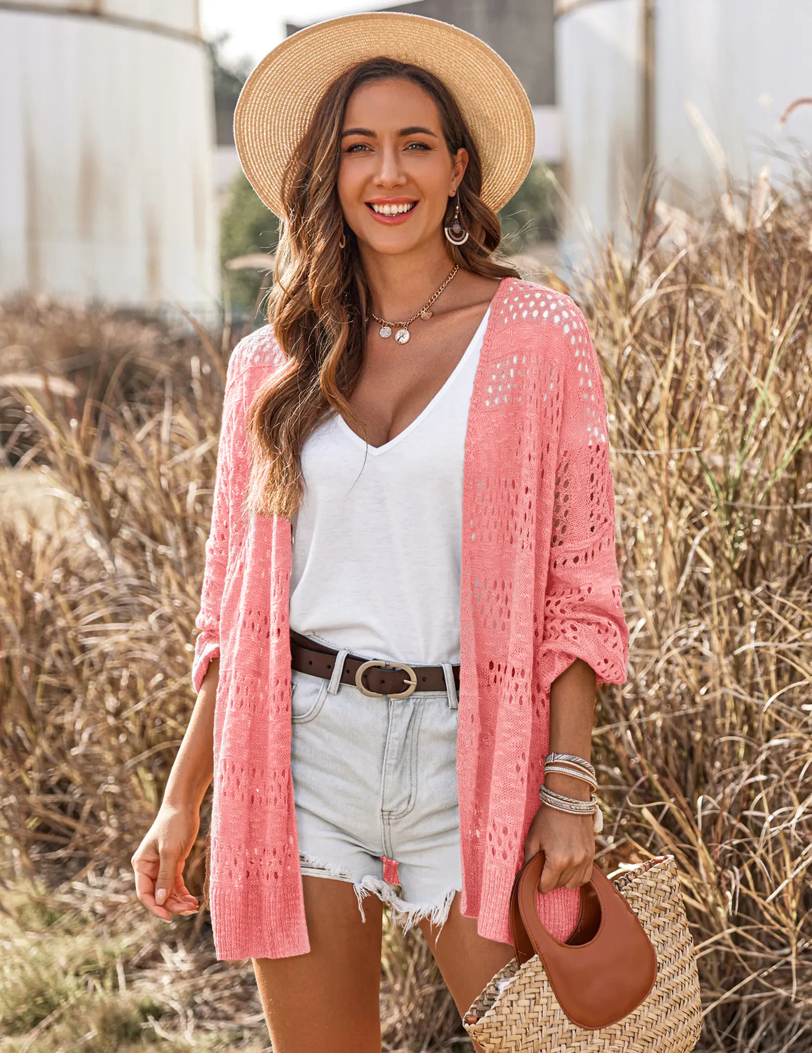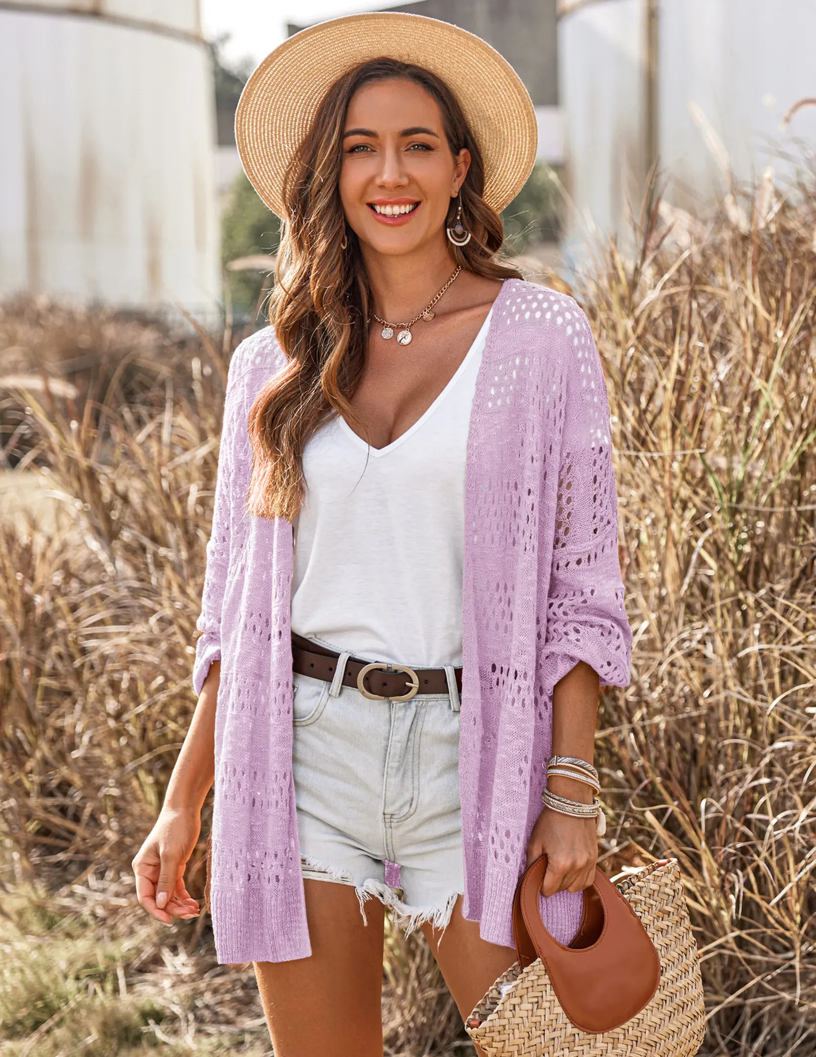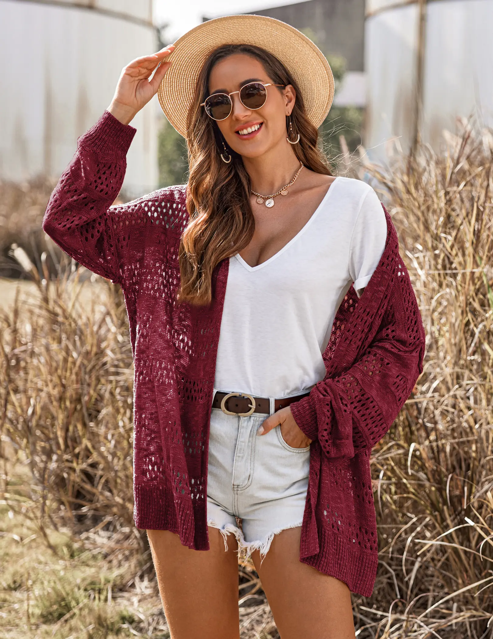 ·Lightweight Crochet Cardigan - This perfect fit hollow out cardigan has a vintage vibe that makes them irresistible! Features a batwing sleeve, nice length, solid colors, unique crochet knit design, and an open front.