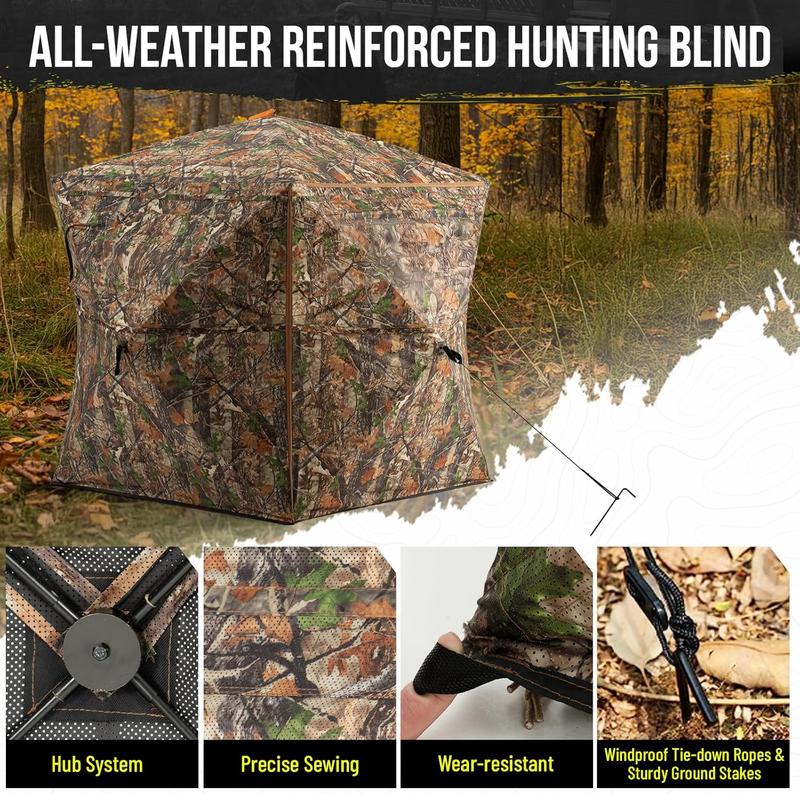 4 one-way see-through panels give full panoramic views. Camo pattern + silent adjustable windows + built-in loops let you disappear into nature while seeing everything.