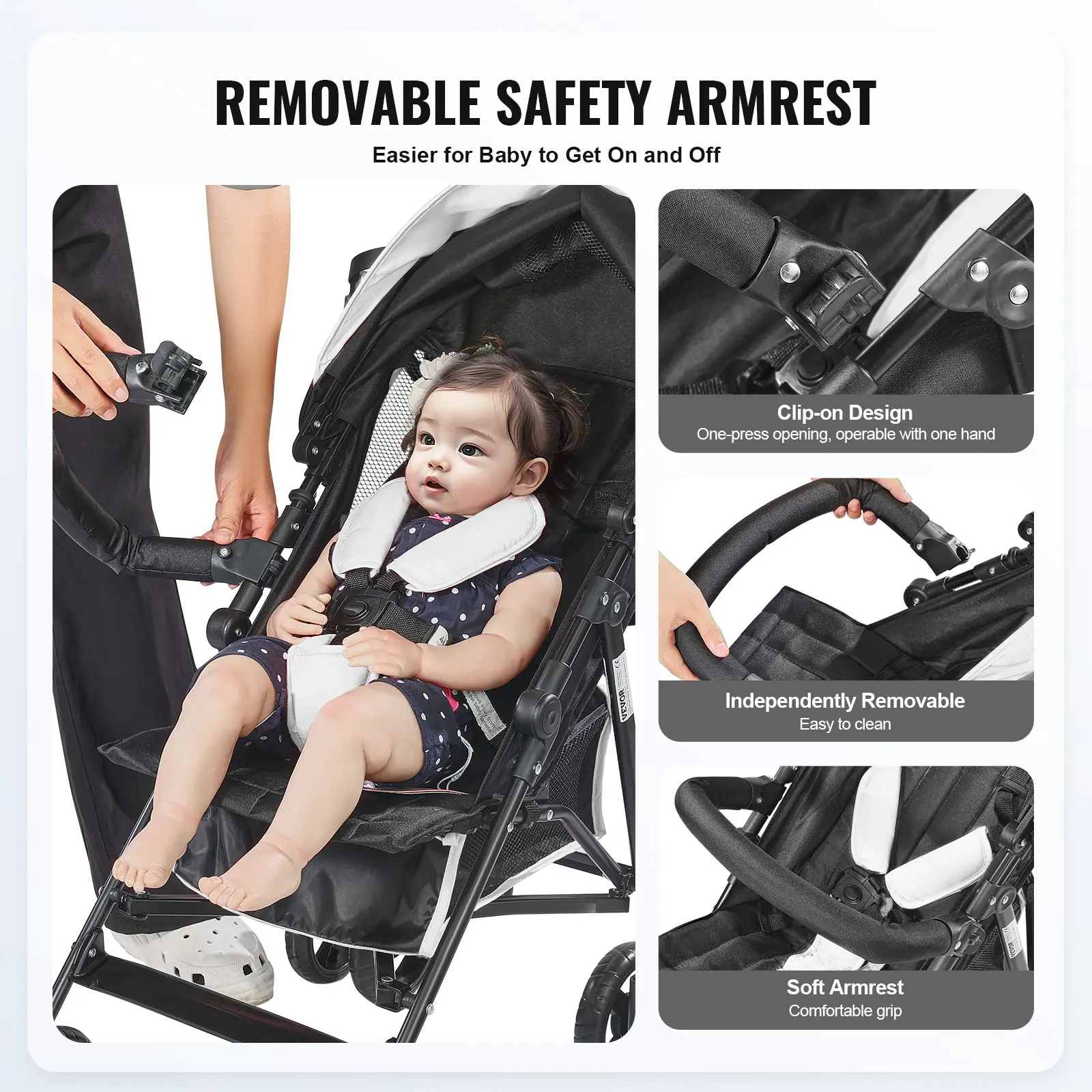 • Safe and Reliable: For active and lively babies, the compact travel stroller comes with a detachable front bar and a user-friendly buckle design for one-hand operation. The five-point safety harness provides double protection to prevent accidental tipping, ensuring your baby's safety.