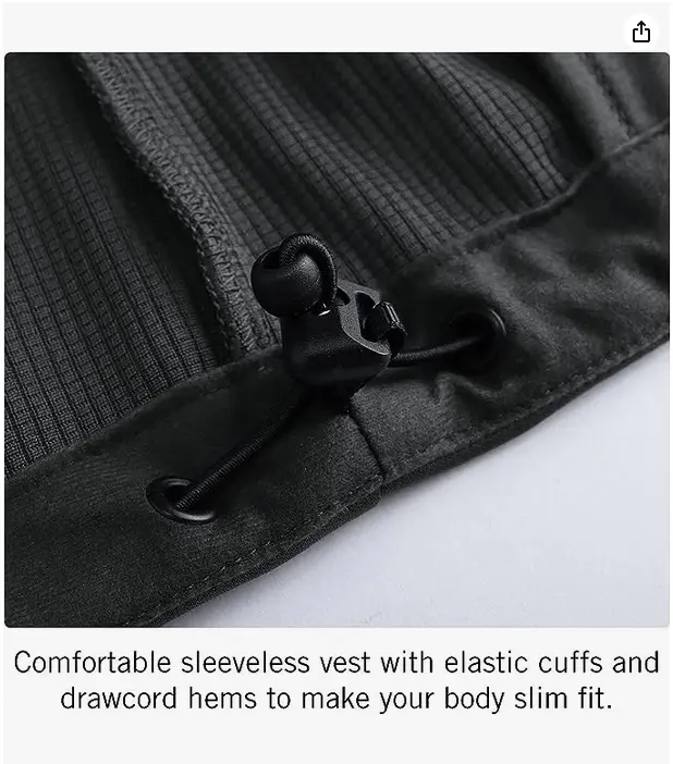 ·Comfortable sleeveless vest with elastic cuffs and drawcord hems to make your body slim fit.
