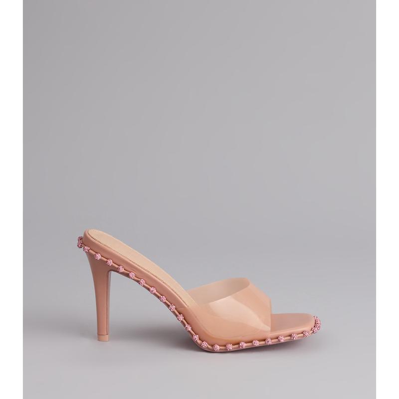 These heels don’t just walk, they shine. Featuring a square toe, colored PVC strap, and rhinestone embellished ball trim, these stilettos are all about glam with a twist.