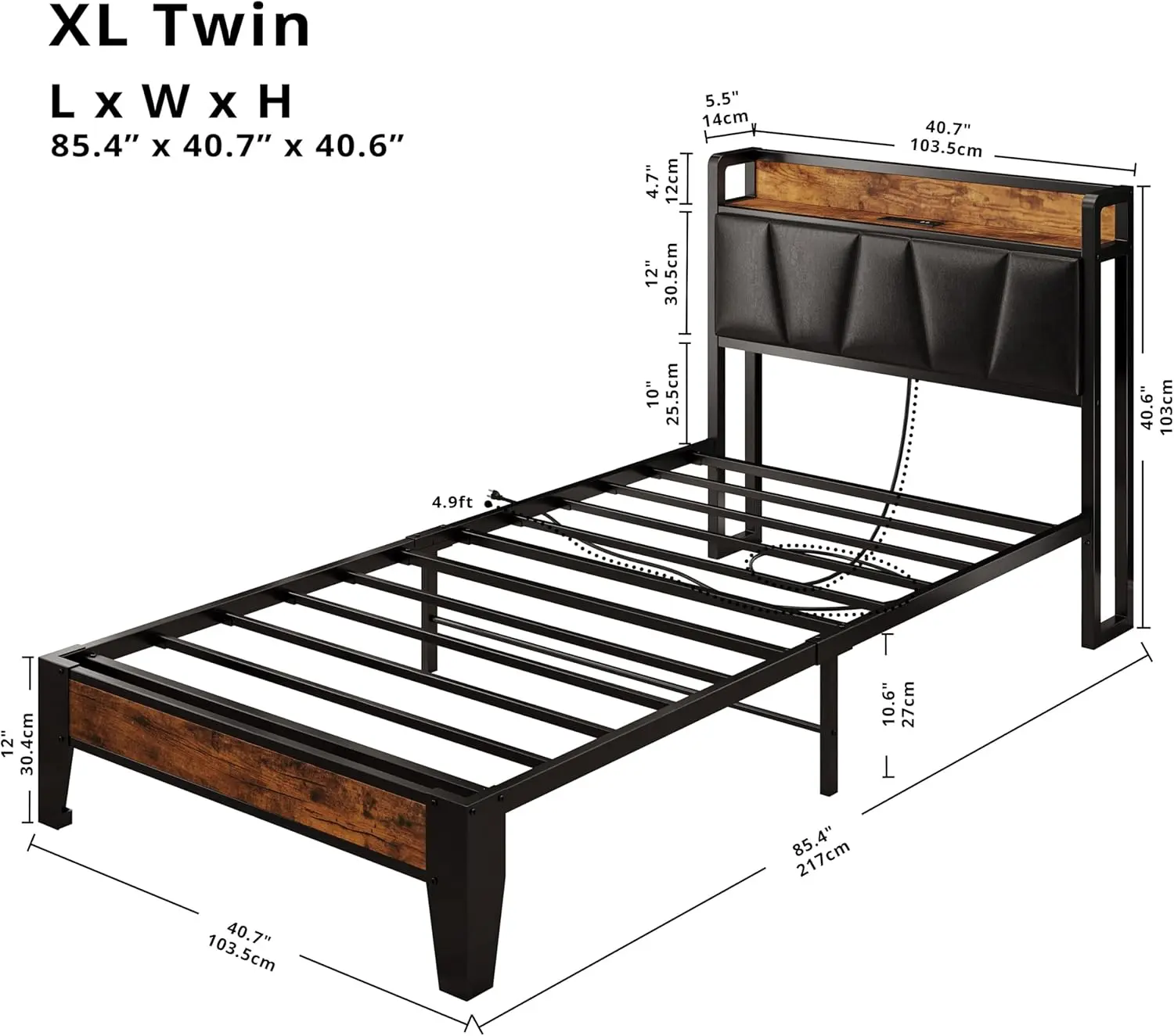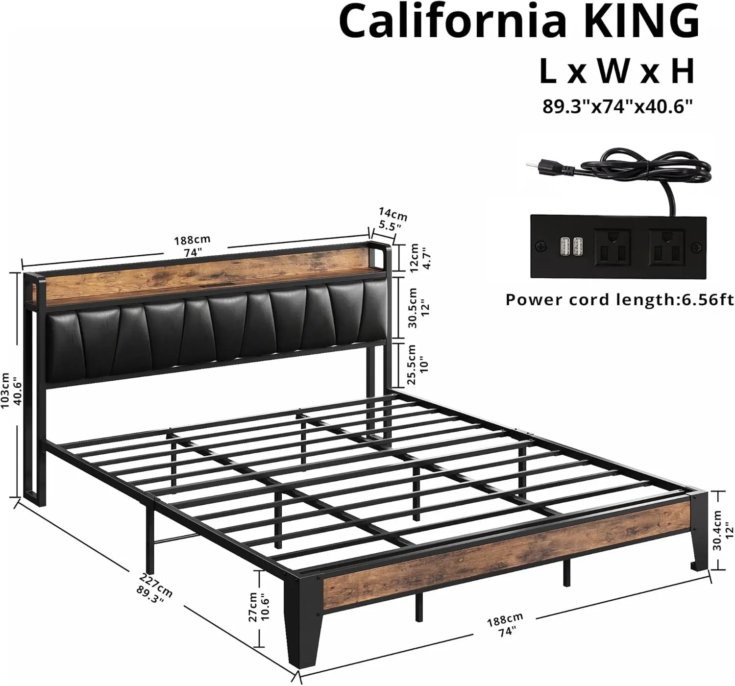 ·Storage Headboard with Charging Station: Two Standard Plug Outlets and USB Ports with Cable Management 5.9 ft long power supply cord. Make charging and common small items such as phones, glasses, and books within easy reach