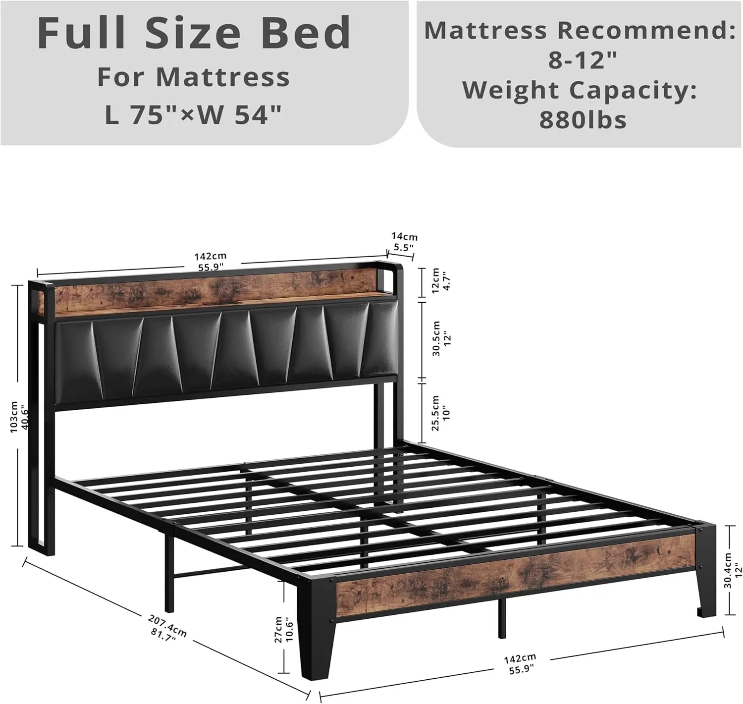 ·Practical and Comfortable: Vintage shelf and black PU upholstered headboard combine practical and comfortable to match any style of the room.