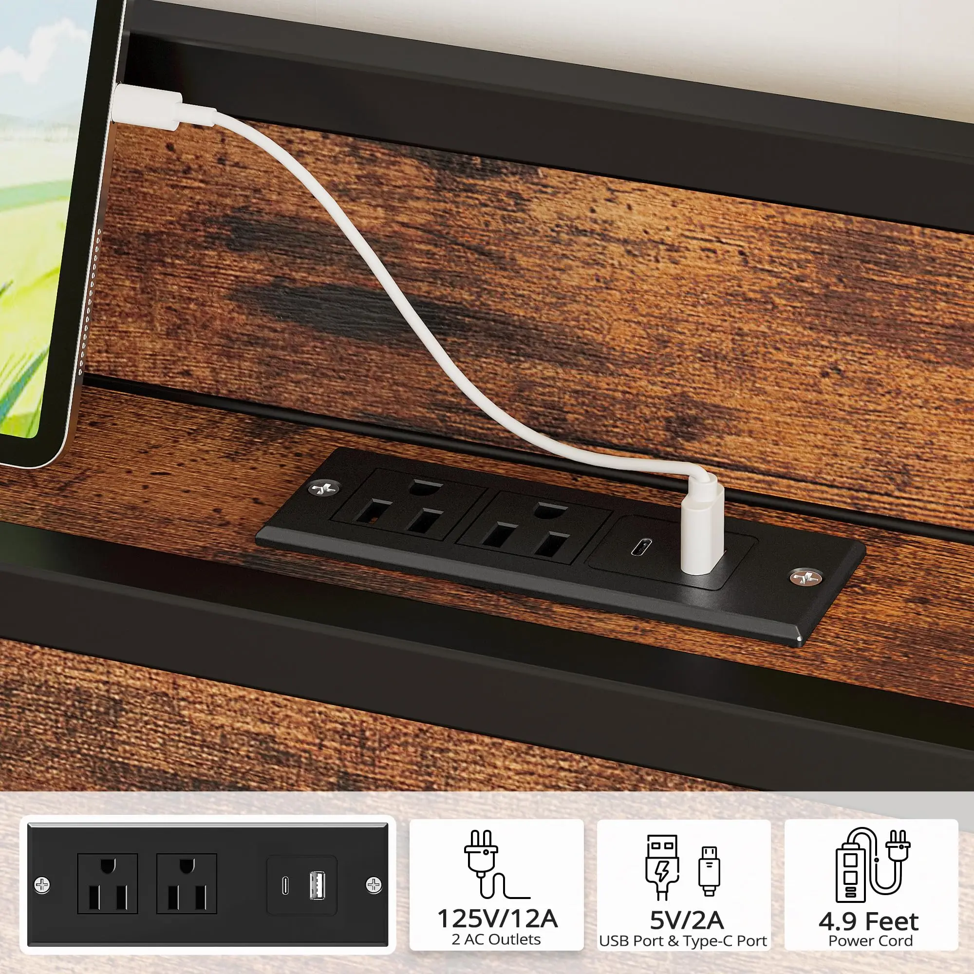 Headboard Charging Station: Charge while lying in bed! The headboard shelf features 1 USB port, 1 Type-C port, and 2 AC outlets. No need to get out of bed to find a socket when scrolling on your phone or using a tablet before sleep—convenient overnight charging
