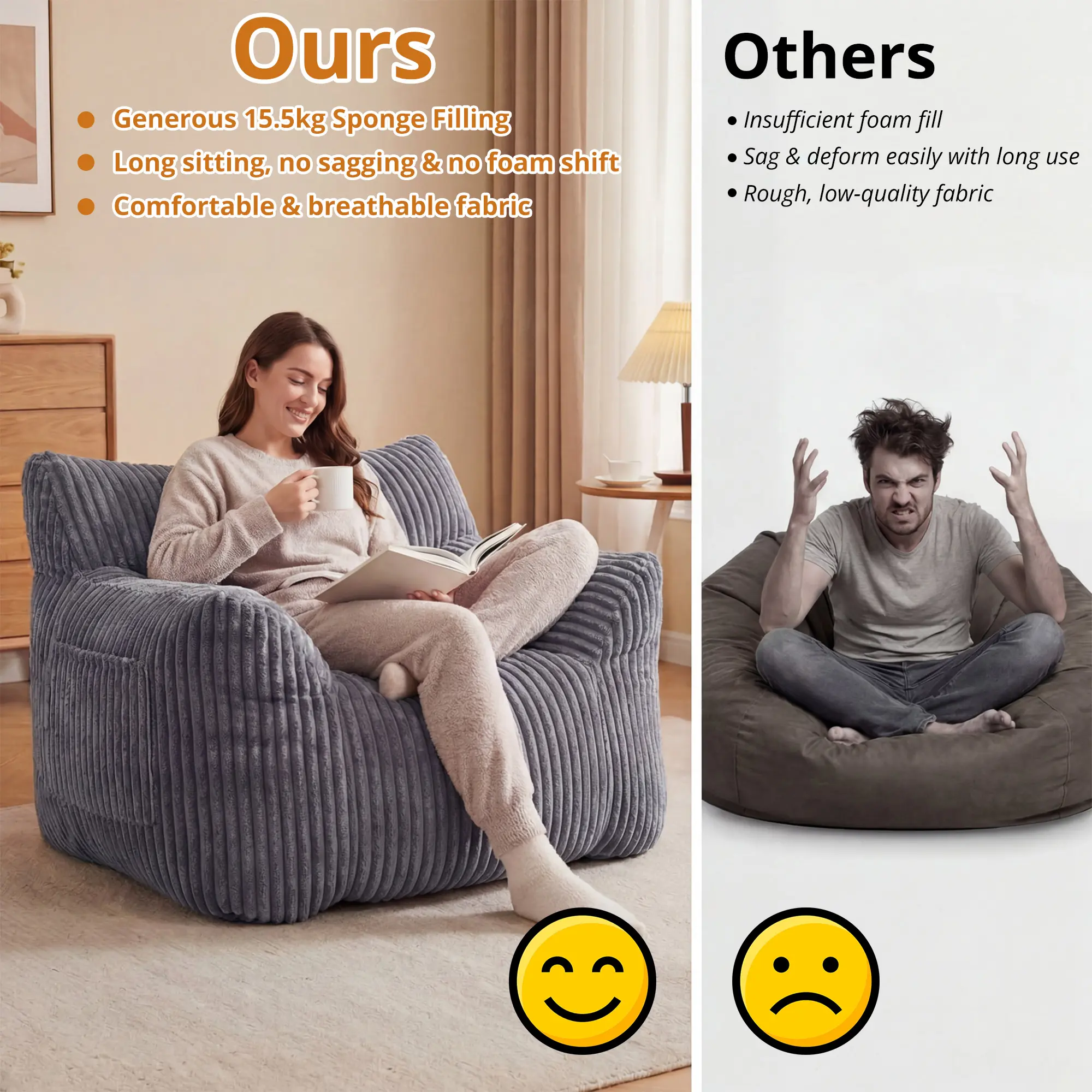 High-Density Foam Filling:Filled with 15.5 kg of high-resilience foam, it delivers excellent support and elasticity. The foam effectively disperses body pressure and prevents sagging even after prolonged use.