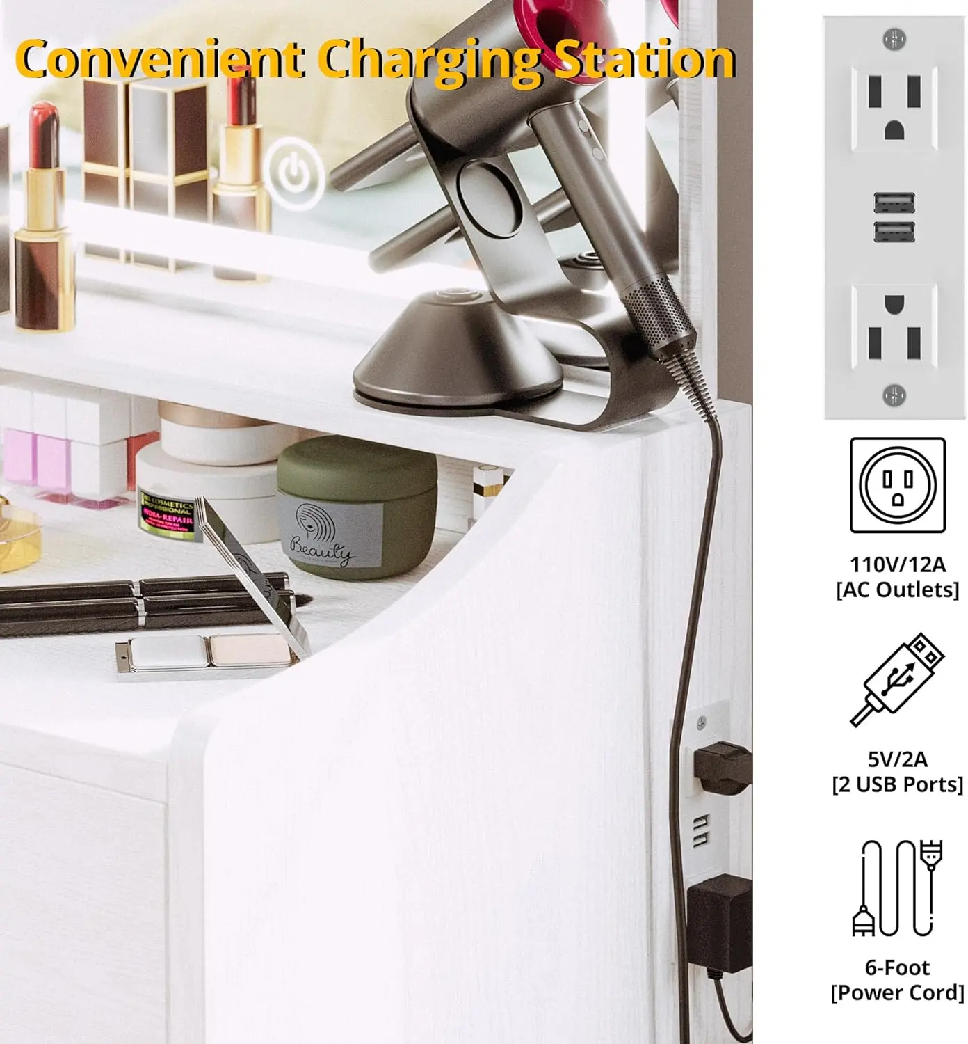 ·[Stylish and Versatile] Equipped with a charging station, convenient for charging hair dryers, mobile phones and other devices, Its smooth curved design is safe and adds a touch of elegance and sophistication to your bedroom