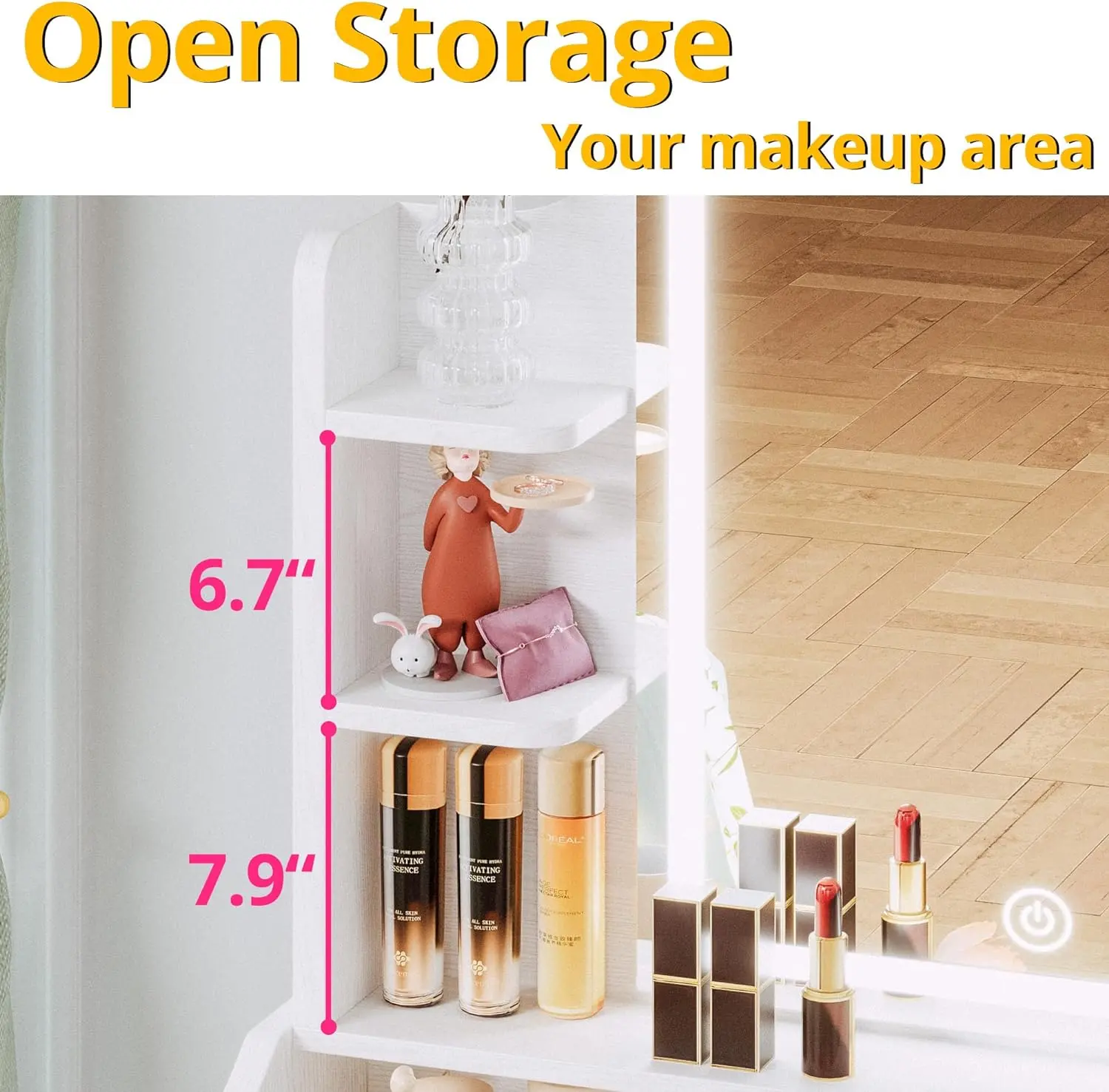 ·[Built-in mirror and lighting] Making it convenient for you to get ready in the morning or for a night out, the adjustable lighting allows you to create the perfect ambiance for your beauty routine.