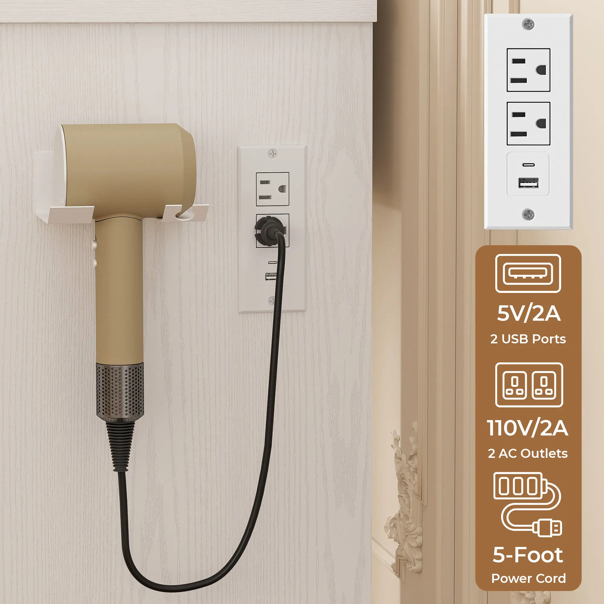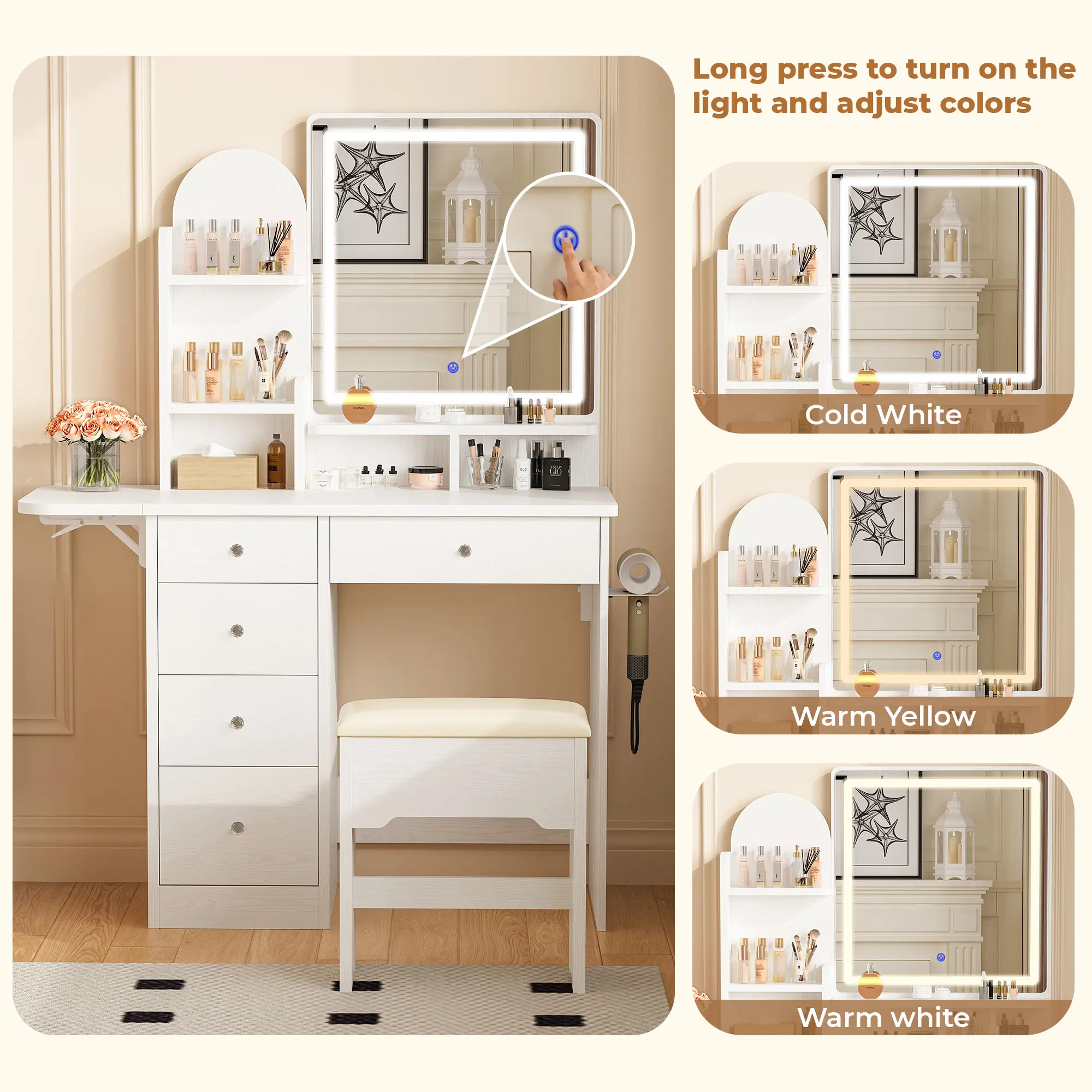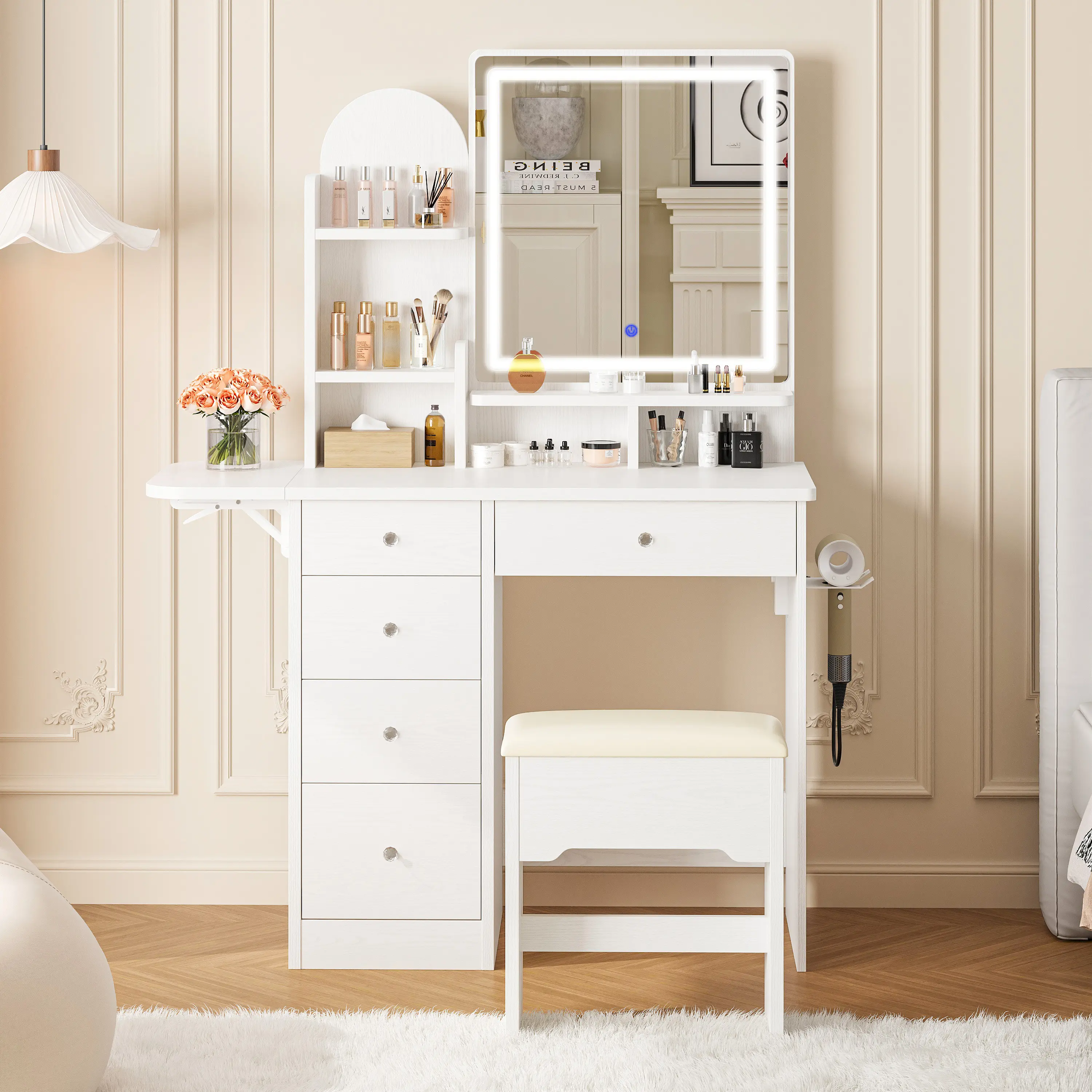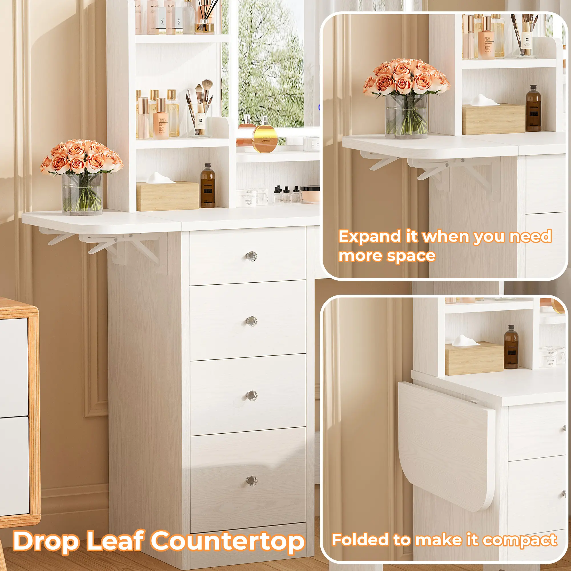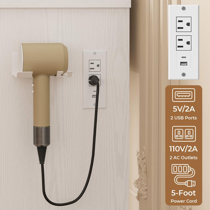 ·Versatile Vanity with Charging Station:The right side of the tabletop has a built-in charging station with 2 AC outlets and 2 USB ports, allowing you to power up your devices conveniently. Additionally, this small vanity comes with a hairdryer holder, keeping your dryer or curling iron within easy reach.