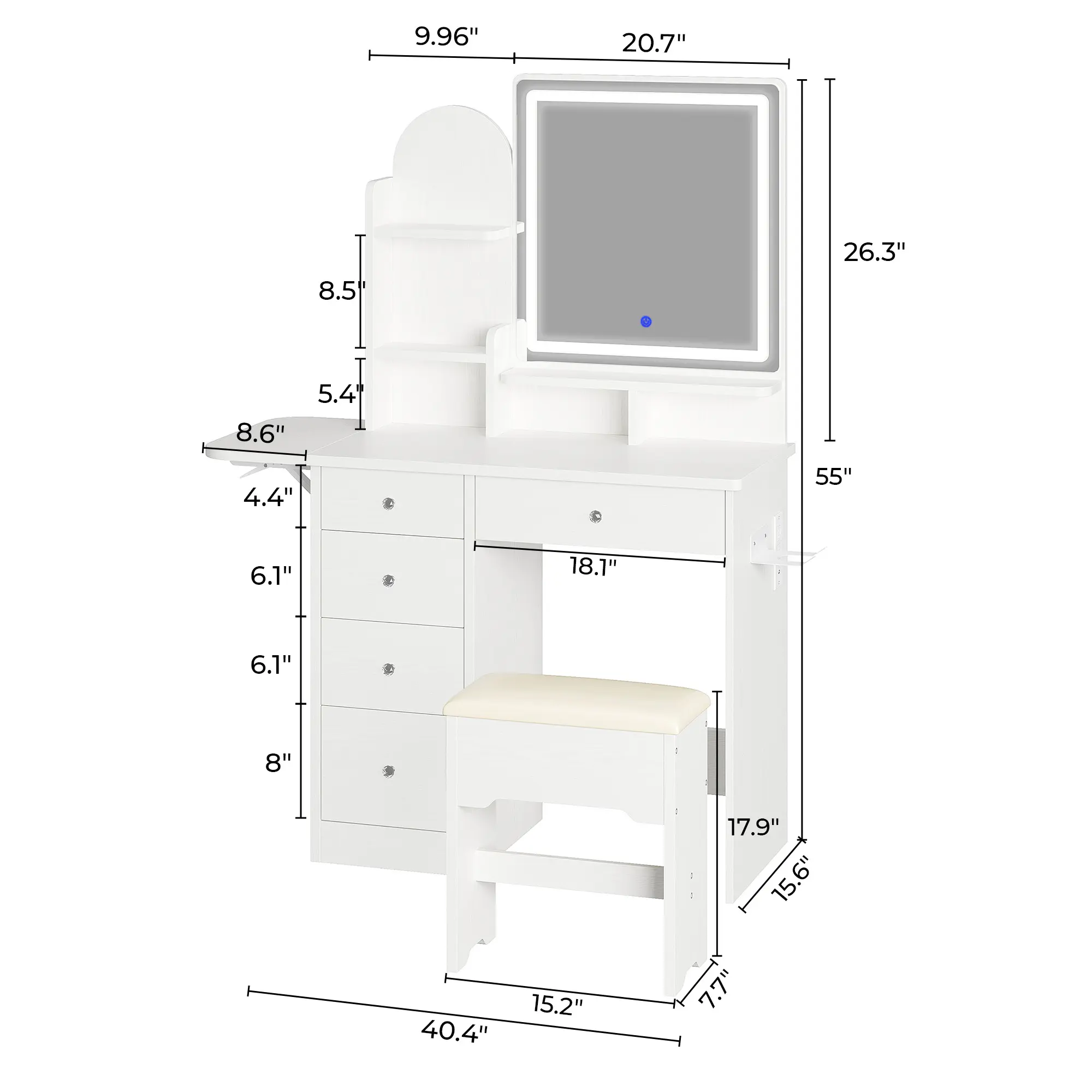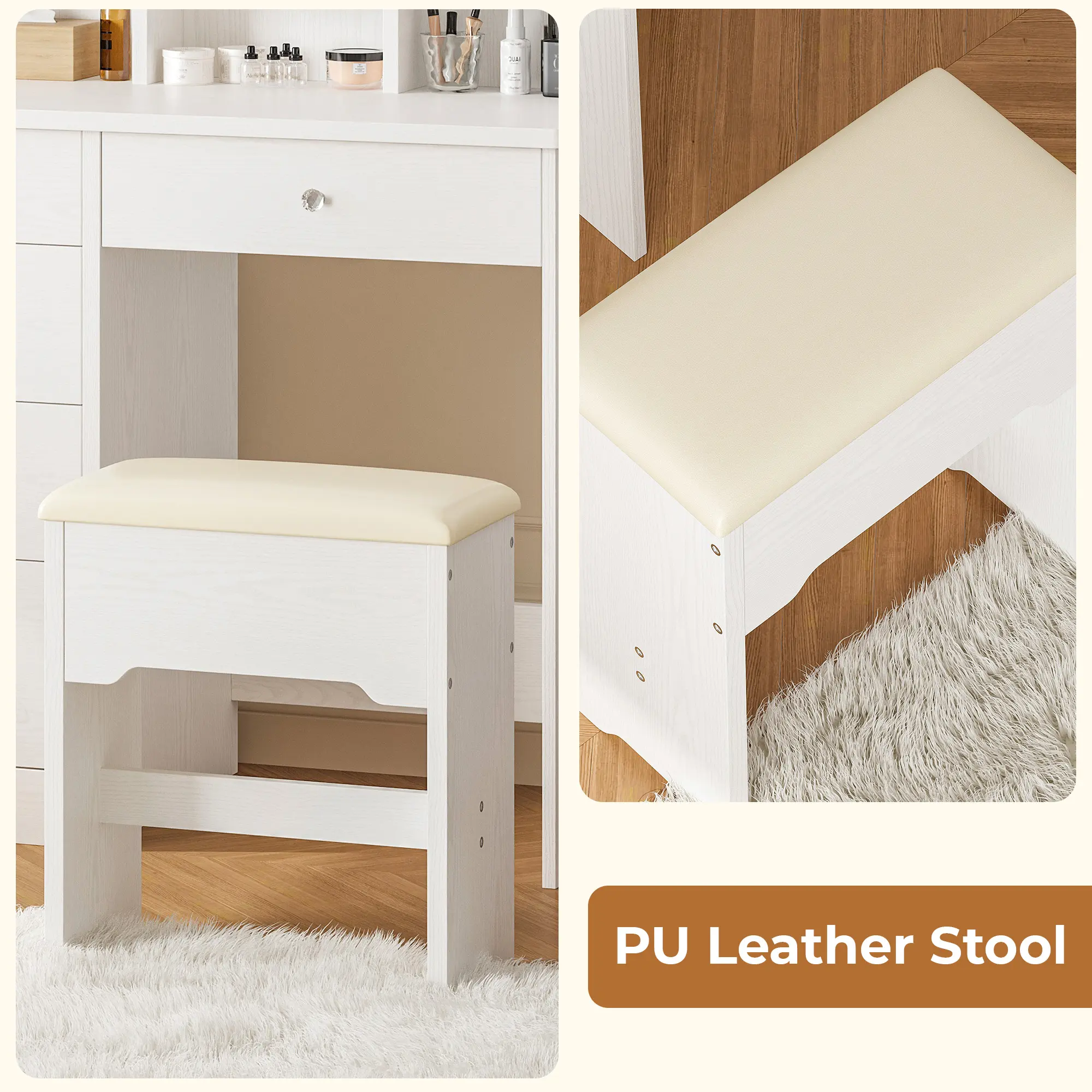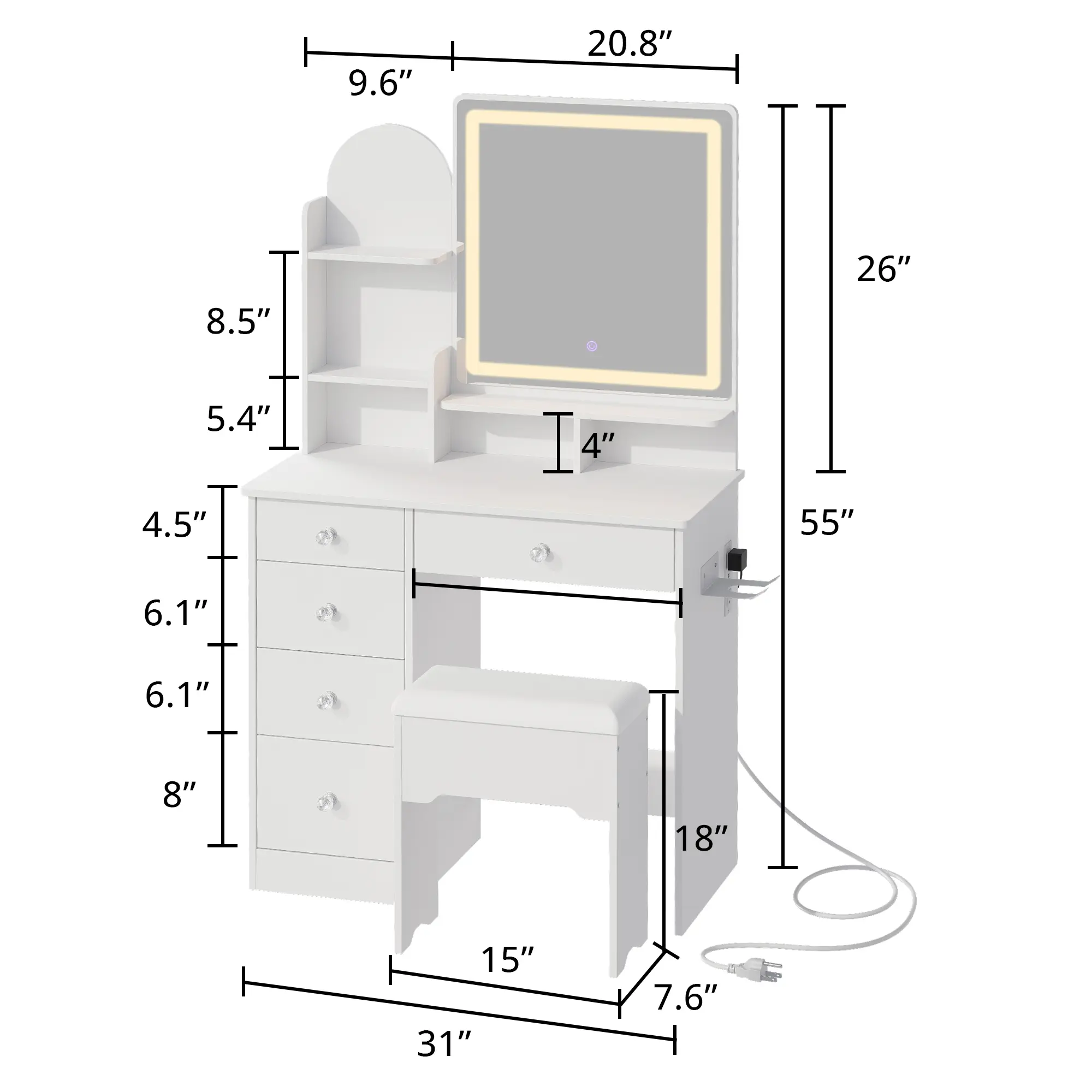 ·Compact Design, Ample Storage:Measuring 31"L x 15"W x 55"H, this vanity includes 5 spacious drawers, a storage stool, a roomy tabletop, and 5 open shelves. It offers plenty of storage for cosmetics, perfumes, makeup brushes, and more—perfect for smaller rooms. The space-saving design ensures it won't take up too much floor space.