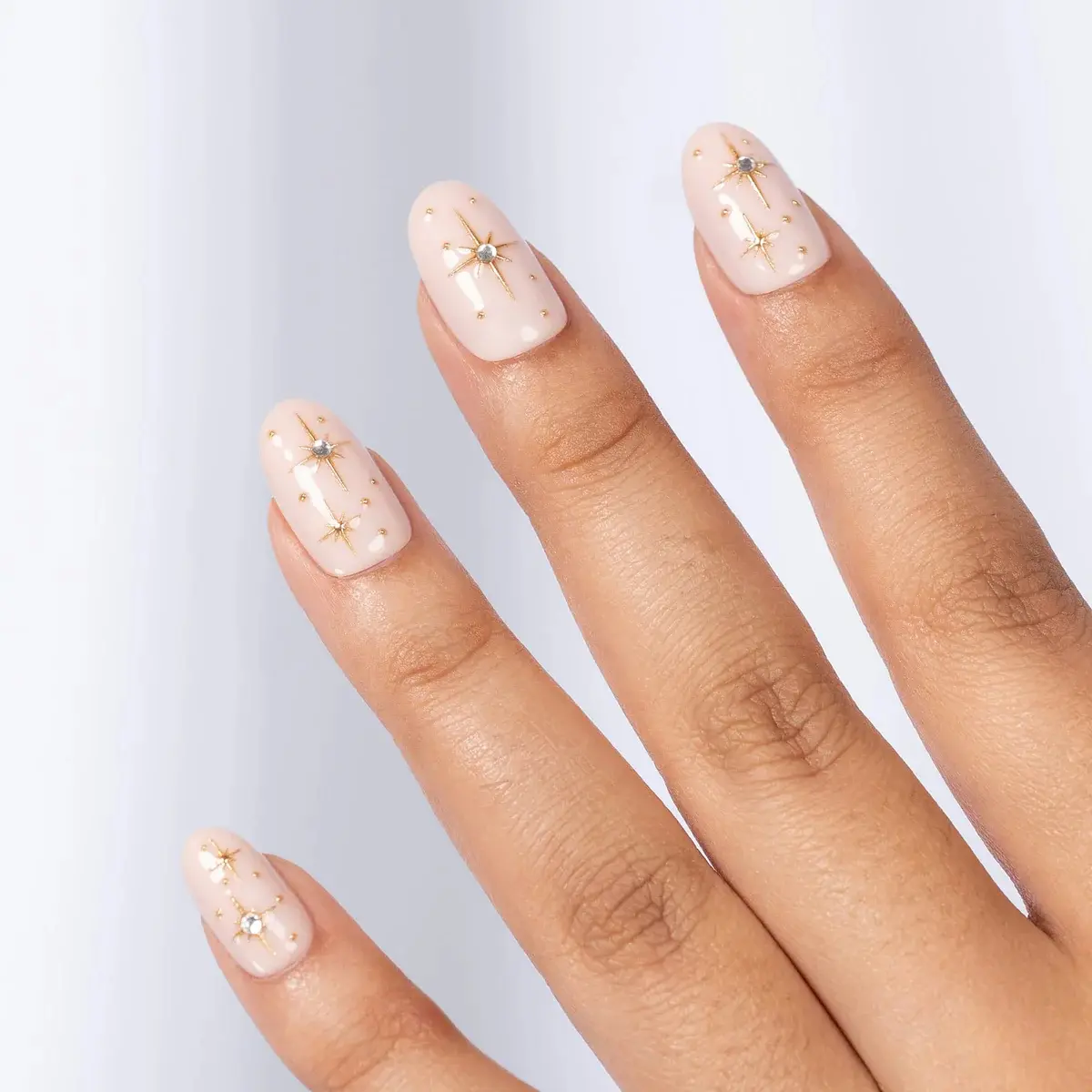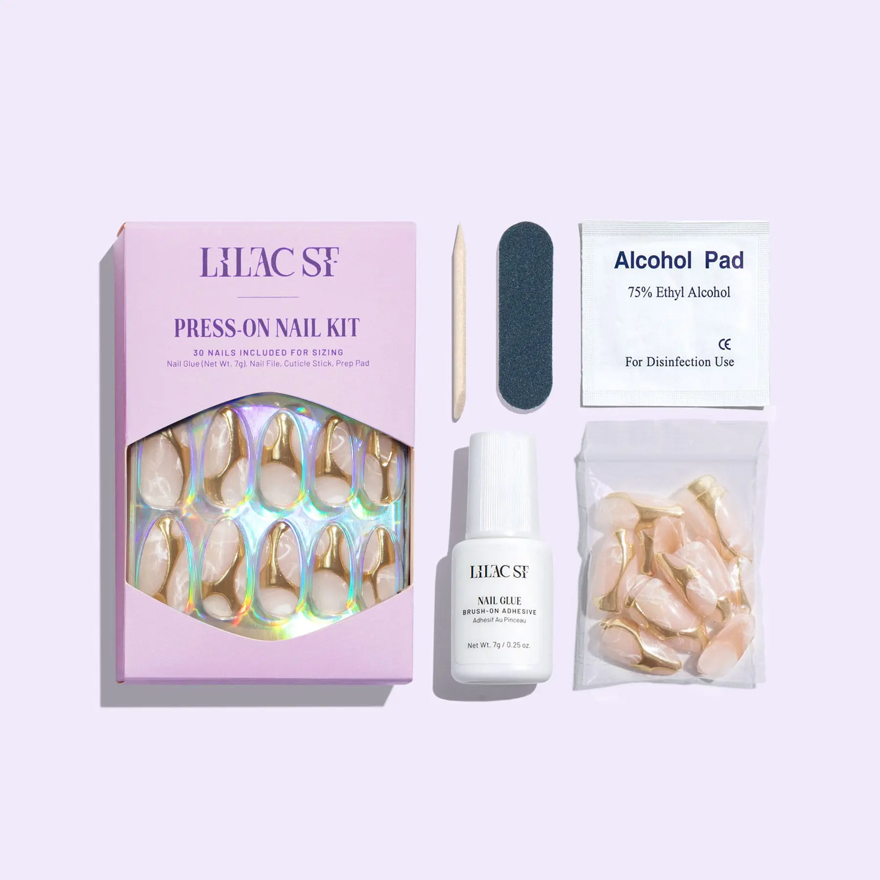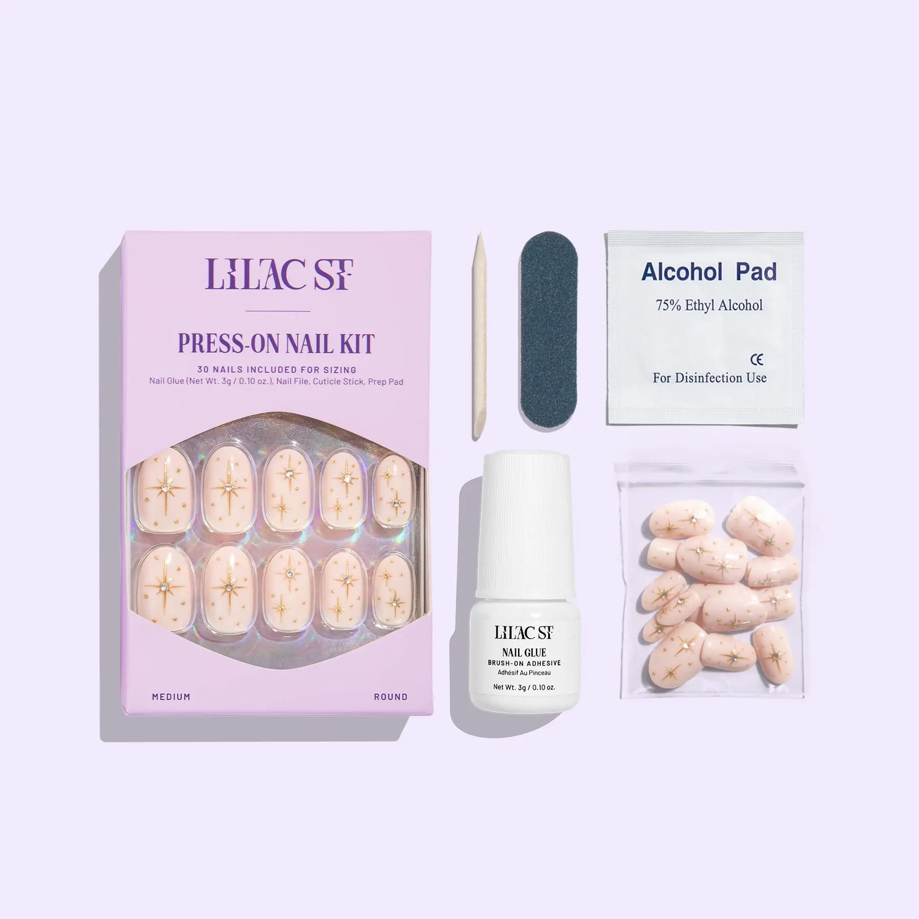Prep: Remove old polish, wash hands, and push back cuticles. Select press-on sizes. Buff natural nails and wipe them with the alcohol wipe.